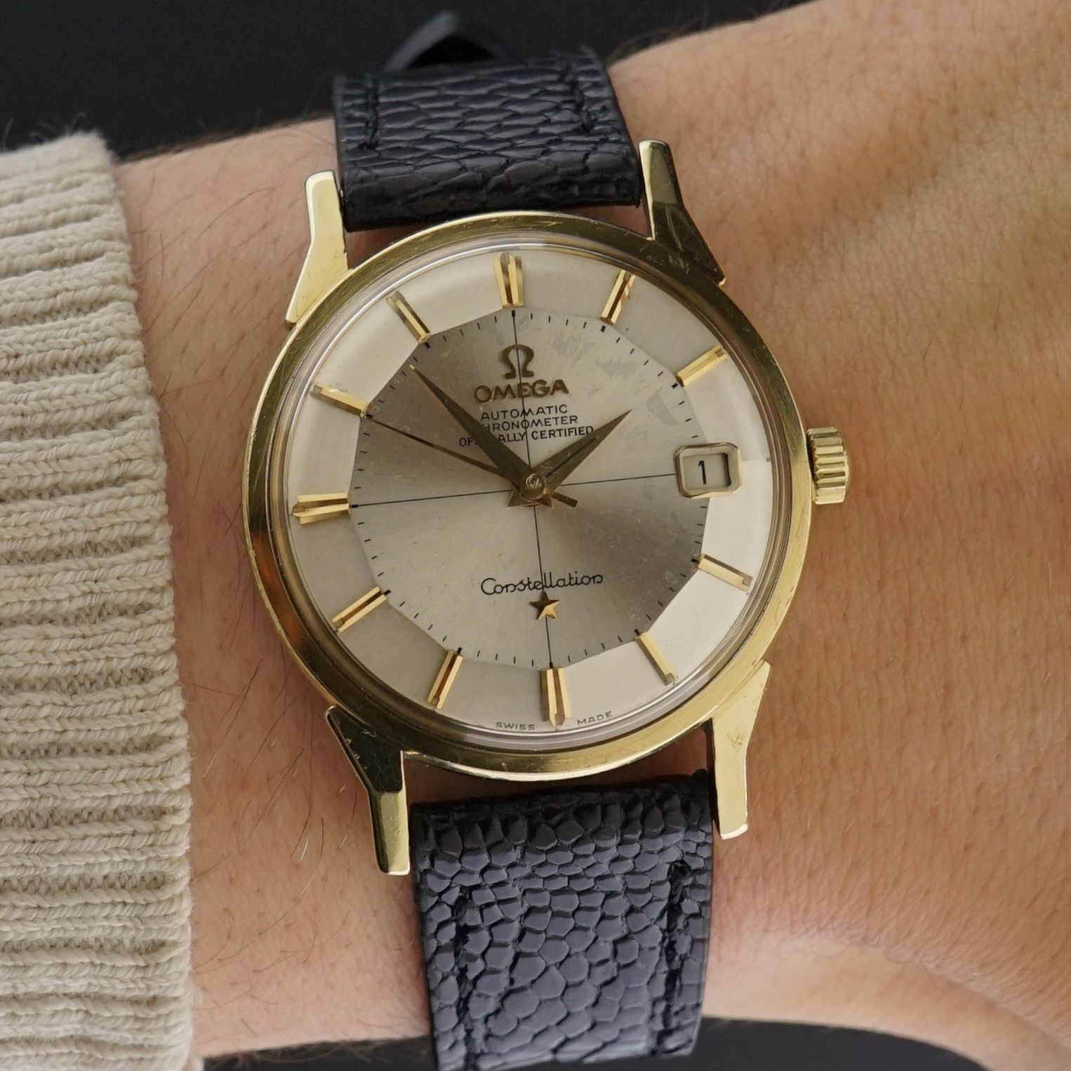 A Vintage Omega Constellation Chronometer, produced in 1962. This watch features the iconic dog leg case design and the well known pie pan dial, a configuration that is highly sought after for its elegant appearance. The dial shows a beautiful sunburst effect with light patina, mostly visible around the right side of the dial, adding authentic vintage character.