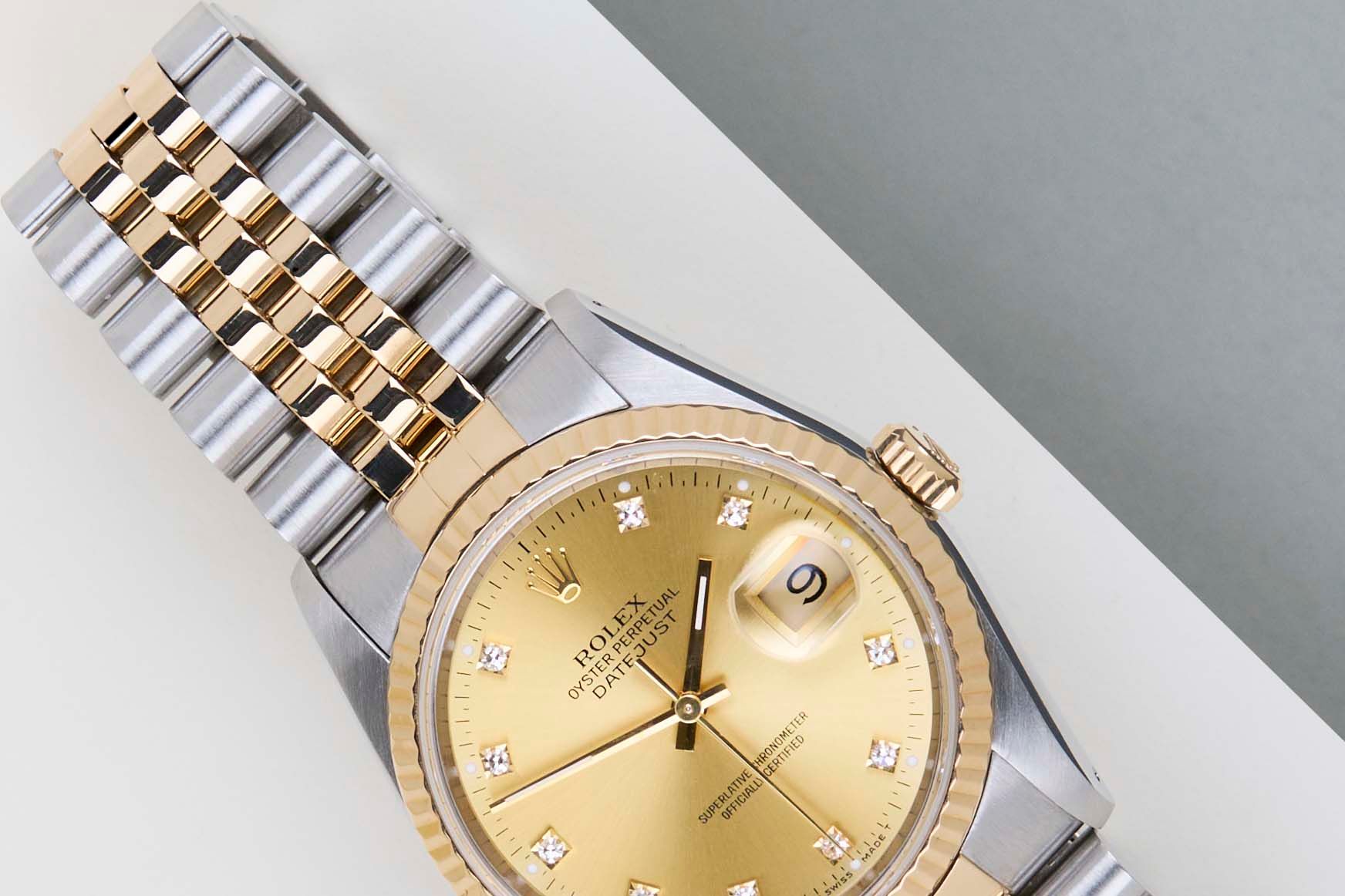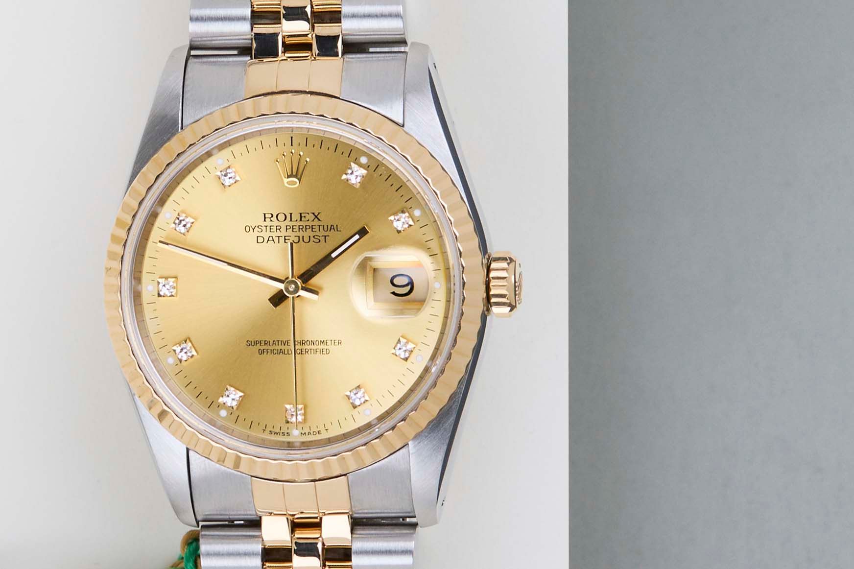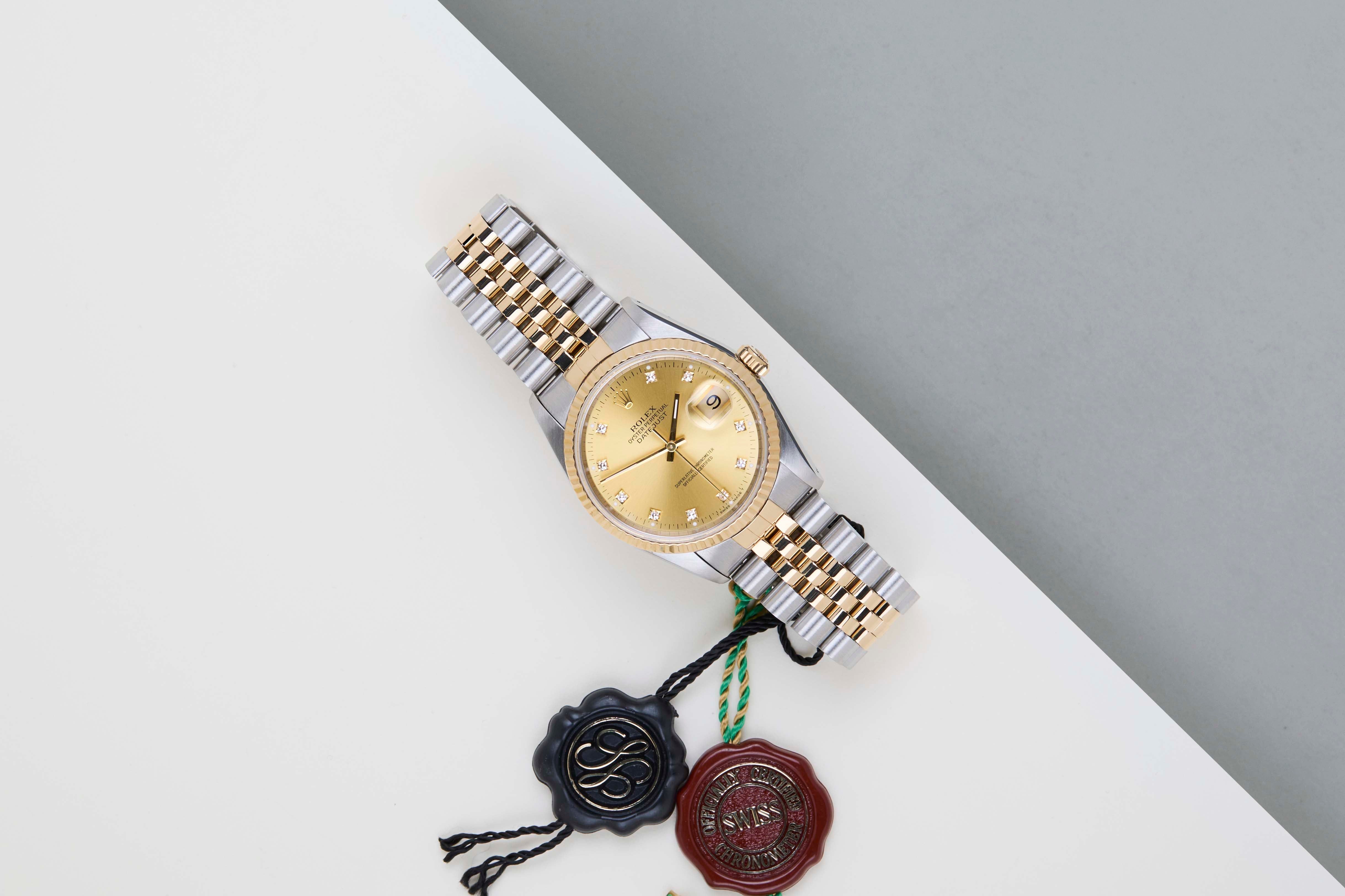 Full-Set | Including Original Service Papers (2006)Rolex introduced the original Datejust in 1945 to celebrate the company's 40th anniversary. Due to the various case sizes and materials, the Datejust has been ingrained in Rolex's history and remains incredibly popular for 75 years.The watch is made out of a combination of 18ct. Yellow Gold and stainless steel and is fitted with a Jubilee bracelet. This Datejust is fitted with a classic 'Champagne Diamond Dial'.This Rolex Datejust 36 is in mint condition and comes with the original Rolex Warranty Papers and Box. Furthermore, the watch has been serviced by Rolex in October 2006 and comes with One Year of Steiner Warranty.