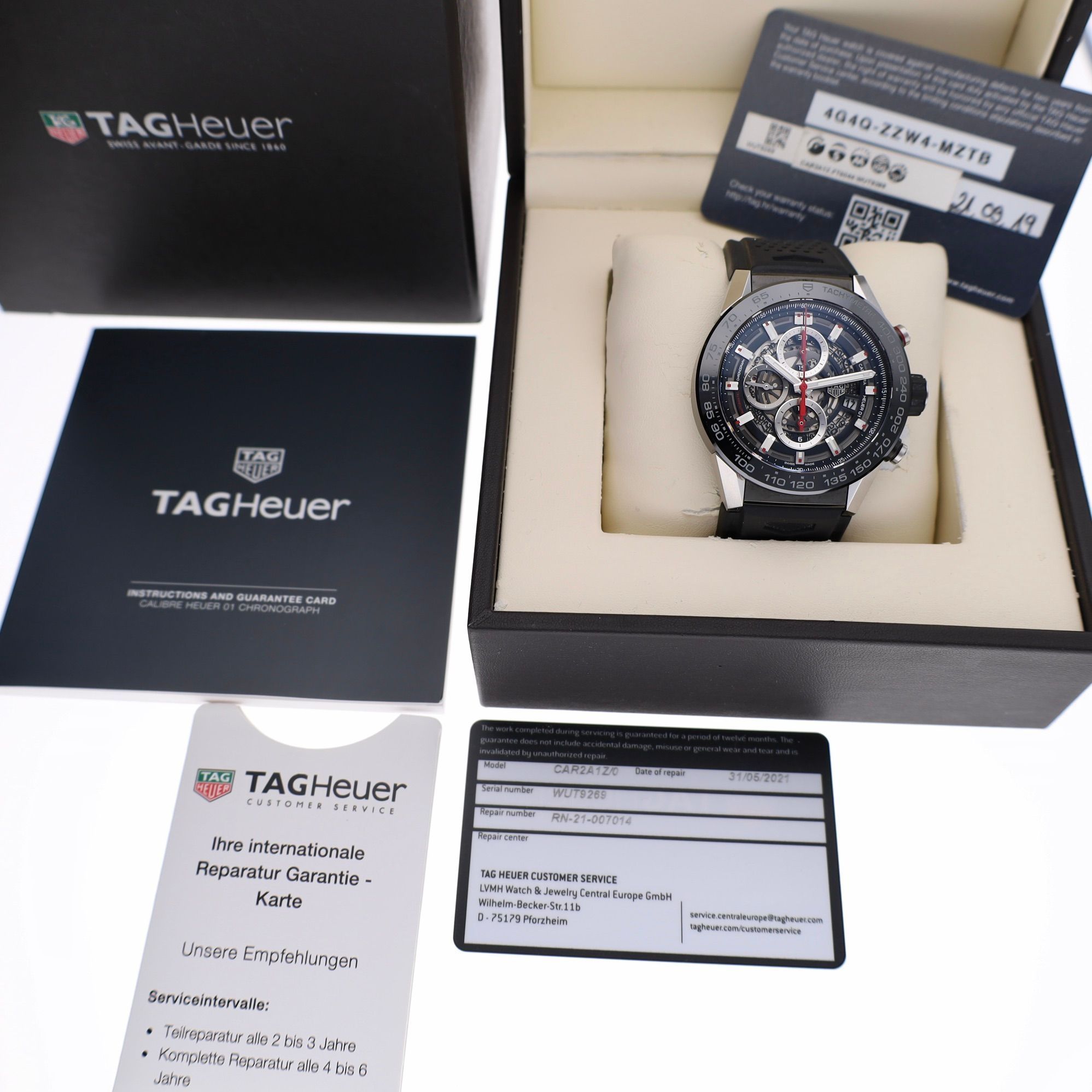 The TAG Heuer Carrera Heuer‑01 Ref. CAR2A1Z.FT6044 is a modern and sporty version of the iconic Carrera line from TAG Heuer. Since the 1960s, the Carrera has been known as one of the most important chronographs in the world of motorsport and mechanical watches. This model stands out with its robust 45mm case and distinctive skeleton dial, providing a fascinating view into the mechanical heart of the watch. The technical and modern design emphasizes the sporty identity of the Carrera collection. Inside, it houses the TAG Heuer Calibre Heuer 01, a high-quality in-house automatic chronograph movement. This movement is fully visible through the openworked dial and is known for its modern construction, reliability, and powerful presence. The watch runs excellently and very accurately. This watch was indeed serviced by TAG Heuer in 2021. This example from 2019 is in very good condition and has been carefully worn. Moreover, the watch has undergone a service in 2021, which enhances its technical condition. The watch is delivered as a complete full set, including: - Original TAG Heuer box - TAG Heuer warranty card - Service card from 2021 - Booklets - All extra accessories - Our warranty report with 1 year warranty A powerful and modern Carrera chronograph, where sporty design meets high-quality manufacturing techniques. An impressive watch for enthusiasts of modern mechanical chronographs.