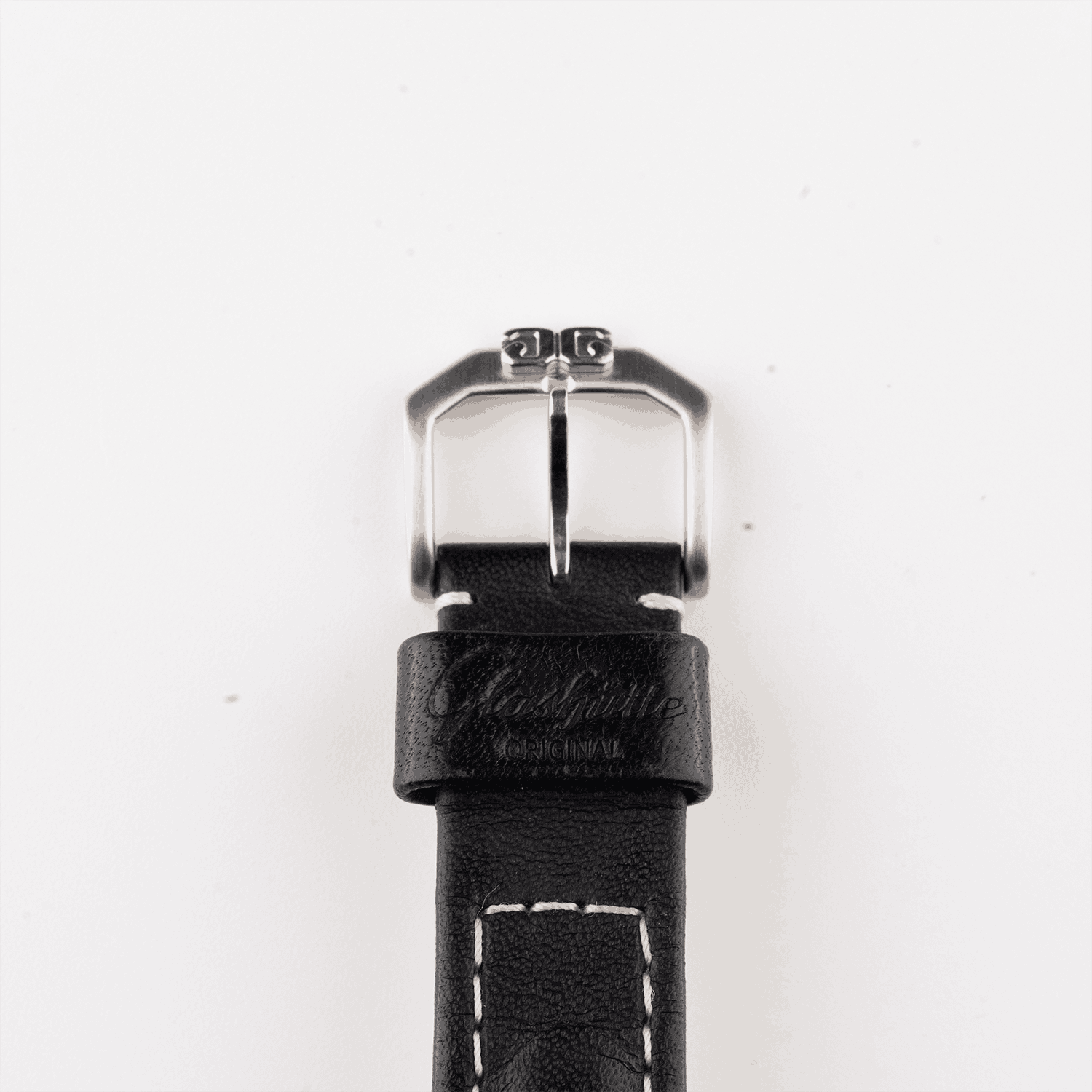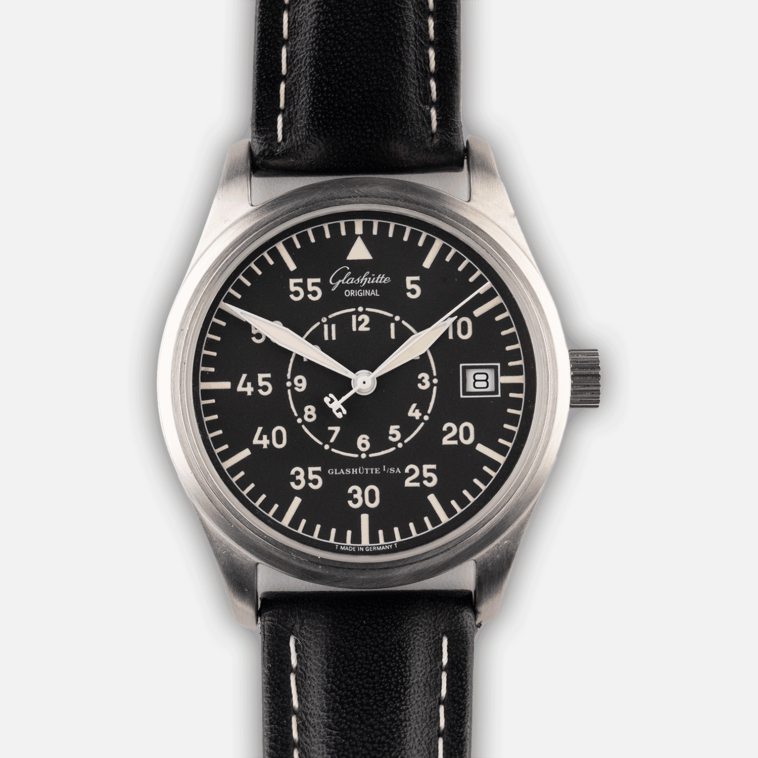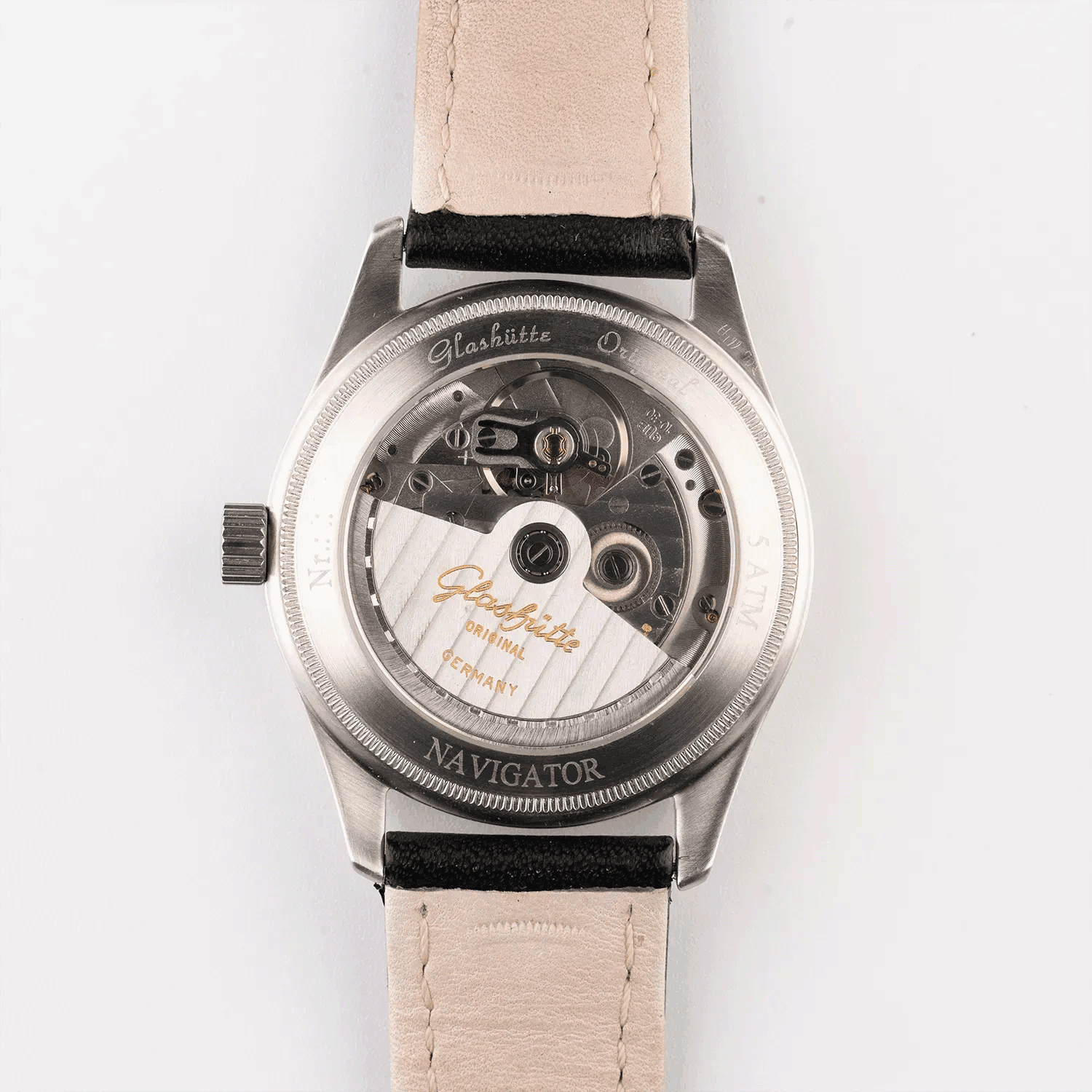 Eine Glashütte durch und durch: Schwarzes Lederband und schwarzes Ziffernblatt. Gepaart mit dem Glasboden kommt unsere Navigator nicht nur optisch als wirklicher Klassiker: Mit Erstkaufrechnung aus 1997 ein wahres Highlight für Sammler. Und damit diese Glashütte startbereit für alle kommenden Abenteuer ist, hat sie von uns noch einen frischen Service bekommen.