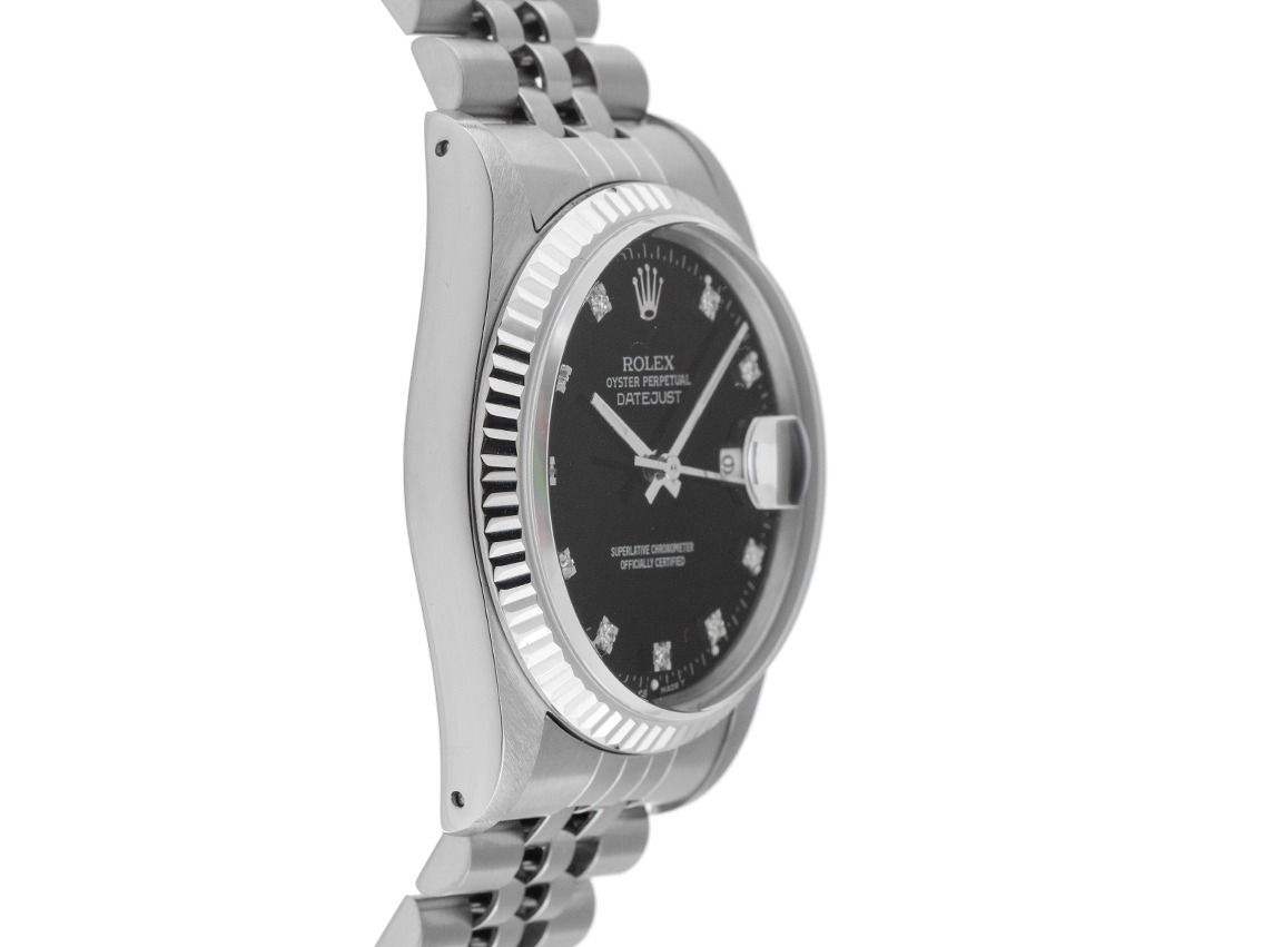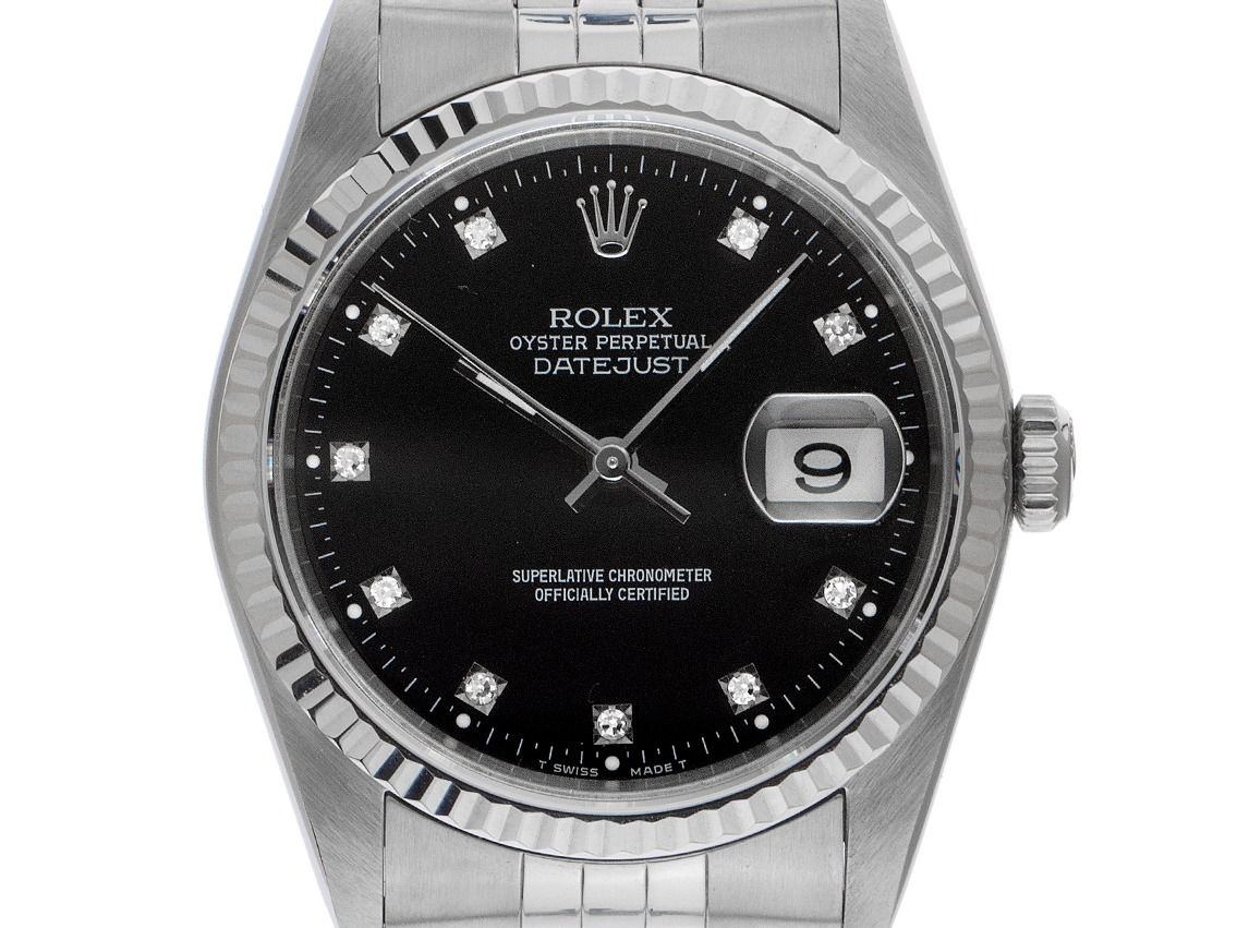 Gehäuse Edelstahl poliert und satiniert, Gehäusedurchmesser ohne Krone 36mm, Gehäusehöhe 11,8mm. Lünette 18kt Weißgold geriffelt und poliert. Armband Jubilé Edelstahl poliert und satiniert, Faltschließe Edelstahl mit Hersteller-Logo. Zifferblatt schwarz mit aufgesetzten in Weißgold gefassten Diamantindexen und weißgoldenen Zeigern. Uhrwerk Automatik, Chronometer mit Zeugnis, Rolex Manufakturkaliber 3135 mit 31 Edelsteinen. Anzeige von Stunde, Minute und Sekunde über Zeiger aus der Mitte mit Sekundenstopp zur sekundengenauen Einstellung der Uhrzeit, Datumsanzeige mit Schnellverstellung unter Glaslupe bei 3 Uhr. Saphirglas kratzfest. Krone verschraubbar mit Hersteller-Logo. Boden Edelstahl verschraubt. Gewicht der Uhr inklusive Armband 91g, Länge des Armbandes inklusive Gehäuse 175mm. Referenznummer: 16234, Gehäusenummer: R874XXX, Baujahr: 1987, ID: KA1823149140326H-11500, Artikelnummer: 10000085102. Mit Gangkontrolle und kompletter äußerlicher Aufarbeitung von März 2026. Original Rolex Box und Garantie Papiere von Juni 1989, LC 430 / Singapur sowie Beschreibung, Ledermäppchen, Übersetzungsheft, Rolex Chronometer-Siegel und Watchregister Auszug von März 2026, The Watch Register Zertifikat / ohne Eintrag (Internationale Datenbank für verlorene oder gestohlene Uhren), Full Set. Kapitalanlage mit Wertsteigerungspotential, extrem seltenes Sammlerstück, fast nicht getragen. Sehr guter Zustand. Lieferzeit sofort.
