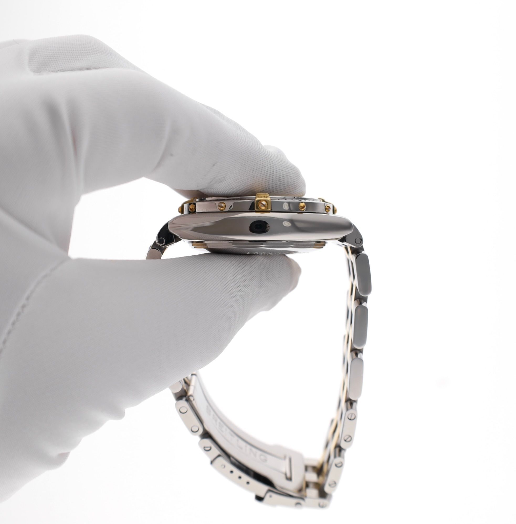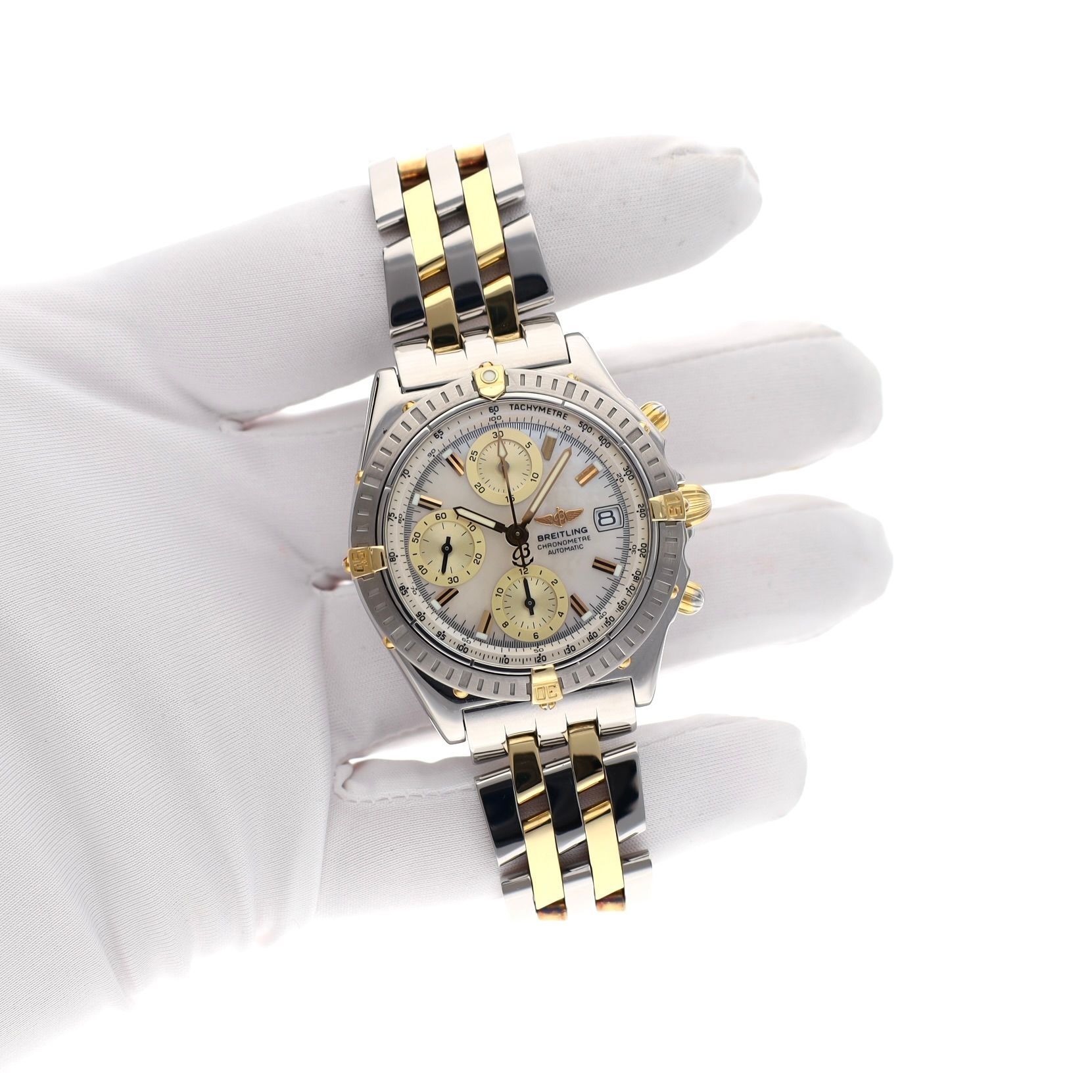 The Breitling Chronomat B13352 is one of the most recognizable models from the Breitling collection. The Chronomat was developed as a professional pilot's watch and has grown to become one of the brand's most significant pillars. This example stands out immediately due to its elegant bicolor execution in steel and 18k yellow gold, and the unique mother-of-pearl dial. The natural gloss of mother-of-pearl gives each watch a unique appearance and forms a beautiful combination with the sporty chronograph layout of the Chronomat. The case has a classic diameter of 40mm, a size that perfectly fits the traditional proportions of the Chronomat. The distinctive 18k gold rider-tabs on the bezel and the robust pilot style make the watch instantly recognizable as a true Breitling. The gold/steel Breitling pilot band is also in very good condition and fits wrists up to approximately 19cm. Inside, the reliable Breitling Caliber B13 powers the watch, an automatic chronograph movement with chronometer certification. This movement is known for its precision and robustness. This specific watch has also received a new full service in 2026, emphasizing its technical condition and reliability. This watch from 2004 is in very good condition and is delivered as a complete full set, consisting of: - Original Breitling box - Breitling warranty papers - Chronometer certificate - Service invoice (2026) - Breitling booklets - Our warranty report with 1-year guarantee A striking and elegant Chronomat that combines sporty Breitling technology with luxury details such as a mother-of-pearl dial and bicolor finish. A remarkable piece for aficionados of classic Breitling chronographs.