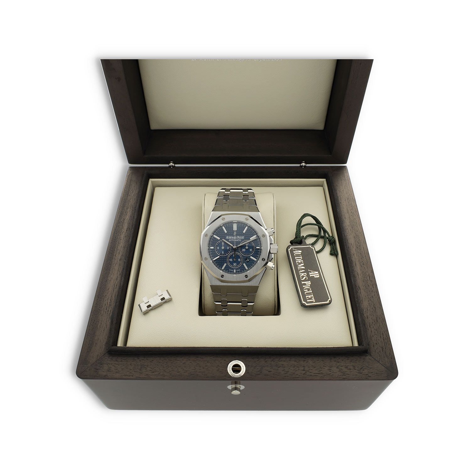 Powered by the automatic Audemars Piguet caliber 2385, this Royal Oak Chronograph delivers precise timekeeping and a power reserve of approximately 40 hours.