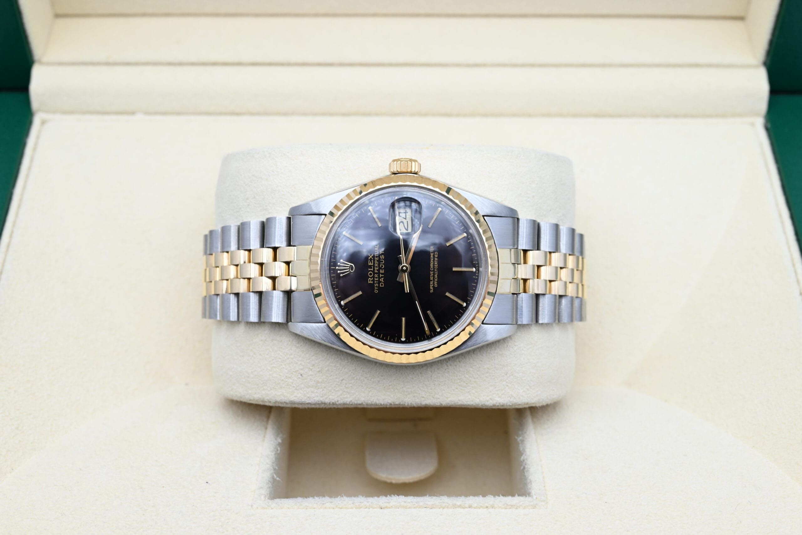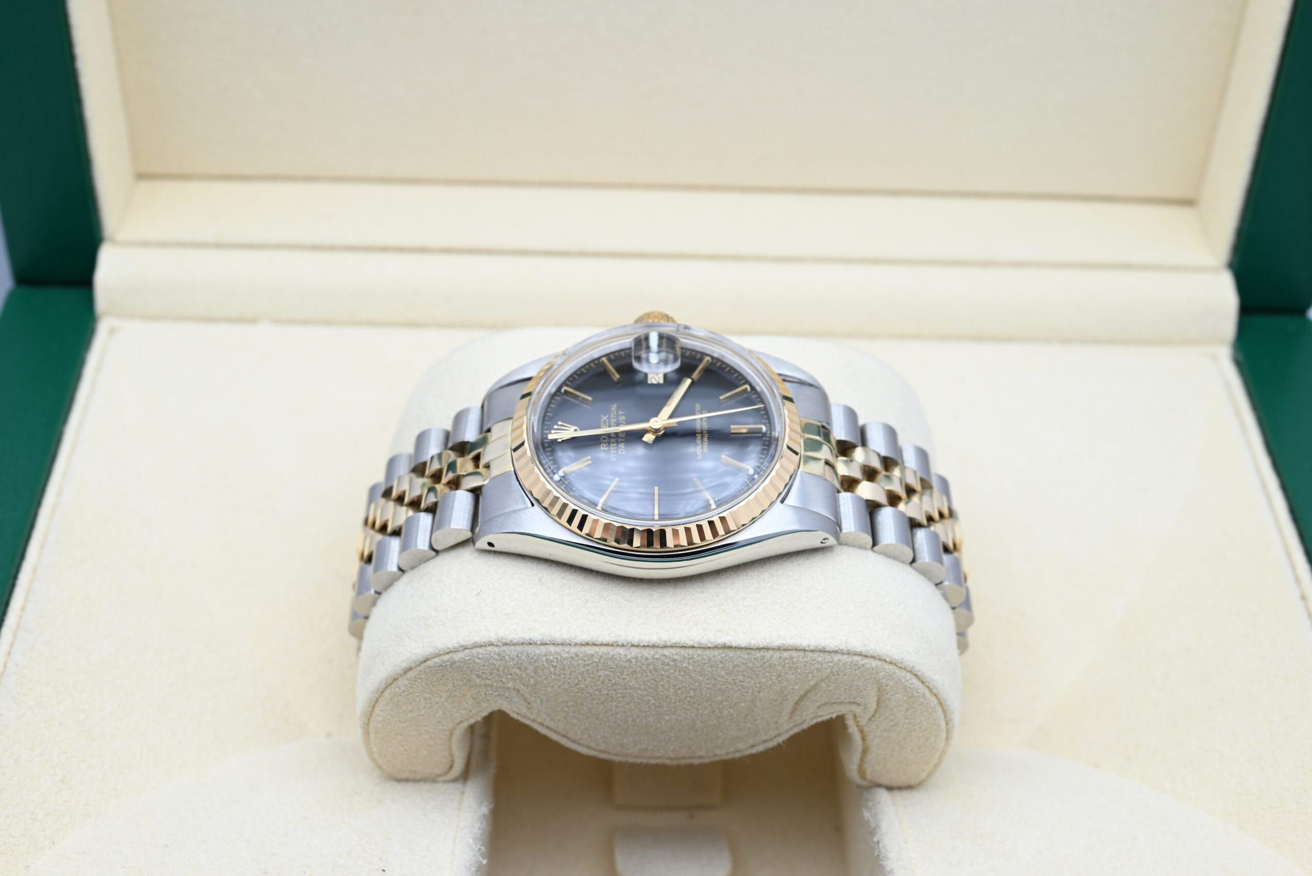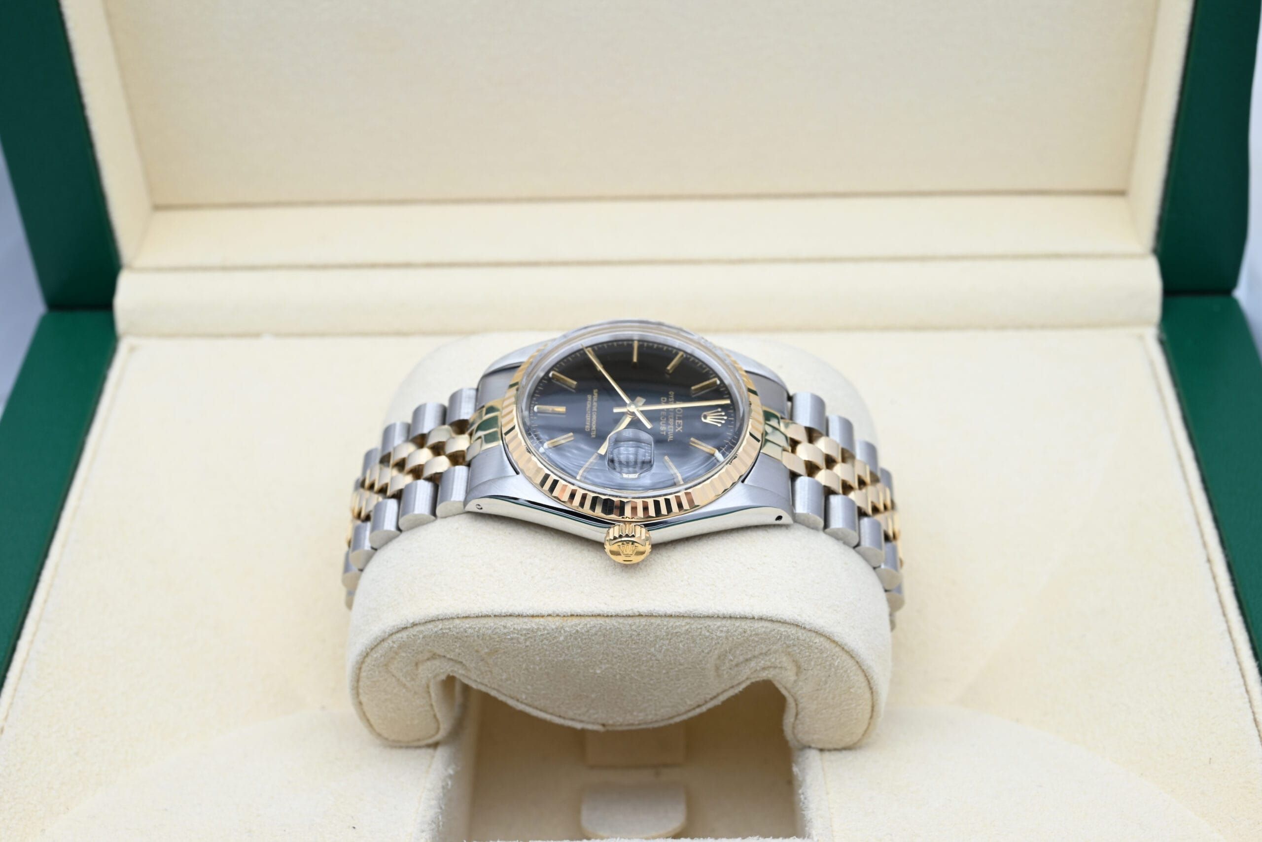 Rolex Datejust 16013 from 1979 with the black dial in excellent condition, including the original box and papers.All of our watches have been thoroughly checked by our own watchmaker and serviced when needed.