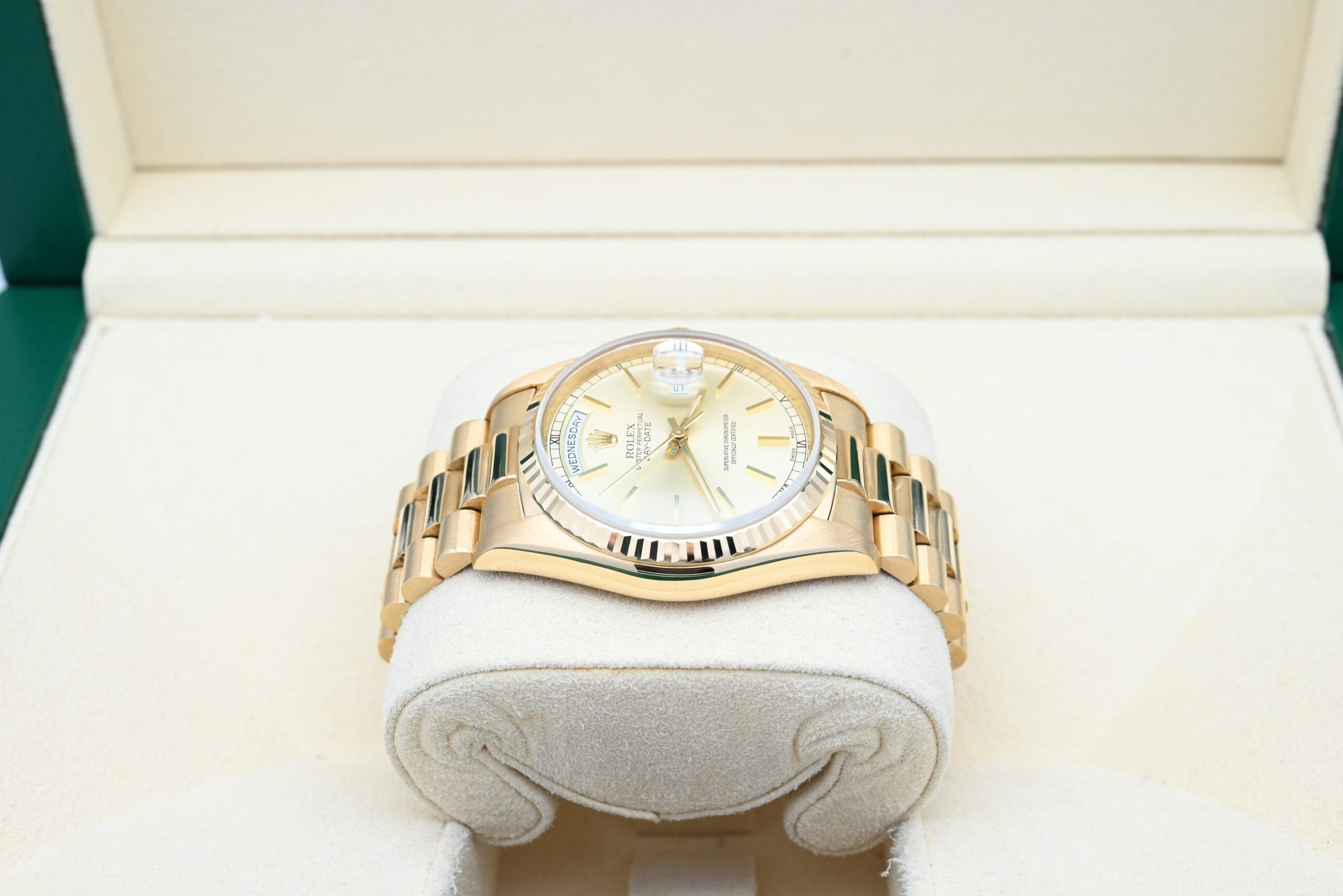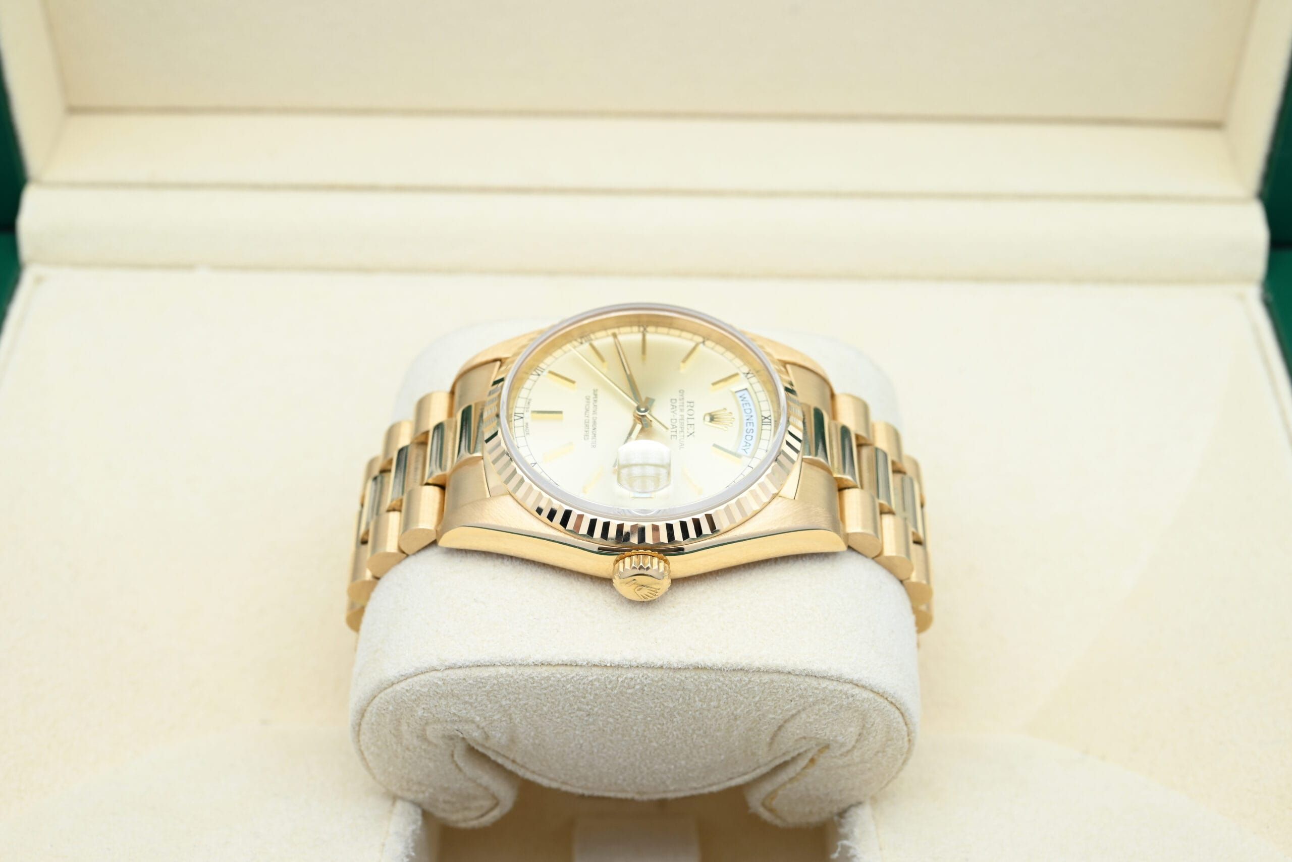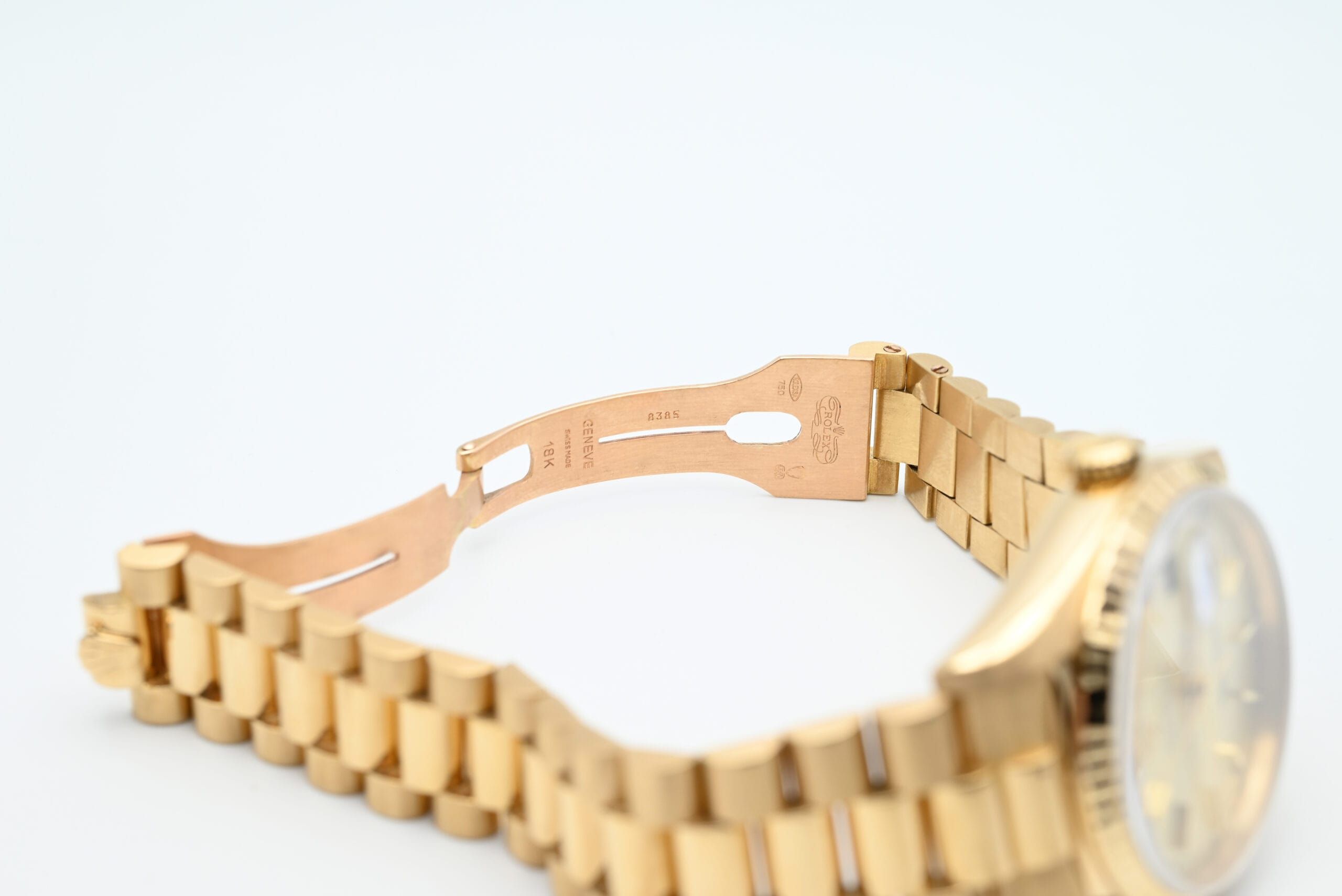 Rolex Day-Date 18238 from 1989 with the champagne dial in excellent condition, including the original box and papers.All of our watches have been thoroughly checked by our own watchmaker and serviced when needed.
