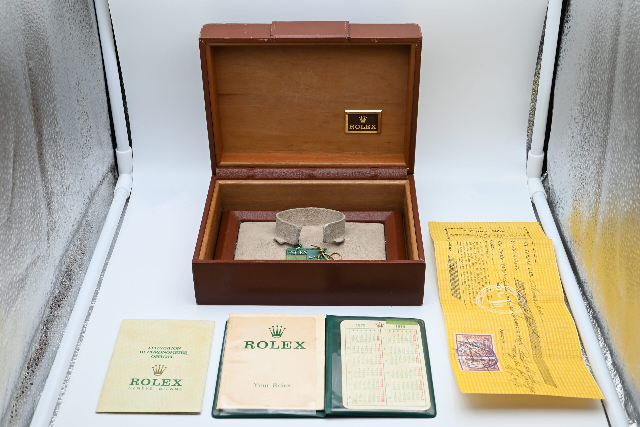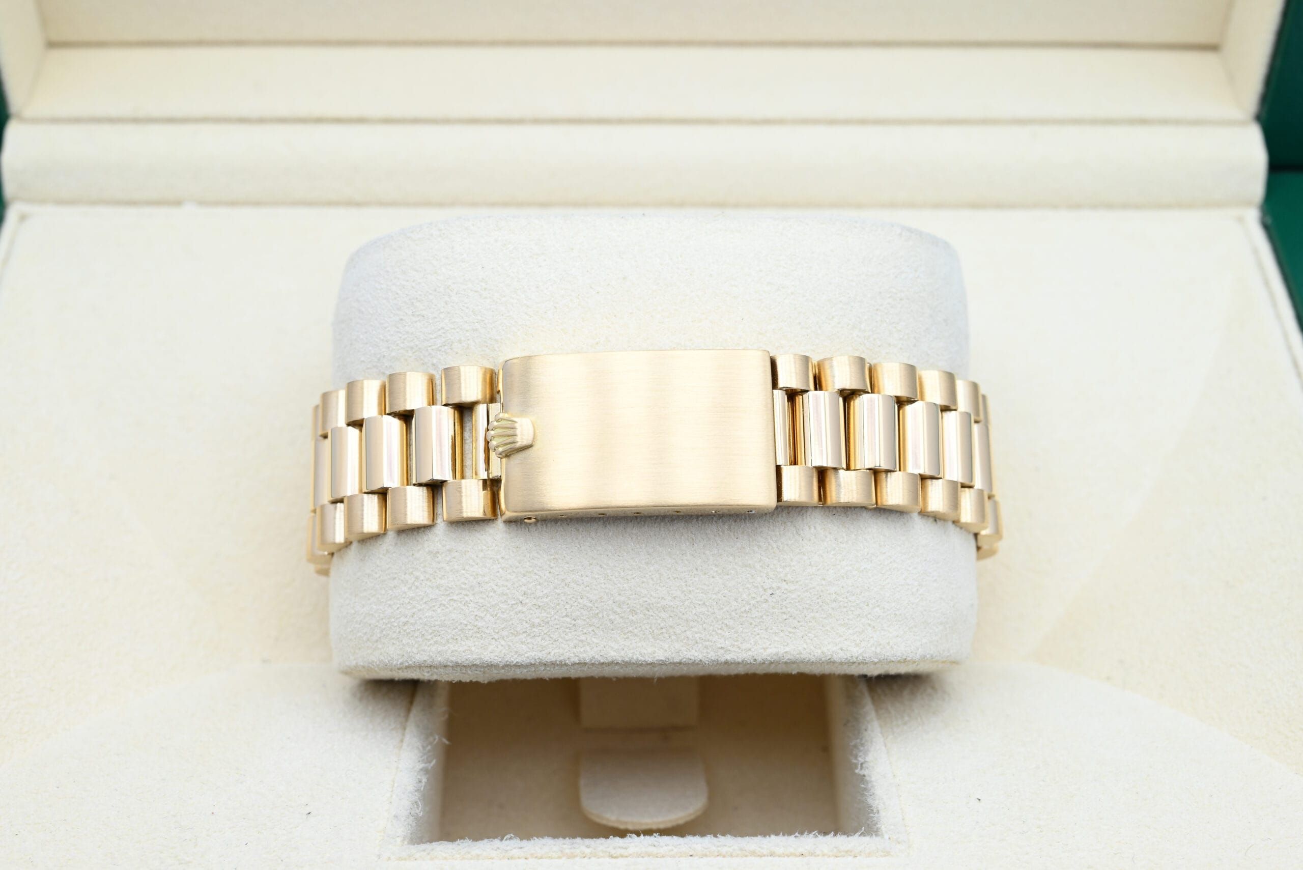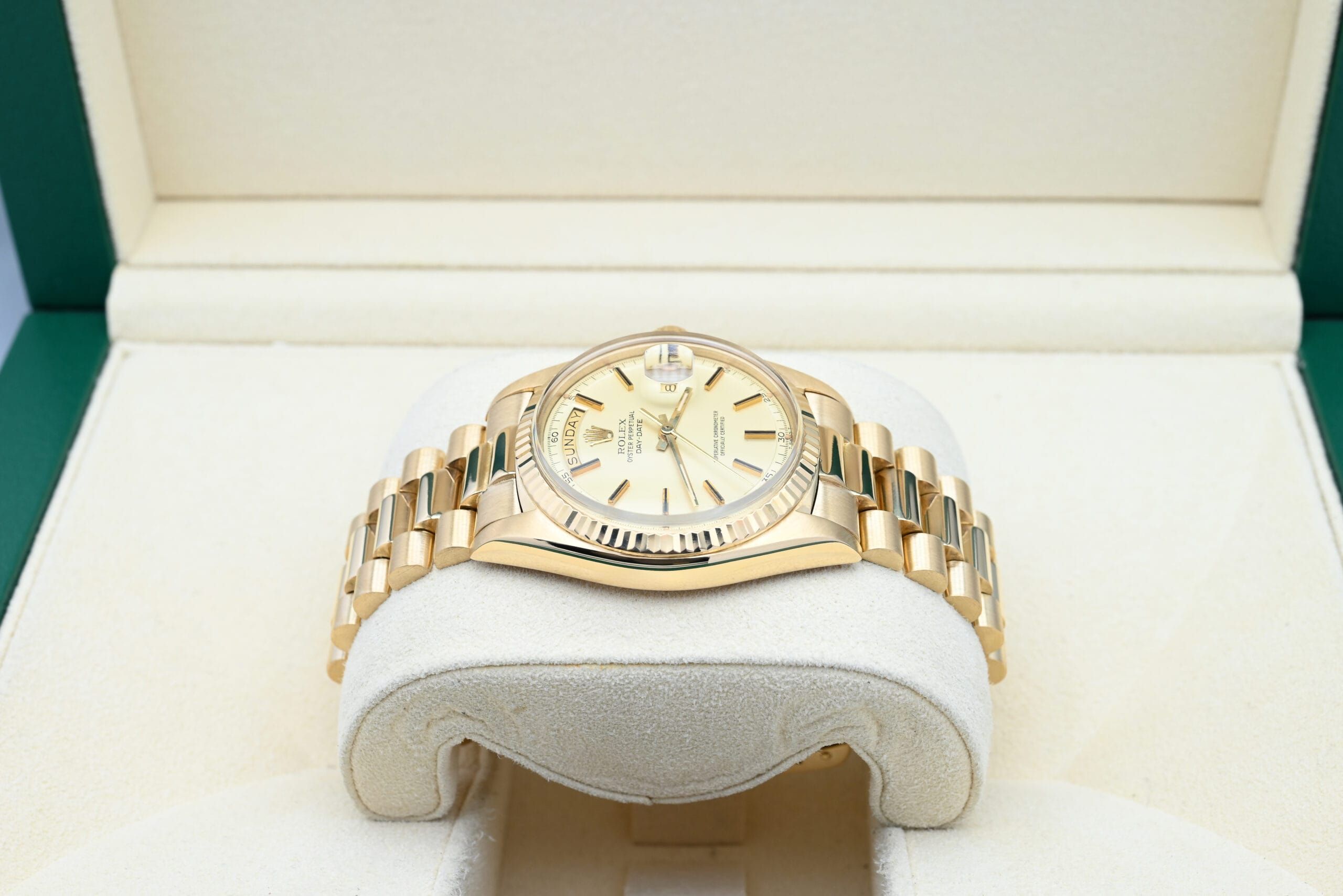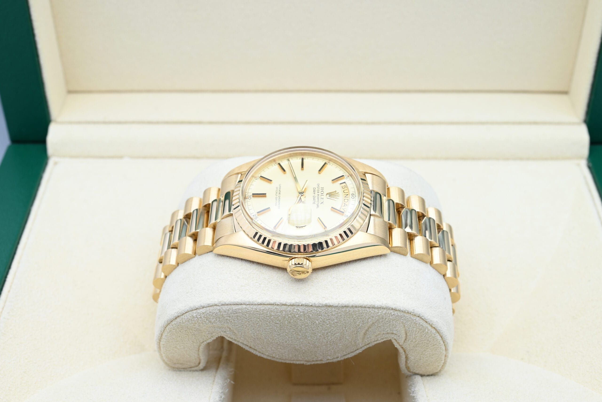 Rolex Day-Date Ref. 1803 from 1974 with the champagne dial in excellent condition, including the original box and papers.All of our watches have been thoroughly checked by our own watchmaker and serviced when needed.