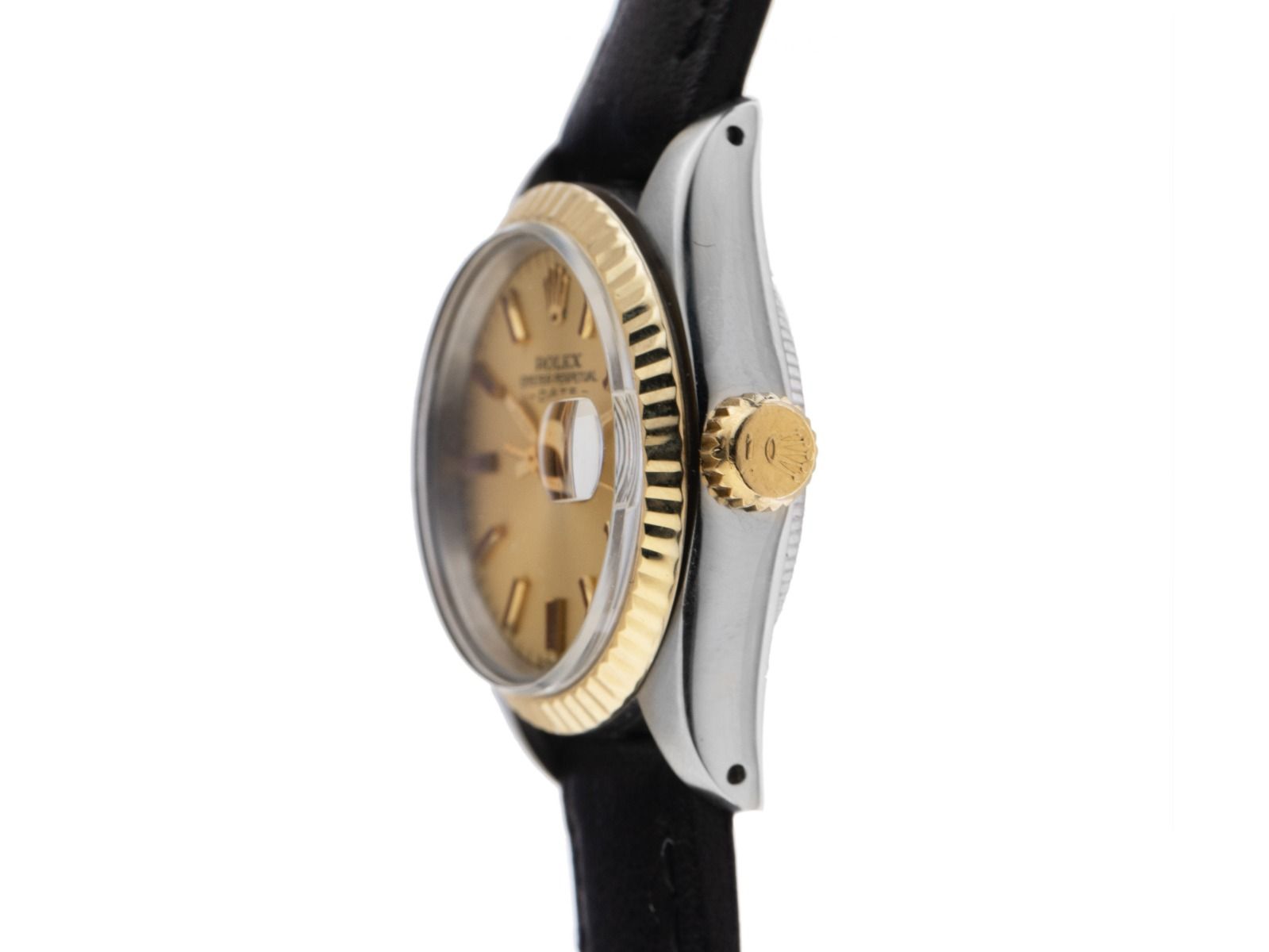 Gehäuse Edelstahl poliert und satiniert, Gehäusedurchmesser ohne Krone 26mm, Gehäusehöhe 11,2mm. Lünette 18kt Gelbgold geriffelt und poliert. Armband Leder, Anstoßbreite 13mm, Stiftschließe Edelstahl vergoldet mit Hersteller-Logo. Zifferblatt champagnerfarben mit aufgesetzten gelbgoldenen Indexen und gelbgoldenen Zeigern. Uhrwerk Automatik, Rolex Manufakturkaliber 2030 mit 28 Edelsteinen. Anzeige von Stunde, Minute und Sekunde über Zeiger aus der Mitte mit Sekundenstopp zur sekundengenauen Einstellung der Uhrzeit, Datumsanzeige unter Glaslupe bei 3 Uhr, open 6/9 (offene 6 und 9 in der Datumsanzeige). Plexiglas. Krone verschraubbar mit Hersteller-Logo. Boden Edelstahl verschraubt. Gewicht der Uhr inklusive Armband 29g. Referenznummer: 6917, Baujahr: 1975, Gehäusenummer: 4040XXX, ID: KS167150001025H-5500, Artikelnummer: 10000082879. Mit Gangkontrolle und kompletter äußerlicher Aufarbeitung von November 2025. Original Rolex Box mit Umkarton sowie Beschreibung, Übersetzungsheft, Ledermäppchen, Rolex Chronometer-Siegel. Kapitalanlage mit Wertsteigerungspotential. Sehr guter Zustand. Lieferzeit sofort.