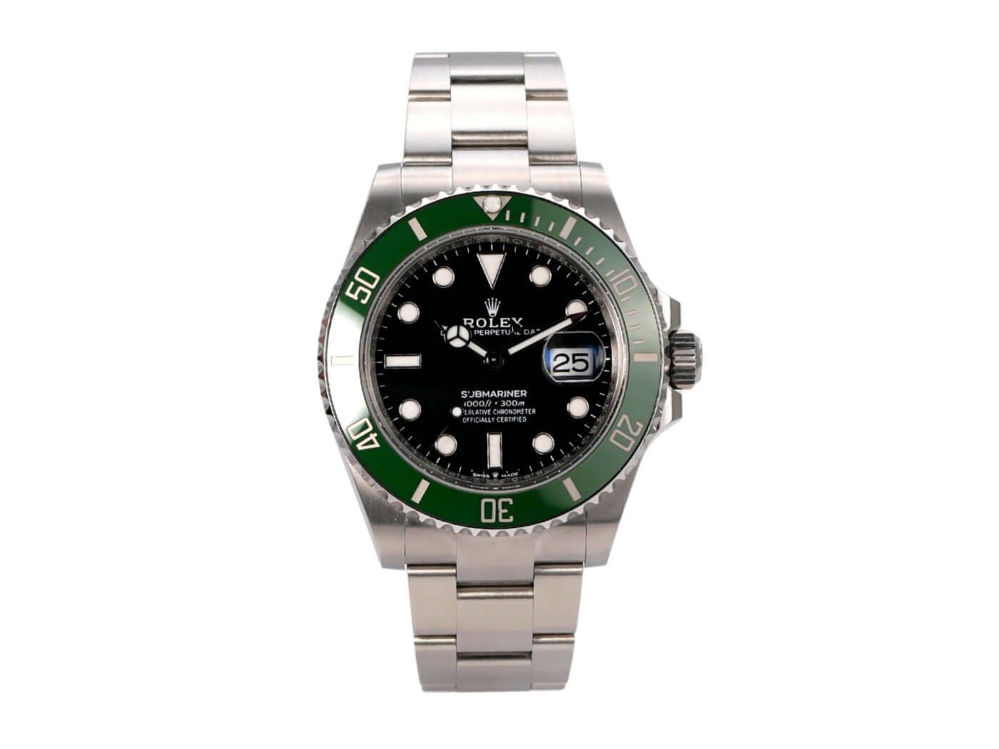 Case made of polished and satin-finished stainless steel, case diameter 41 mm, case height 12.5 mm, stainless steel bezel with green ceramic insert, 60-minute scale and luminous dot, rotatable, Oyster stainless steel bracelet polished and satin-finished with safety folding clasp, black dial with applied luminous indices and luminous dots, luminous hands, automatic movement, Rolex caliber 3235 with 31 jewels, 28,800 vibrations per hour, 70-hour power reserve, date display with quick adjustment and magnifier, chronometer, sapphire crystal, screw-down crown with crown guards, screw-down stainless steel case back, water-resistant up to 30 bar.