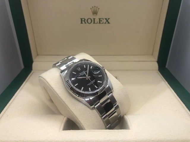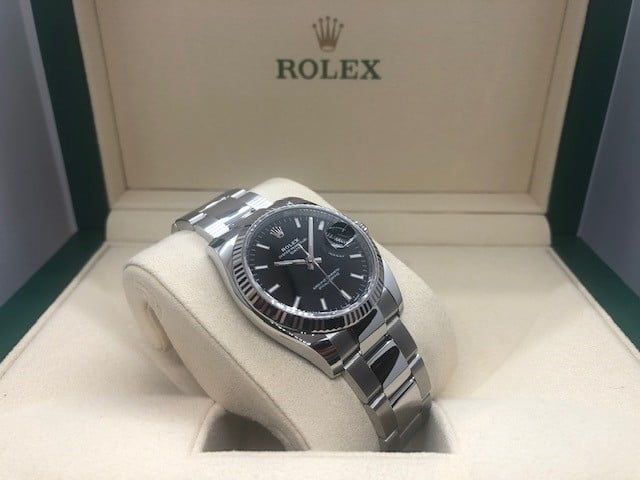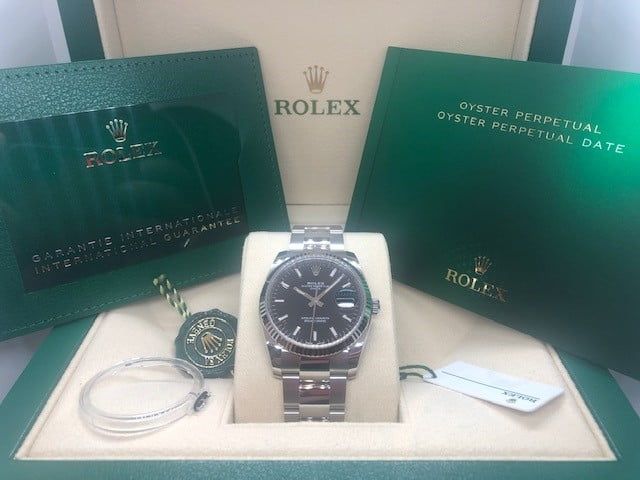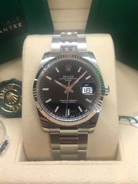Rolex Date 34mm 115234 – Black Dial Oyster – 18KT Bezel – NEW 2021. Beautiful black dial in a 34 mm steel case with white gold bezel. Our watches are checked by our watchmaker and will be delivered with warranty from our store.