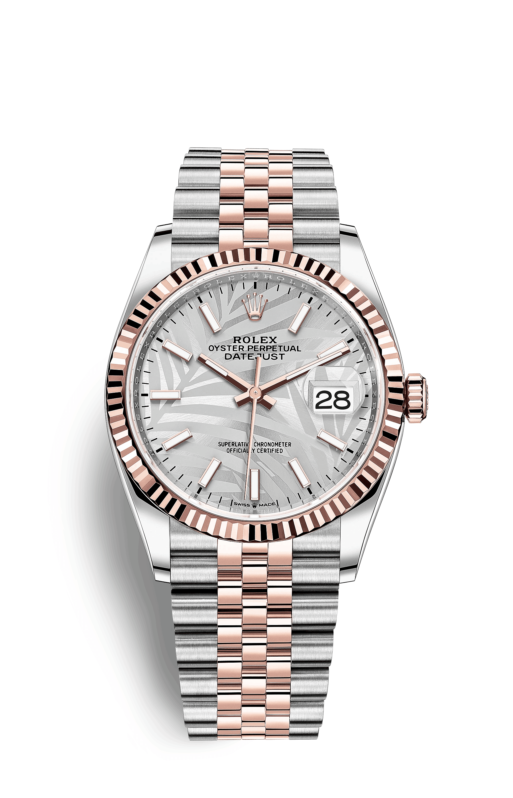 Rolex Datejust 126231 Palm Dial Jubilee 36 MM – NEW 2022. Beautiful silver dial in a 36 mm gold/steel case with rose gold bezel. Our watches are checked by our watchmaker and will be delivered with one year Steiner warranty from our store.