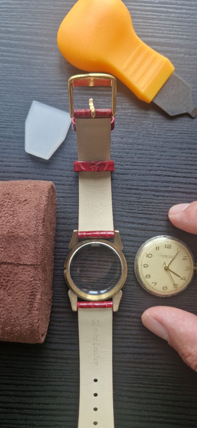 Material da caixa: latão, banhado a ouro, latão aparente