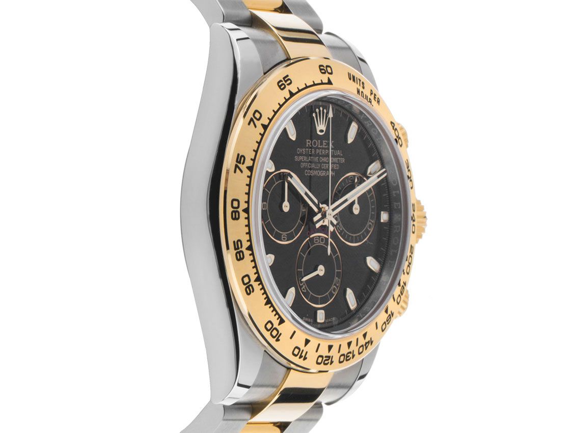 Gehäuse Edelstahl poliert und satiniert, Gehäusedurchmesser ohne Krone 40mm, Gehäusehöhe 12,3mm. Lünette 18kt Gelbgold poliert und graviert mit Tachymeterskala. Armband Oyster Edelstahl / 18kt Gelbgold poliert und satiniert, Rolex Sicherheitsfaltschließe Edelstahl / 18kt Gelbgold mit Hersteller-Logo. Zifferblatt schwarz mit in Gelbgold gefassten Indexen und gelbgoldenen Zeigern, Hilfszifferblätter Gelbgold umrandet. Uhrwerk Automatik, Chronograph, Chronometer mit Zeugnis, Rolex Manufakturkaliber 4130 mit 44 Edelsteinen. Anzeige von Stunde und Minute über Zeiger aus der Mitte, kleine Sekunde mit Sekundenstopp zur sekundengenauen Einstellung der Uhrzeit bei 6 Uhr. Saphirglas kratzfest. Krone verschraubbar mit Flankenschutz und Hersteller-Logo, Chronographen Drücker verschraubbar. Boden Edelstahl verschraubt. Gewicht der Uhr inklusive Armband 152g, Länge des Armbandes inklusive Gehäuse 170mm. Referenznummer: 116503, Gehäusenummer: 1R282XXX, ID: P2743358000326H-23700, Artikelnummer: 10000085283. Mit Gangkontrolle und kompletter äußerlicher Aufarbeitung von März 2026. Original Rolex Box mit Umkarton und Garantie Papiere von Juni 2021, neue Rolex Garantie Karte ohne Ländercode sowie Beschreibung, Ledermäppchen, Rolex Chronometer-Siegel und Watchregister Auszug von März 2026, The Watch Register Zertifikat / ohne Eintrag (Internationale Datenbank für verlorene oder gestohlene Uhren), Full Set. Superschnäppchen, Kapitalanlage mit Wertsteigerungspotential, aus erster Hand, fast nicht getragen. Wie Neu. Lieferzeit sofort.