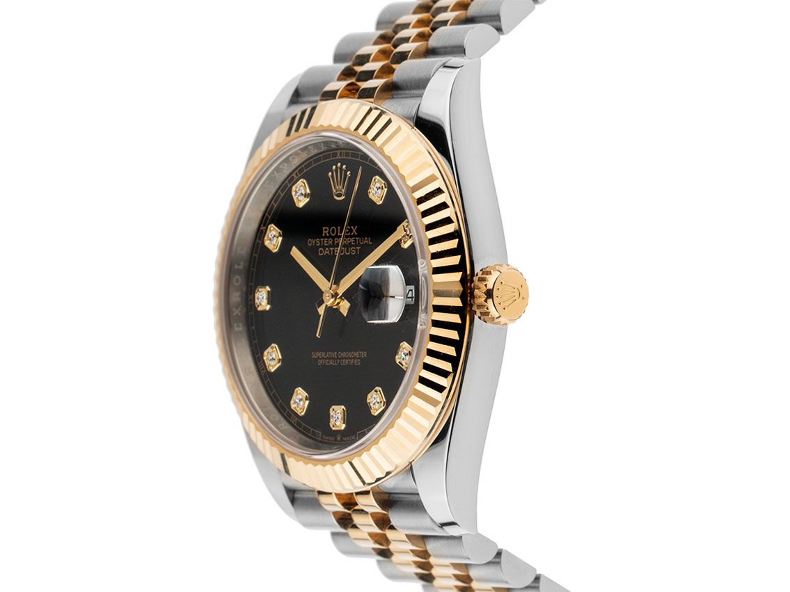 Gehäuse Edelstahl poliert und satiniert, Gehäusedurchmesser ohne Krone 41mm, Gehäusehöhe 11,7mm. Lünette 18kt Gelbgold geriffelt und poliert. Armband Jubilé Edelstahl / 18kt Gelbgold poliert und satiniert, Faltschließe Edelstahl / 18kt Gelbgold mit Hersteller-Logo. Zifferblatt schwarz mit 10 aufgesetzten in Gelbgold gefassten Diamantindexen und gelbgoldenen Zeigern. Uhrwerk Automatik, Chronometer mit Zeugnis, Rolex Manufakturkaliber 3235 mit 31 Edelsteinen, Gangreserve ca. 70 Stunden. Anzeige von Stunde, Minute und Sekunde über Zeiger aus der Mitte mit Sekundenstopp zur sekundengenauen Einstellung der Uhrzeit, Datumsanzeige mit Schnellverstellung unter Glaslupe bei 3 Uhr. Saphirglas kratzfest. Krone verschraubbar mit Hersteller-Logo. Boden Edelstahl verschraubt. Gewicht der Uhr inklusive Armband 151g, Länge des Armbandes inklusive Gehäuse 180mm. Referenznummer: 126333, Gehäusenummer: A979UXXX, ID: P2750305000326HW-19800/18700, Artikelnummer: 10000085292. Mit Gangkontrolle und kompletter äußerlicher Aufarbeitung von März 2026. Original Rolex Box mit Umkarton und Garantie Papiere von August 2021, neue Rolex Garantie Karte ohne Ländercode sowie Beschreibung, Ledermäppchen, Rolex Chronometer-Siegel und Watchregister Auszug von März 2026, The Watch Register Zertifikat / ohne Eintrag (Internationale Datenbank für verlorene oder gestohlene Uhren), inkl. Erstkaufrechnung, Full Set. Superschnäppchen, Kapitalanlage mit Wertsteigerungspotential. Wie Neu. Lieferzeit sofort.