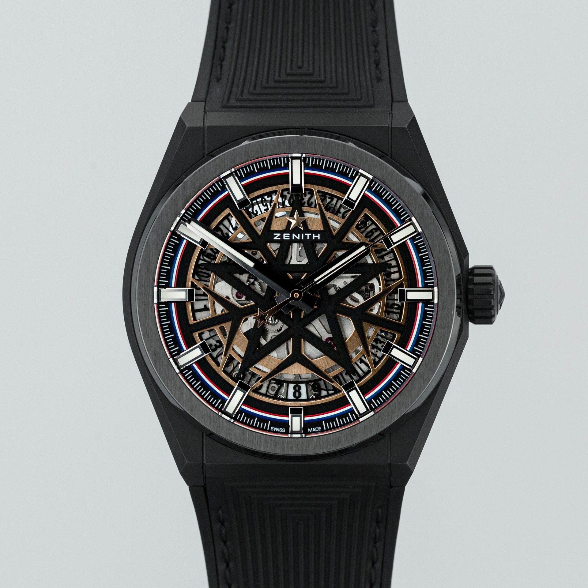 We cannot but start with the dial, as it is the most impressive thing about this watch – skeletonized, it is not only designed in the form of a distinctive star (a symbol of the brand), but in this case, it is combined with a distinctive snowflake. Its other remarkable quality is that, unlike most similar watches, this one is legible – thanks to the large, generously "illuminated" hour markers, which are attached to the contrasting color of the outer ring of the case. In addition, the outer ring is "locked" by a tricolor band in the colors of the French flag. The hands are also large, in the form of double swords, and the date is located at "6 o'clock". Overall, the dial of the Defy Classic manages to be interesting without being cluttered.