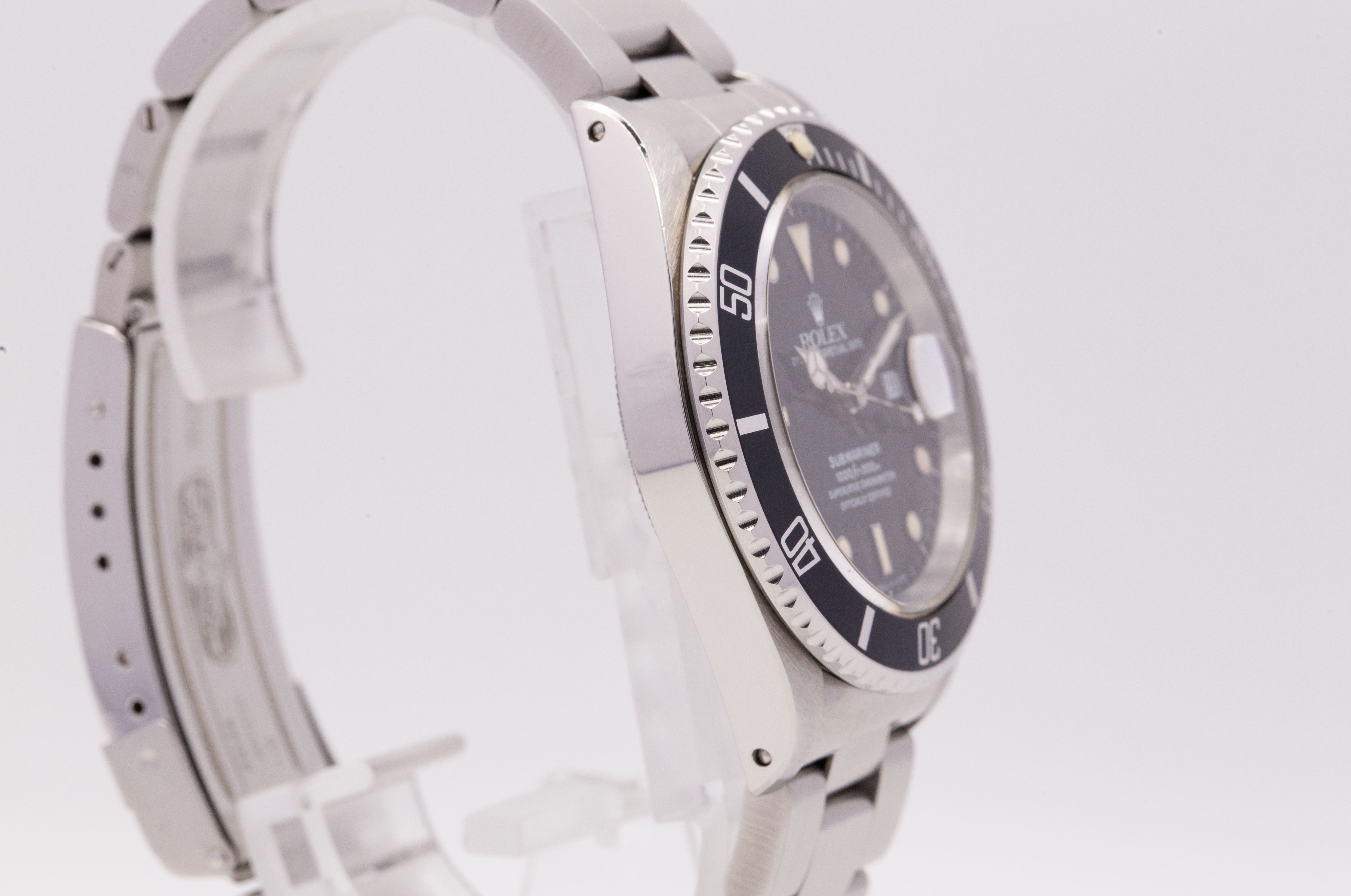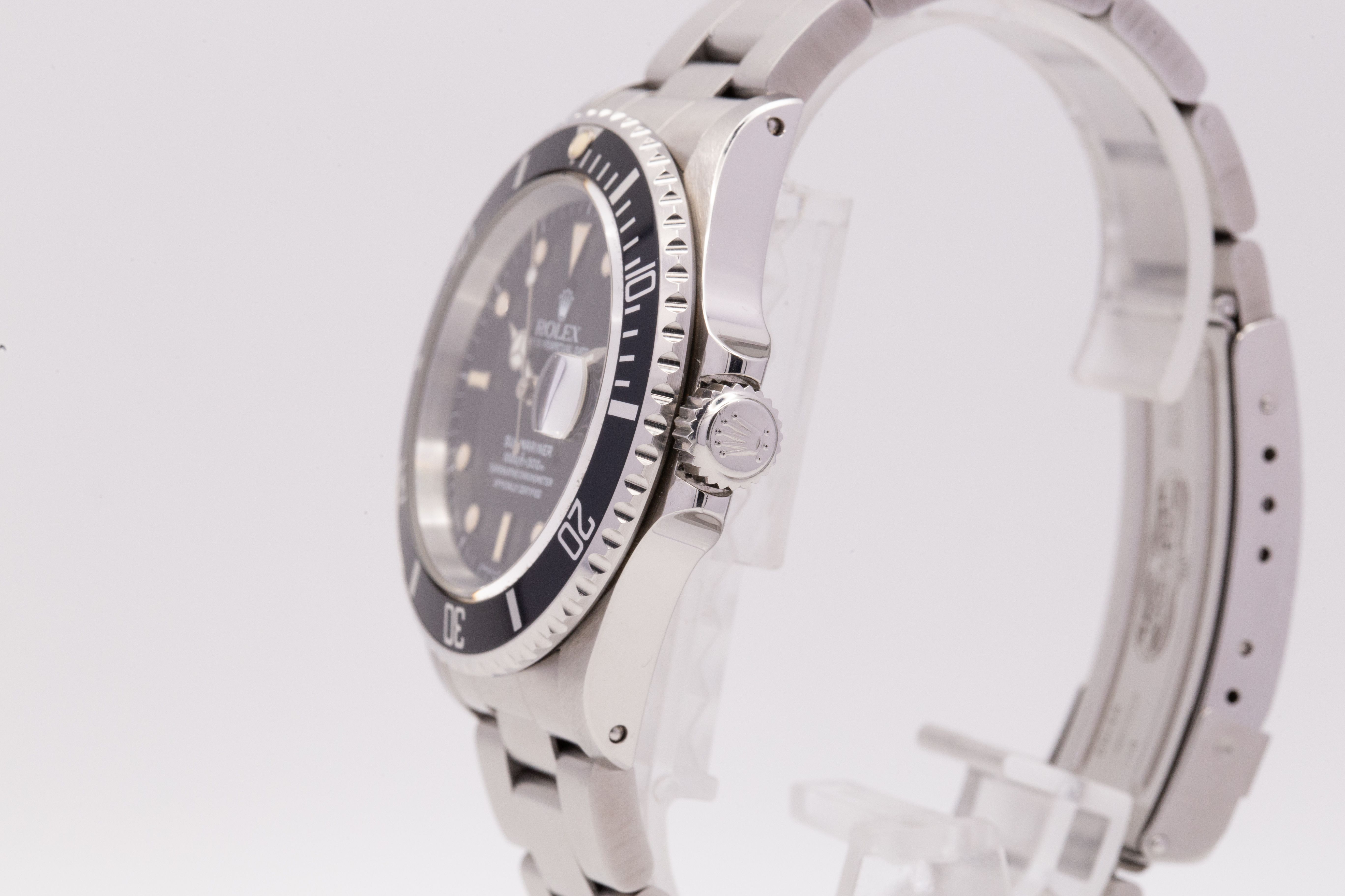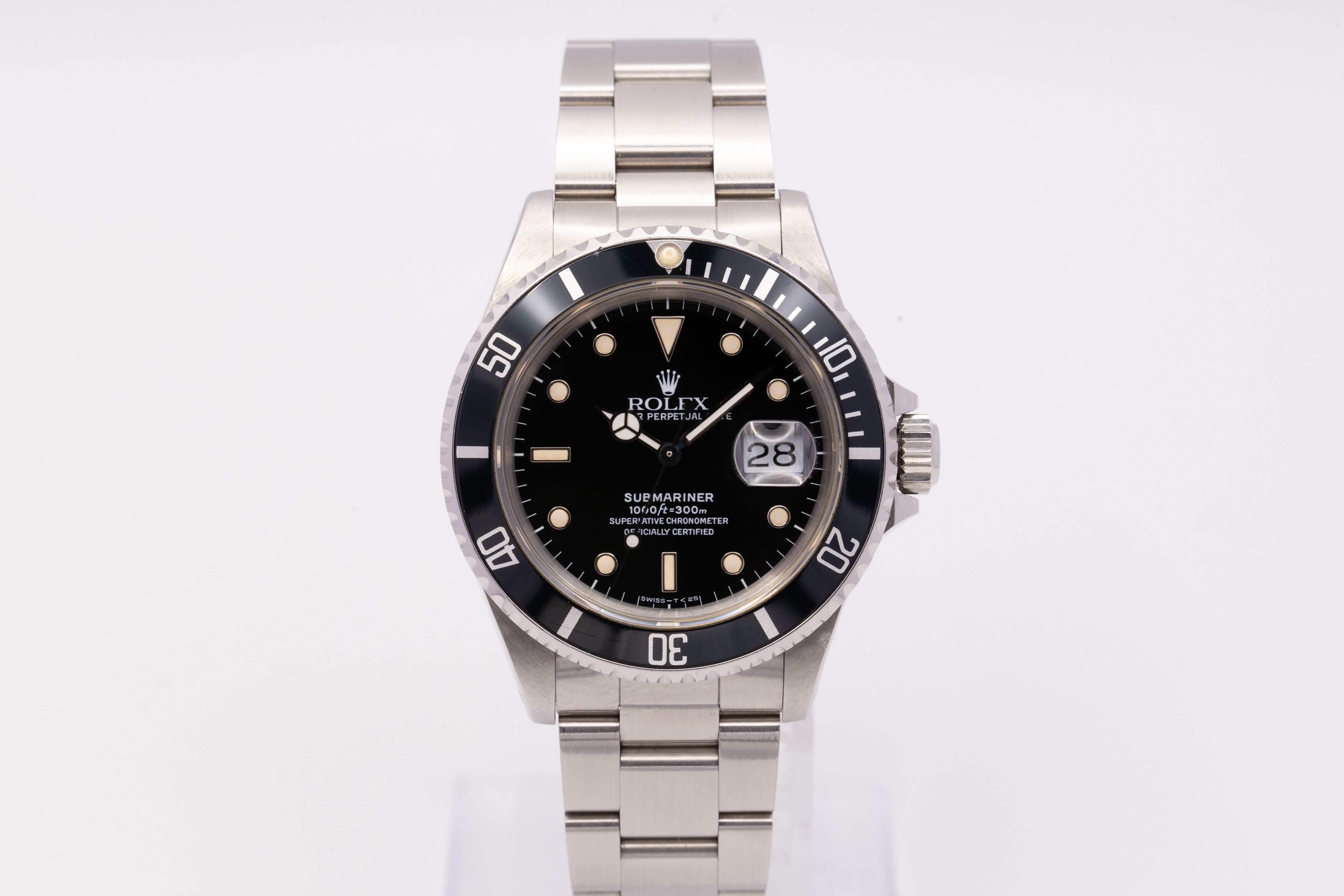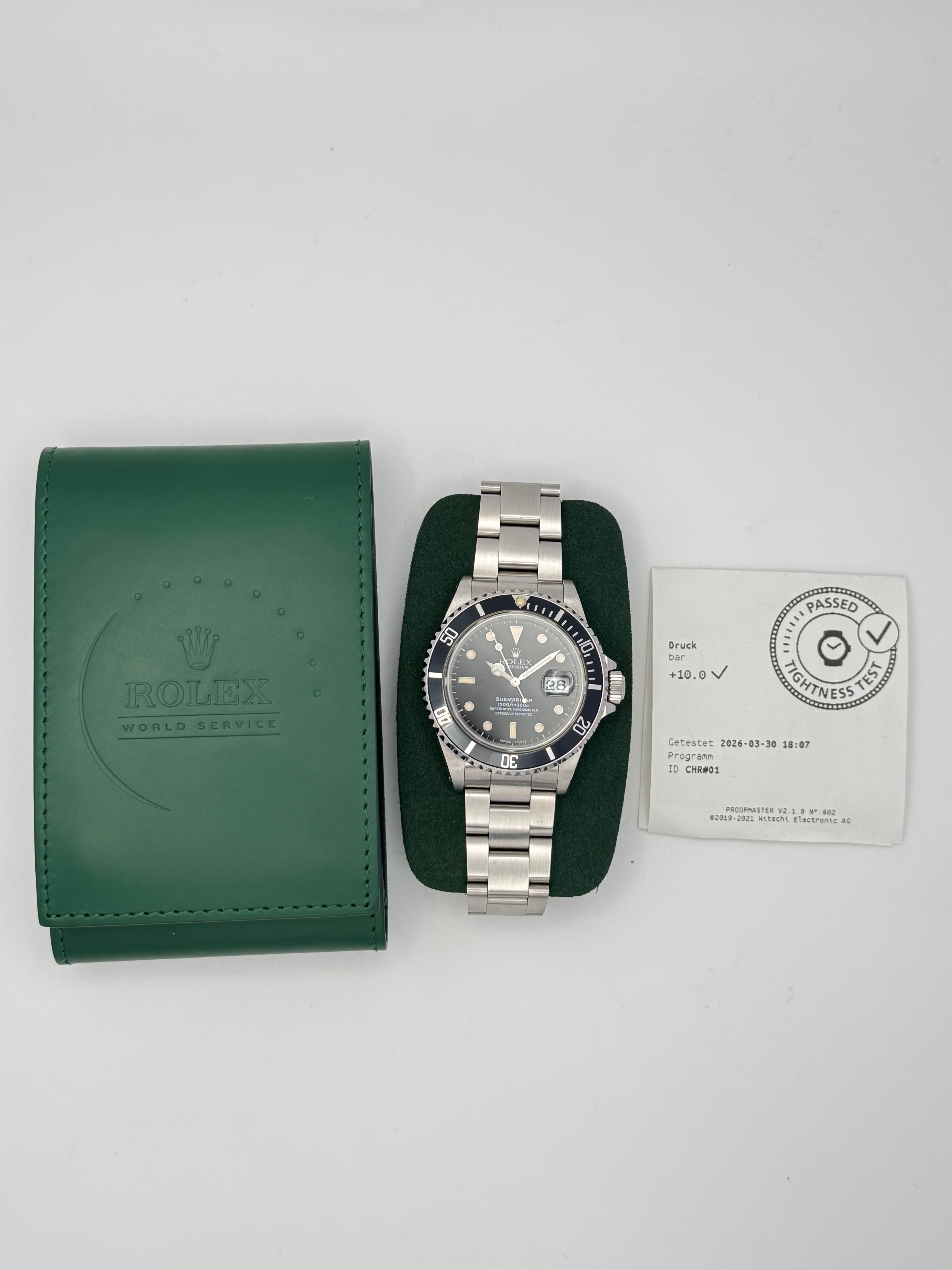 Zum Verkauf steht eine Rolex Submariner Date Ref. 16610 aus der E-Serie (Baujahr 1990) im sehr guten Zustand, ausgestattet mit originalem Tritium-Zifferblatt und -Zeigern sowie Rolex Service-Etui.