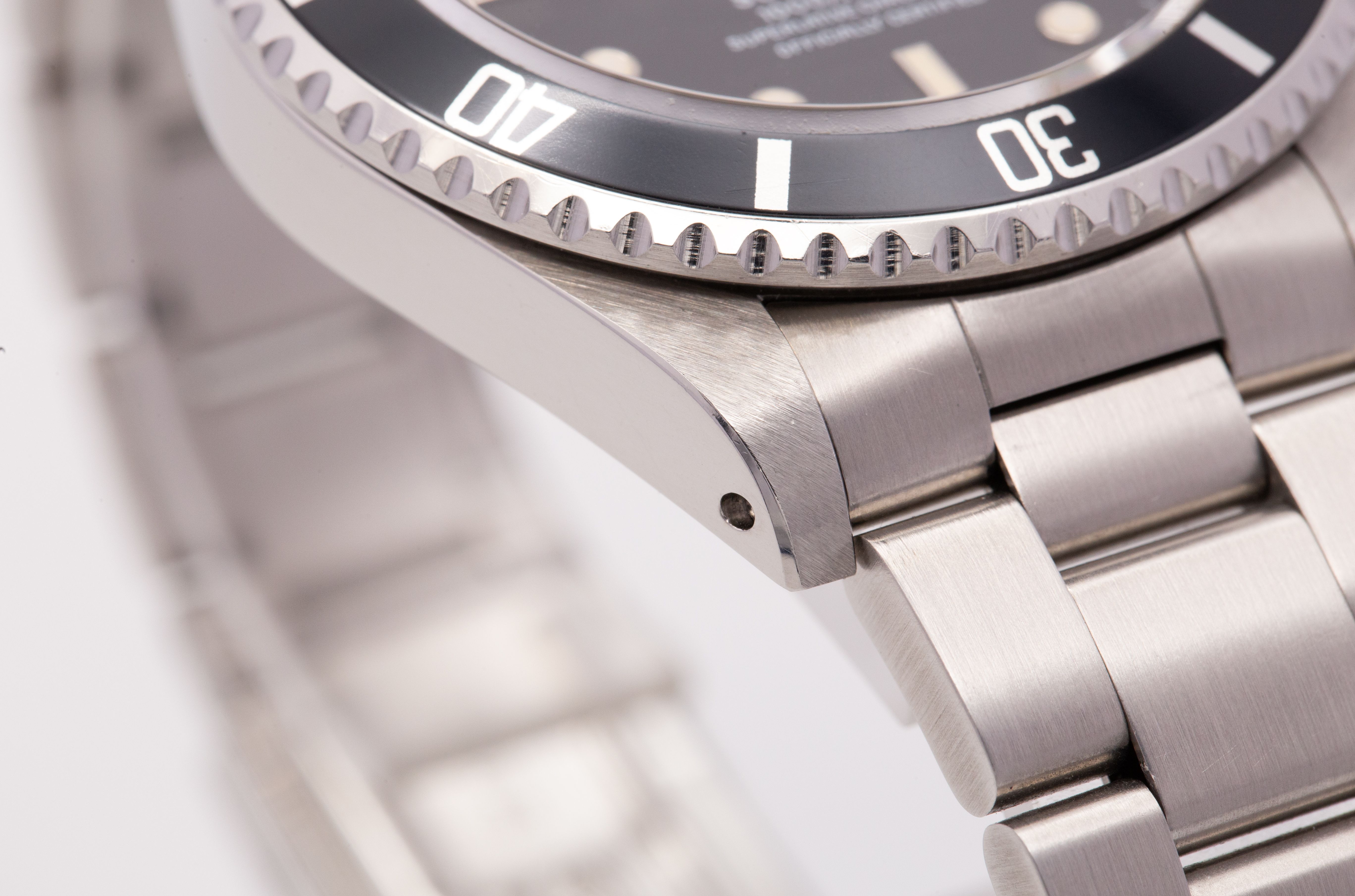 Nach visueller Einschätzung könnte der Schliff noch original von Rolex sein. Leichte Tragespuren auf den polierten Gehäuseseiten sind vorhanden. Die Uhr wurde bewusst nicht nachpoliert, um den substanzstarken und ehrlichen Zustand zu erhalten.