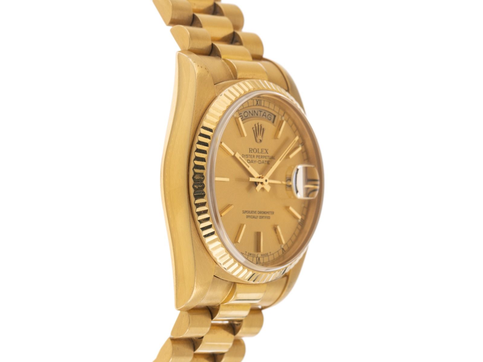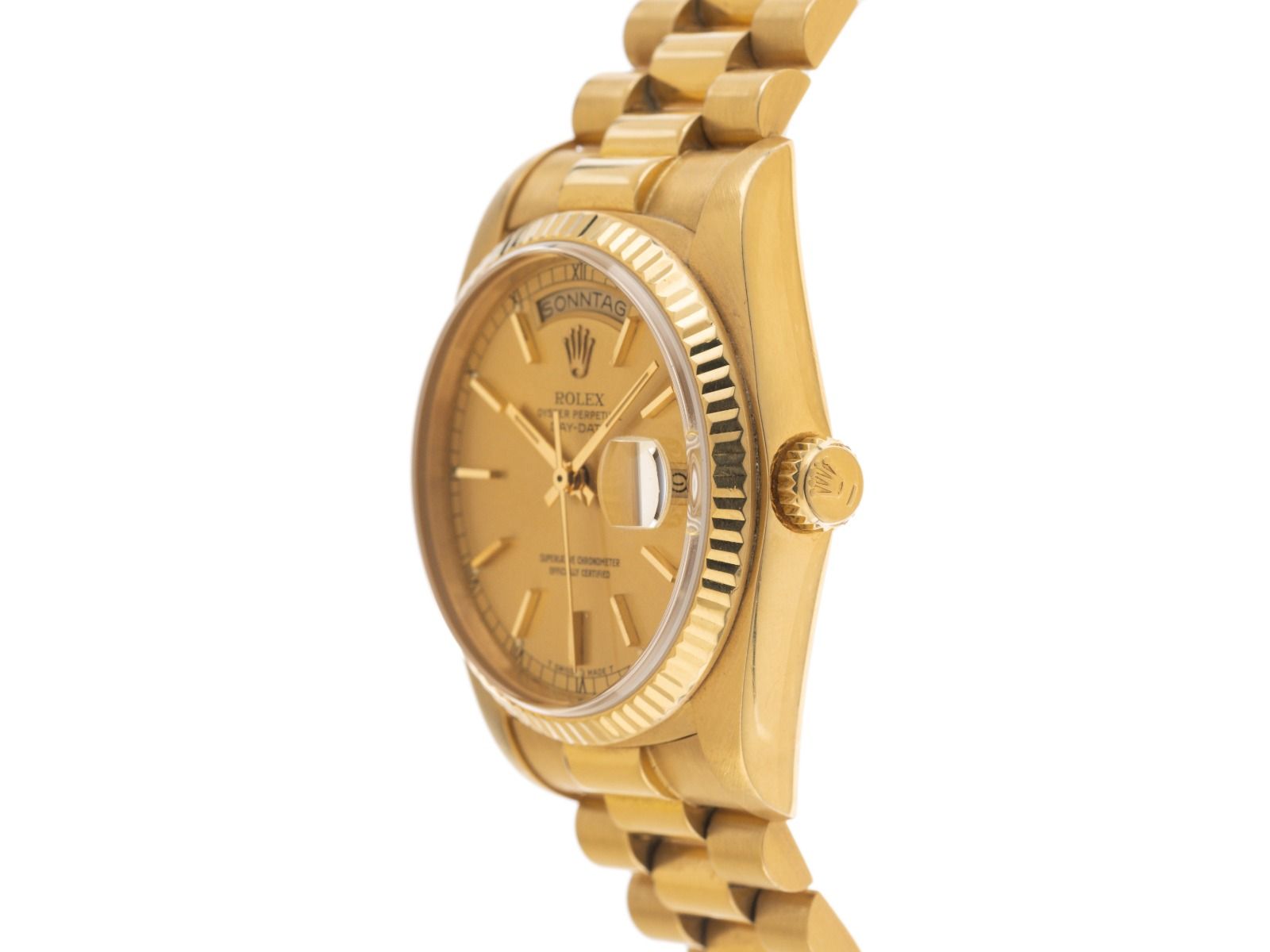 Gehäuse 18kt Gelbgold poliert und satiniert, Gehäusedurchmesser ohne Krone 36mm, Gehäusehöhe 12,5mm. Lünette 18kt Gelbgold geriffelt und poliert. Armband Präsident 18kt Gelbgold poliert und satiniert, verdeckte Crownclasp-Faltschließe 18kt Gelbgold mit Hersteller-Logo. Zifferblatt champagnerfarben mit aufgesetzten gelbgoldenen Indexen und gelbgoldenen Zeigern. Uhrwerk Automatik, Chronometer mit Zeugnis, Rolex Manufakturkaliber 3055 mit 27 Edelsteinen. Anzeige von Stunde, Minute und Sekunde über Zeiger aus der Mitte mit Sekundenstopp zur sekundengenauen Einstellung der Uhrzeit, Wochentaganzeige in deutsch bei 12 Uhr, Datumsanzeige mit Schnellverstellung unter Glaslupe bei 3 Uhr, open 6/9 (offene 6 und 9 in der Datumsanzeige). Saphirglas kratzfest. Krone verschraubbar mit Hersteller-Logo. Boden 18kt Gelbgold verschraubt. Gewicht der Uhr inklusive Armband 136g, Länge des Armbandes inklusive Gehäuse 175mm. Referenznummer: 18038, Gehäusenummer: 80316XXX, Baujahr: 1983, ID: KB1831296000426HW-24200, Artikelnummer: 10000085391. Mit Gangkontrolle und kompletter äußerlicher Aufarbeitung von April 2026. Original Rolex Box und Garantie Papiere von Mai 1984, LC 100 / Germany sowie Beschreibung, Übersetzungsheft, Rolex Reise Etui, Rolex Chronometer-Siegel, Erstkaufrechnung, Service- Vita, diversen Dokumentationen und Watchregister Auszug von April 2026, The Watch Register Zertifikat / ohne Eintrag (Internationale Datenbank für verlorene oder gestohlene Uhren), Full Set. Superschnäppchen, Kapitalanlage mit Wertsteigerungspotential, extrem seltenes Sammlerstück, aus erster Hand. Sehr guter Zustand. Lieferzeit sofort.