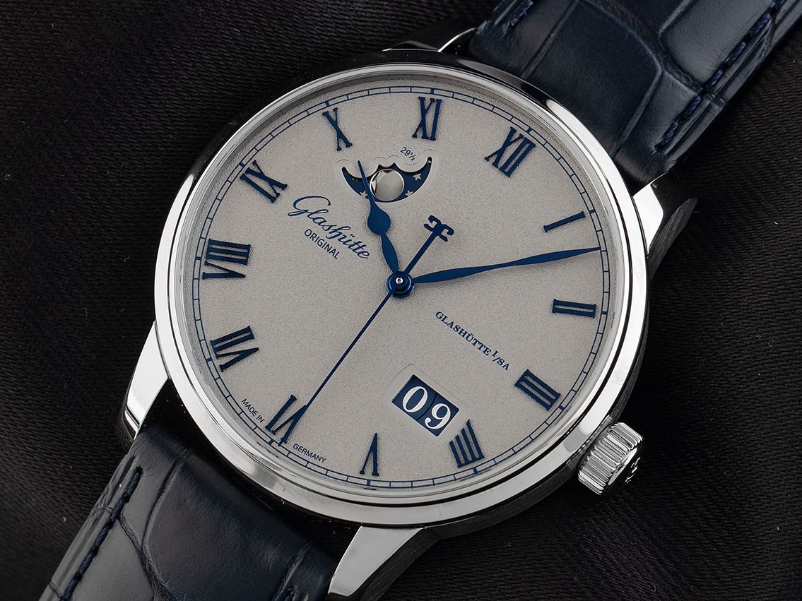 Gehäuse Edelstahl poliert und satiniert, Gehäusedurchmesser ohne Krone 40mm, Gehäusehöhe 12,2mm. Lünette Edelstahl glatt und poliert. Glashütte Original Armband Krokoleder blau mit Ziernaht, Anstoßbreite 20mm, Glashütte Original Sicherheitsfaltschließe Edelstahl mit Hersteller-Logo. Zifferblatt grau galvanisiert mit blauen römischen Ziffern und gebläuten Zeigern. Uhrwerk Automatik, Chronometer mit Zeugnis, Glashütte Original Manufakturkaliber 36-24, Gangreserve ca. 100 Stunden. Anzeige von Stunde, Minute und Sekunde über Zeiger aus der Mitte mit Sekundenstopp zur sekundengenauen Einstellung der Uhrzeit, Panoramadatum mit Schnellverstellung zwischen 4 und 5 Uhr, Mondphasenanzeige zwischen 10 und 11 Uhr. Saphirglas kratzfest und gewölbt. Krone mit Hersteller-Logo. Boden Edelstahl 5-fach verschraubt und graviert mit Saphirglas Sichtfenster. Gewicht der Uhr inklusive Armband 91g. Wasserdicht bis 5 ATM. Referenznummer: 1-36-24-02-02-61, ID: ST1160172120326H-12500, Artikelnummer: 10000085397. Glashütte Original Box mit Umkarton und Garantie Papiere von März 2026 sowie Beschreibung, Full Set. Ungetragen. Lieferzeit sofort.