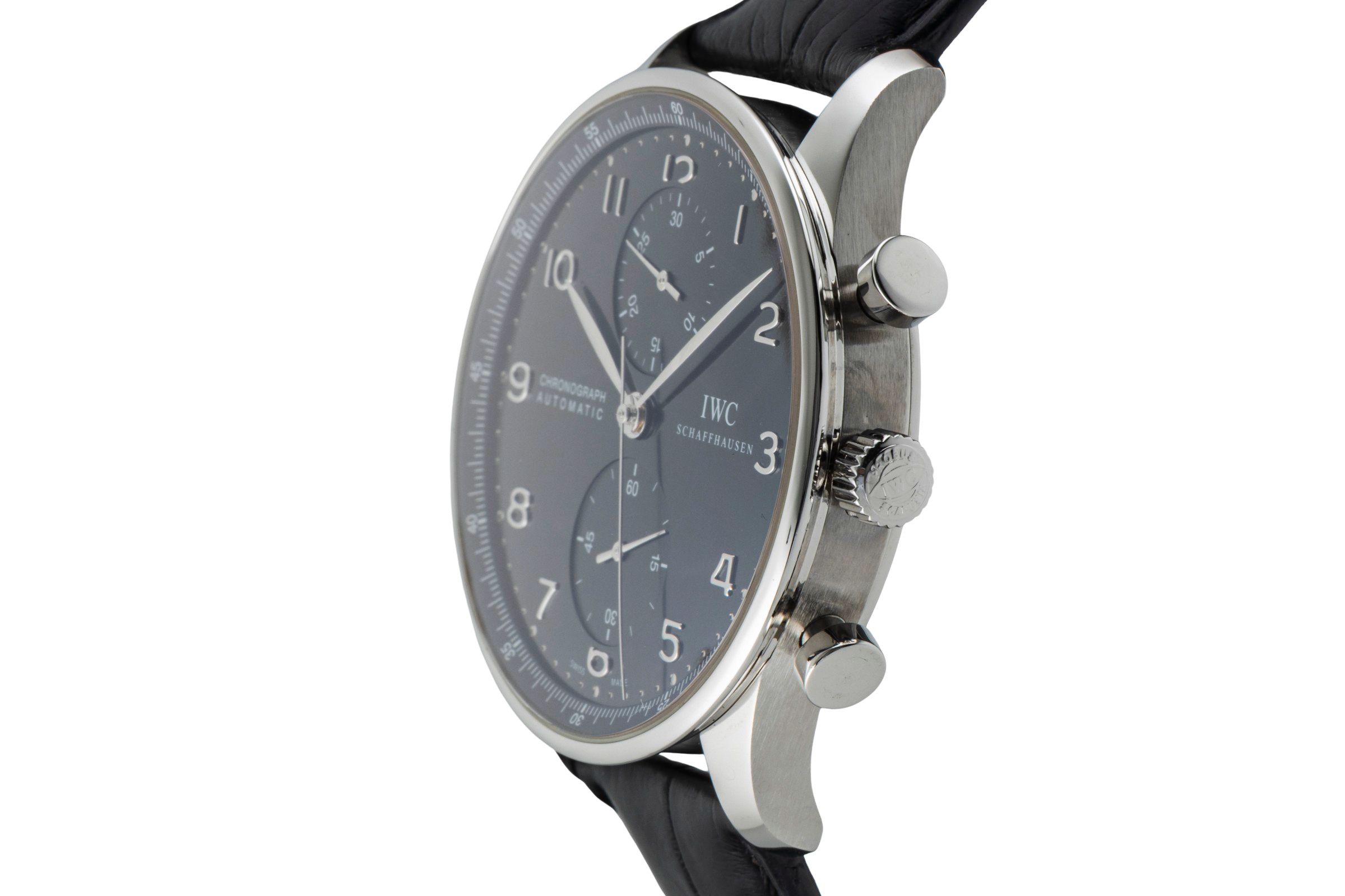Alternative title: IWC IW371447 Portuguese Chrono-Automatic Stainless Steel / Black; IWC Portugieser Chronograph Stahl Automatik Herrenuhr Ref. IW371447 VP: 9100 € [2601187]