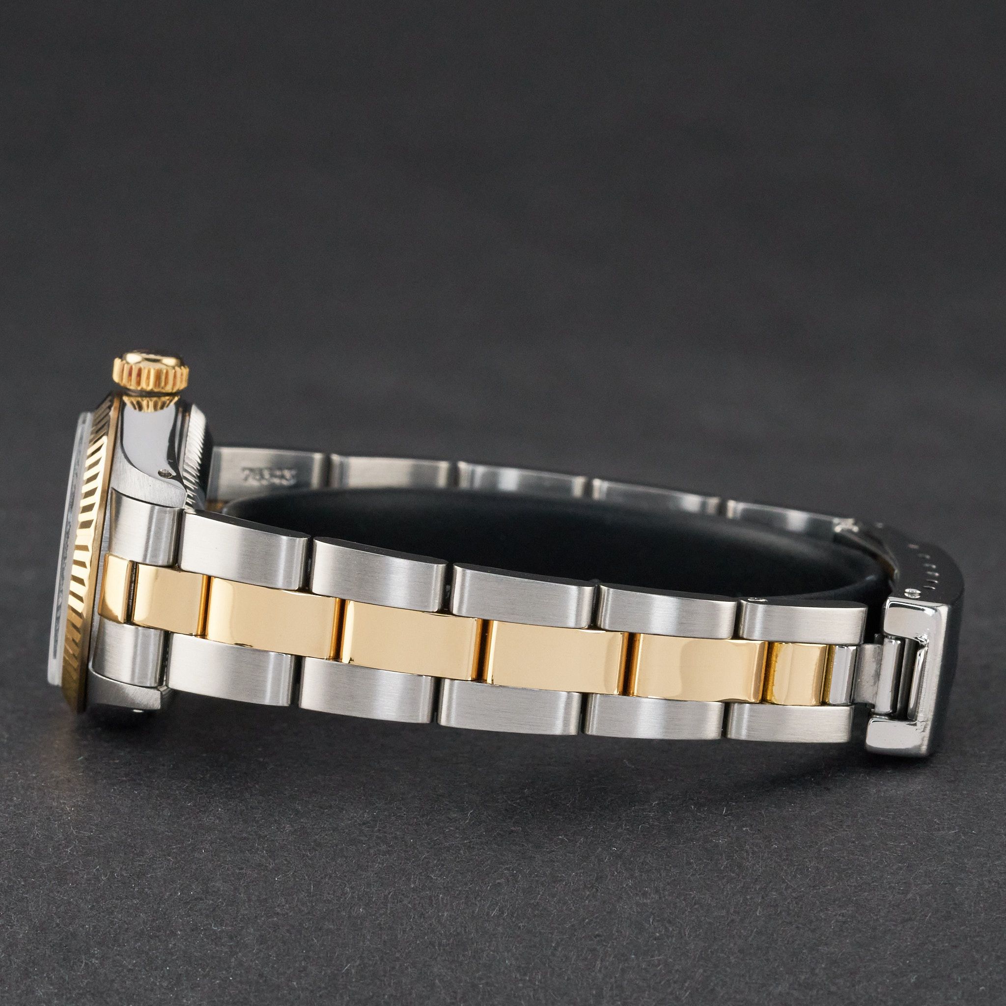 This Rolex Oyster Perpetual Lady 67193 features a Silver small diamond dial and is crafted from 18K yellow gold and stainless steel, with a production year of 1987.