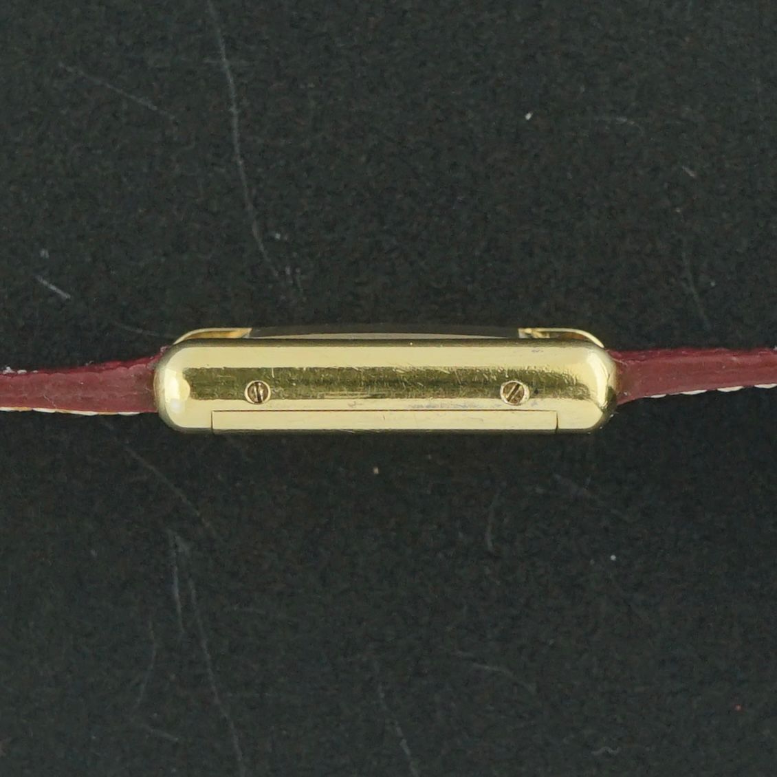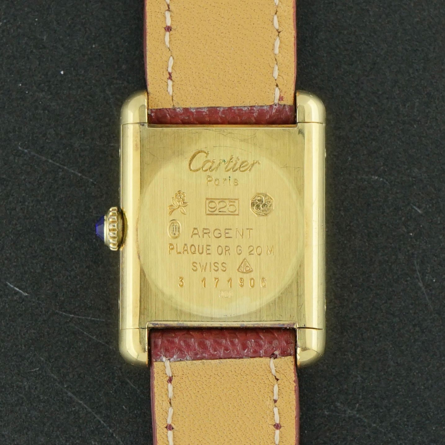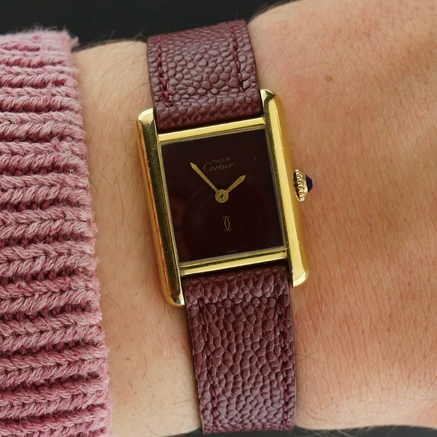 This vintage Cartier Tank Vermeil Must was produced in the 1990s. It features a beautiful burgundy dial with a very light spider dial effect, only visible under certain light angles. The case is made of silver with gold plating and measures 20.5 millimeters in width, being the SM, also known as the ladies model.