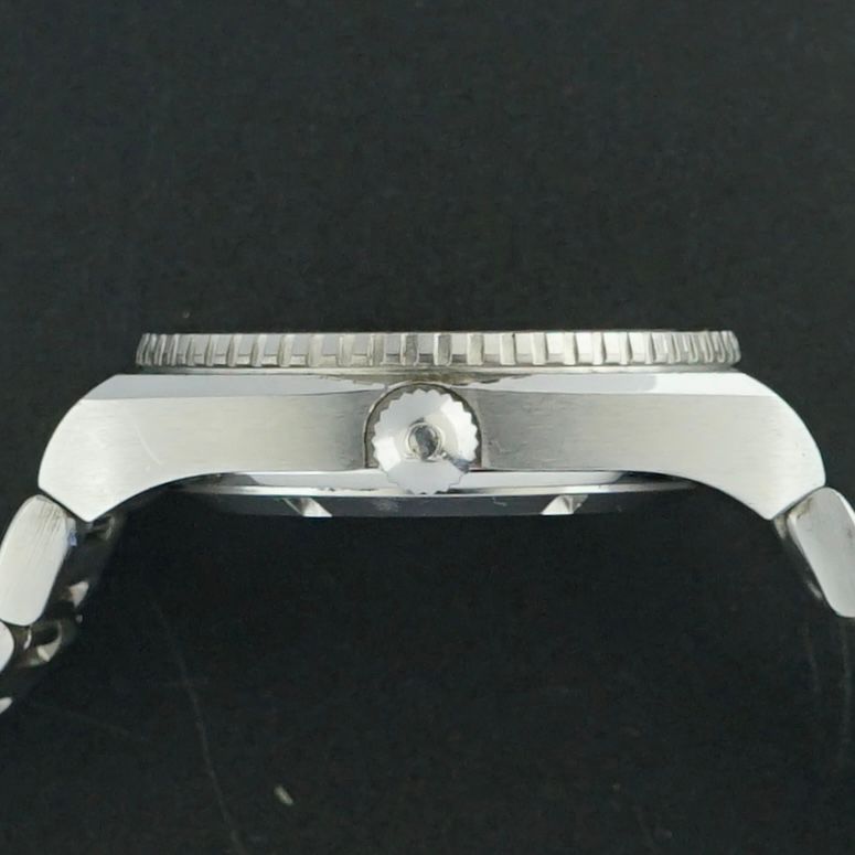 The watch has a very dark grey to black dial in perfect condition, complemented by a rotatable bezel. The case and bracelet retain most of their original polish, adding to its strong overall presence.