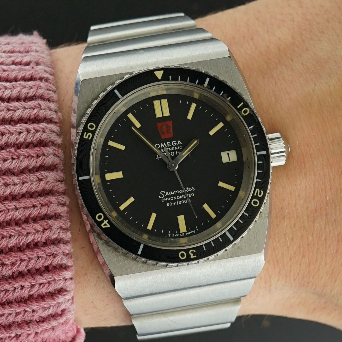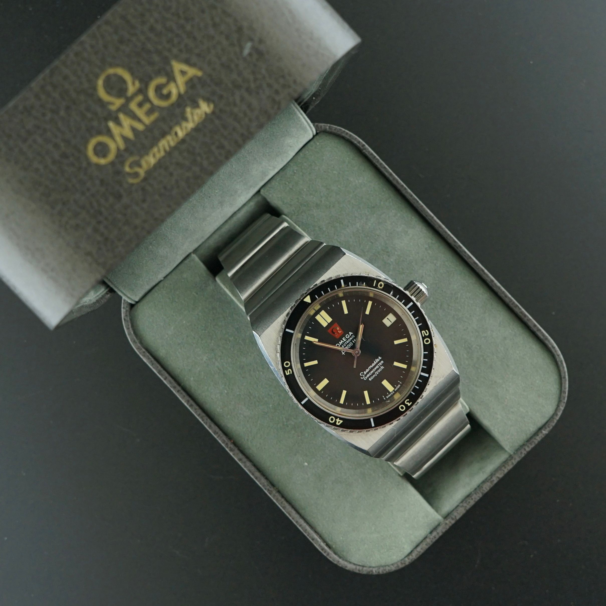 This vintage Omega Seamaster Electronic was produced in 1972 and is an incredibly robust watch. It is the Omega Electronic F300Hz Seamaster Chronometer 60M, 200 feet, featuring a 38 millimeter case width, 49 millimeter lug to lug, and an overall weight of 140 grams.
