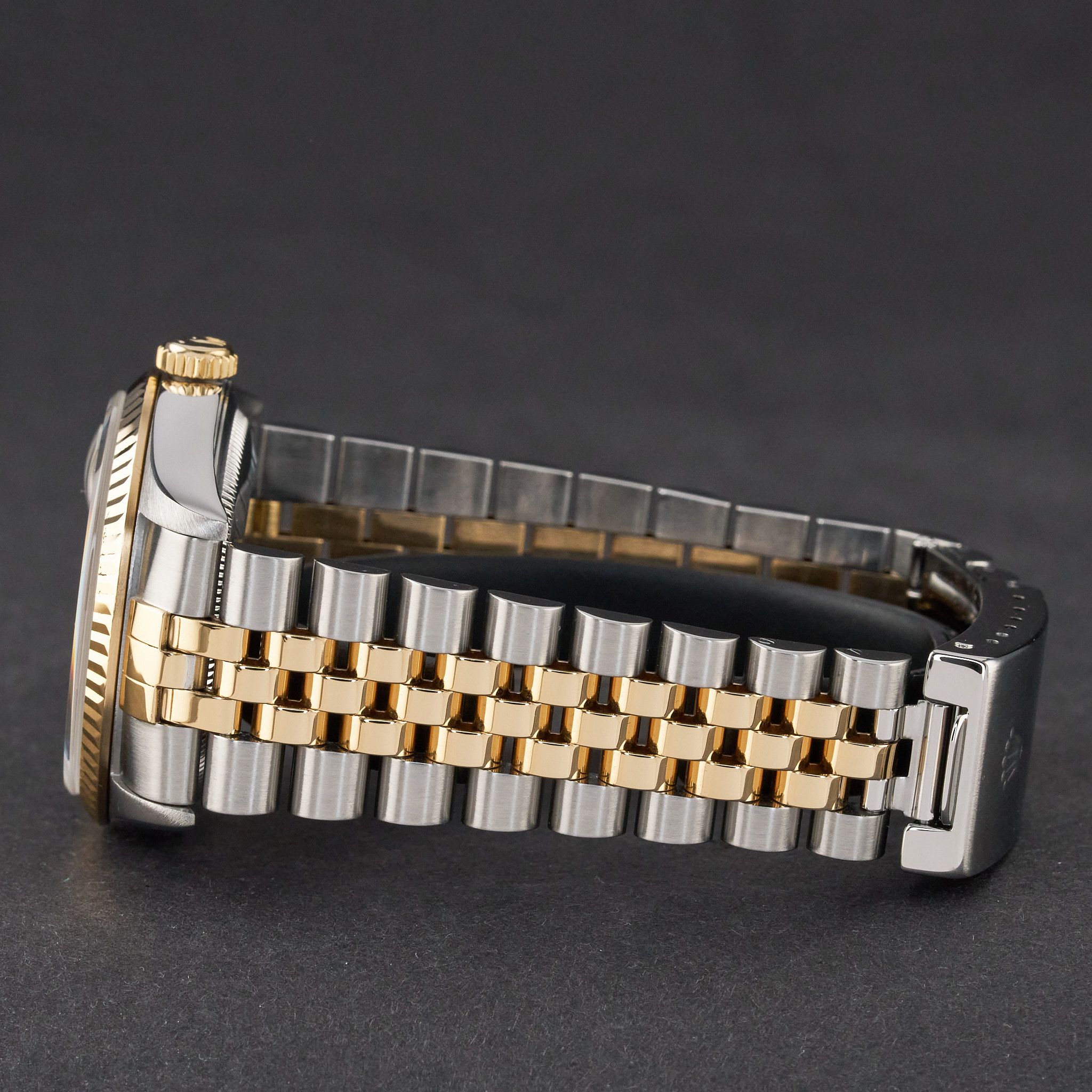 This Rolex Datejust 16233 features a Champagne jubilee big diamond dial and is crafted from 18K yellow gold and stainless steel, with a production year of 1994.