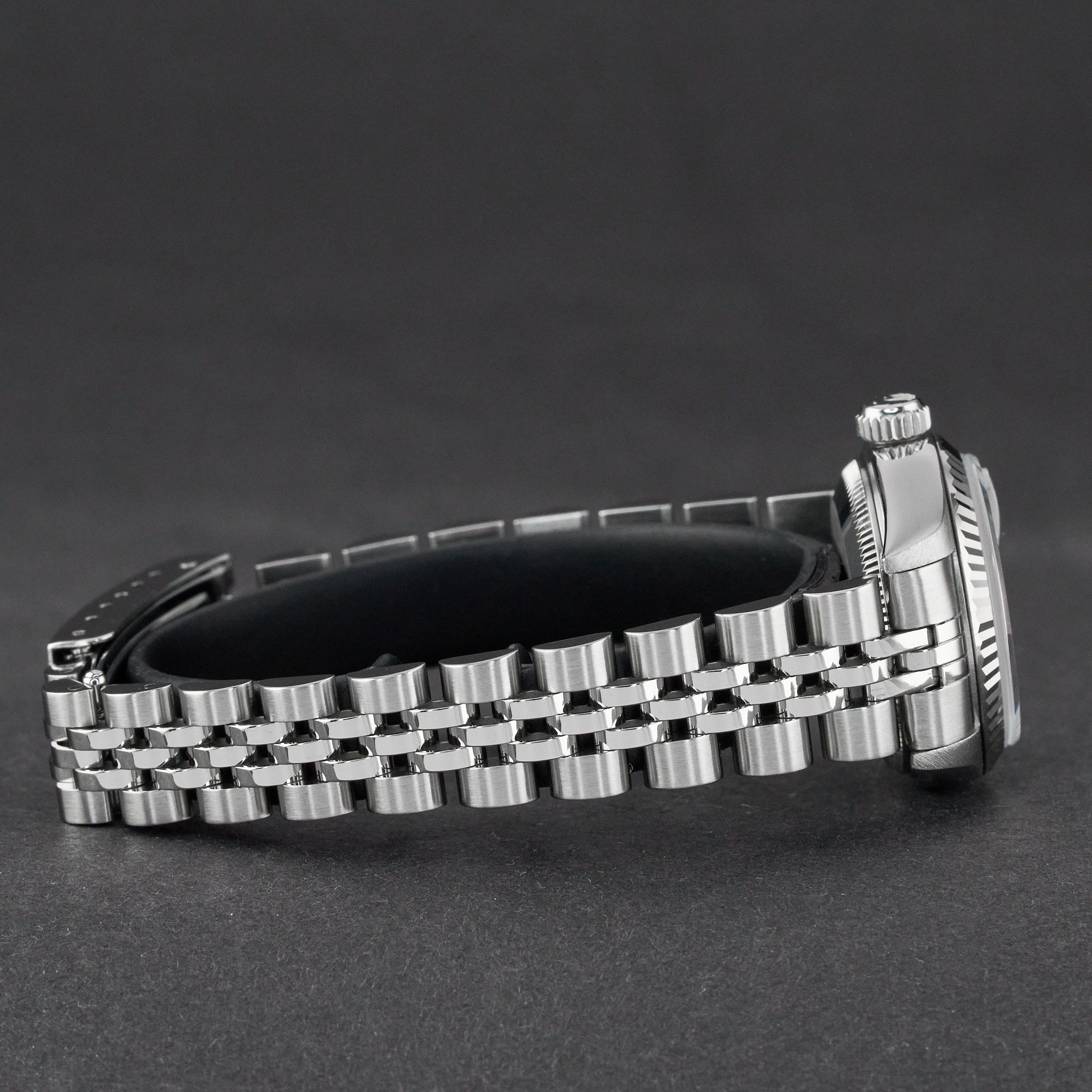 - Minor signs of wear such as hairline marks or small surface scratches. Case, bezel, and bracelet retain sharp edges and overall form. May have been professionally polished without affecting the original contours. Fully functional mechanically.