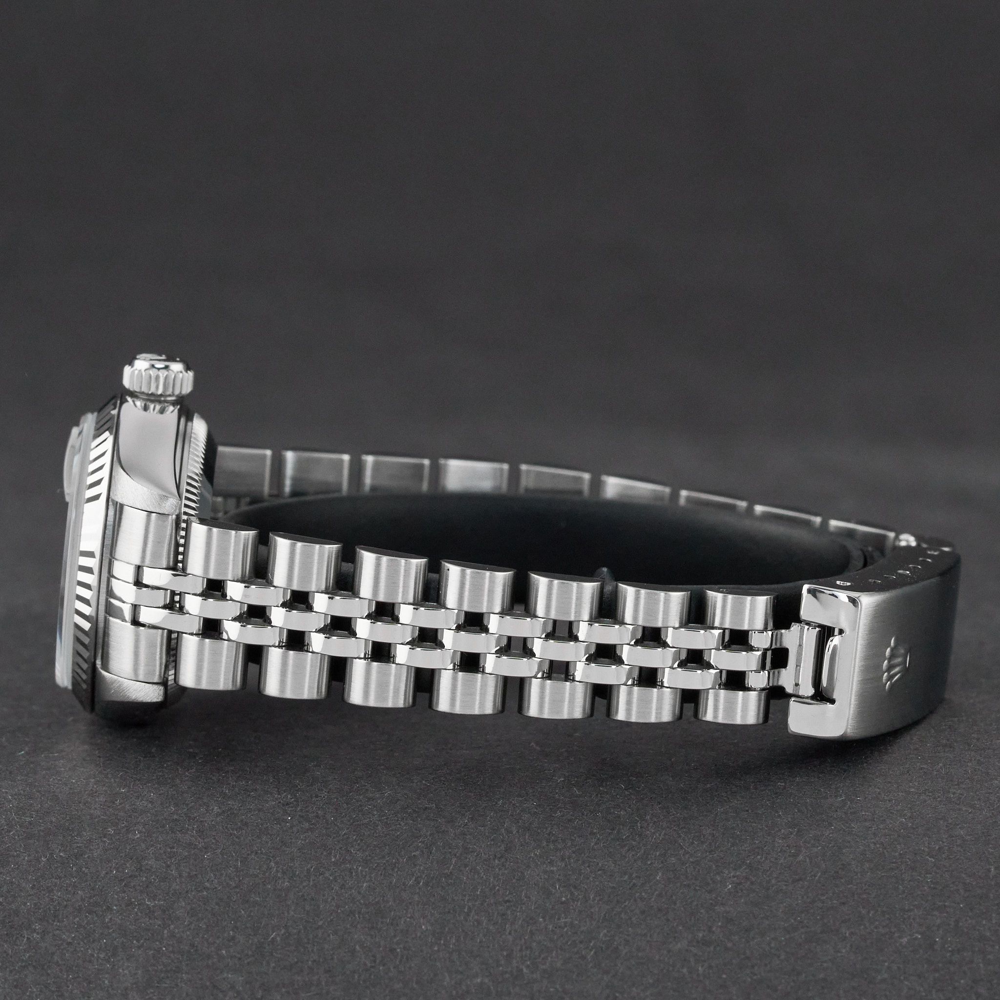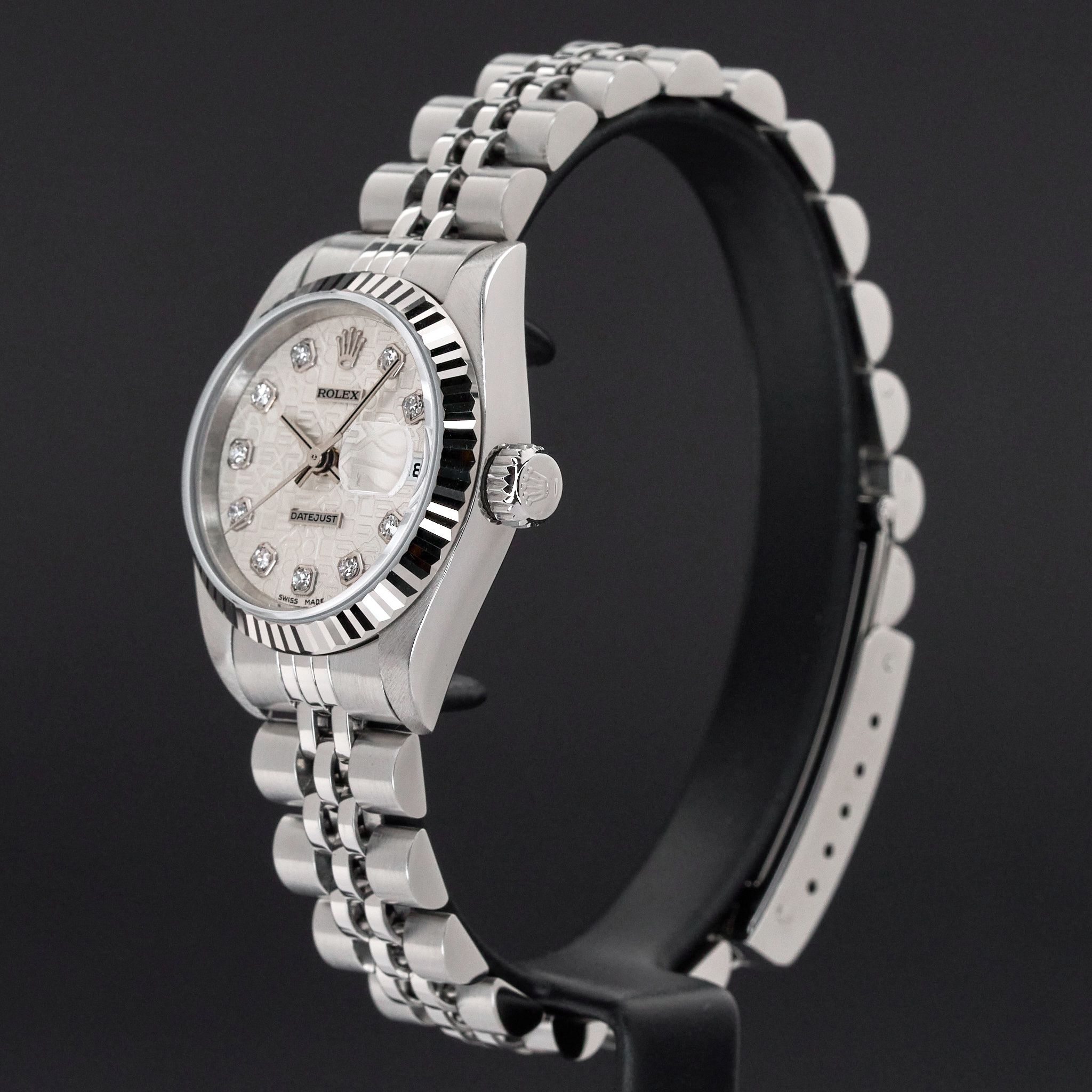 This Rolex Lady-Datejust 79174 features a Silver jubilee big diamond dial and is crafted from stainless steel, with a production year of 2000.