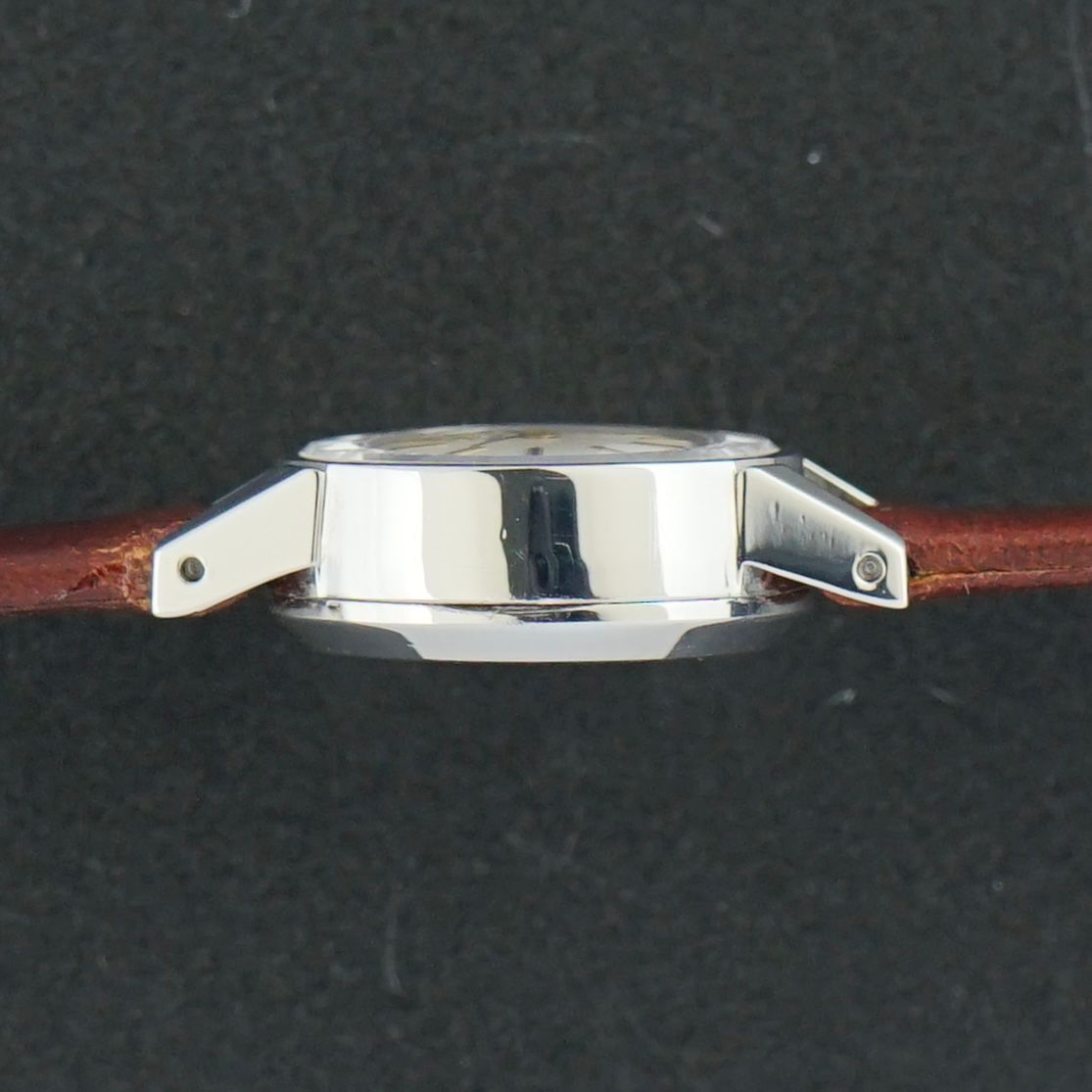 A Vintage Omega De Ville cocktail watch produced in 1965, a refined lady’s model with a 17.5mm stainless steel case in beautiful condition. The watch features a white sunburst dial in excellent shape with elegant golden accents that enhance its classic dress aesthetic. Inside is the Omega caliber 484 manual wind movement, fully serviced in March 2026 and running excellently with reliable performance. It is fitted with a striking faceted crystal that creates a subtle diamond-like sparkle under different light angles. The watch has been paired with a burgundy brown leather strap with a gold-plated buckle, carefully chosen to complement the warm golden details on the dial. Overall, an elegant and timeless vintage dress watch for the lady.