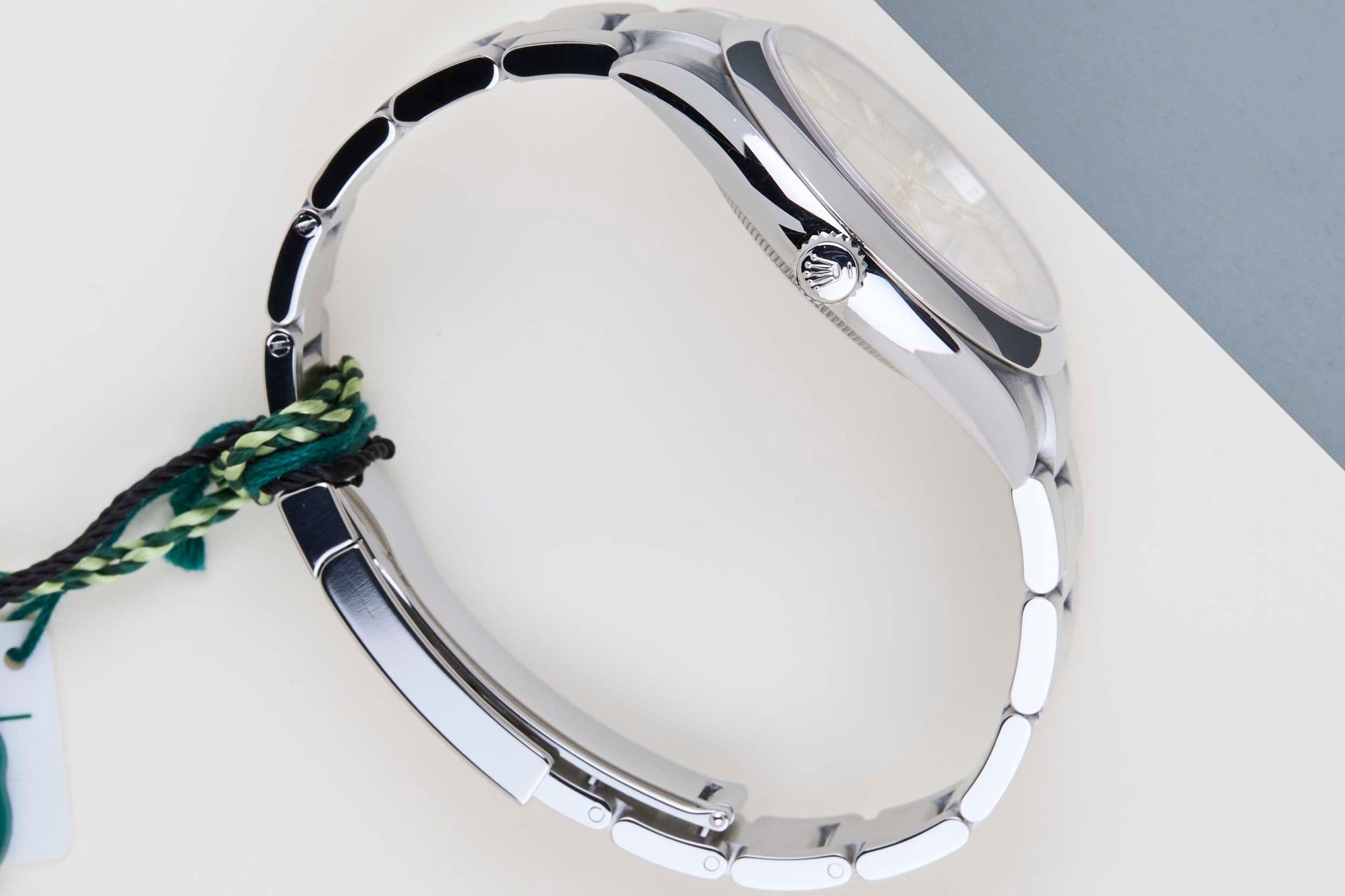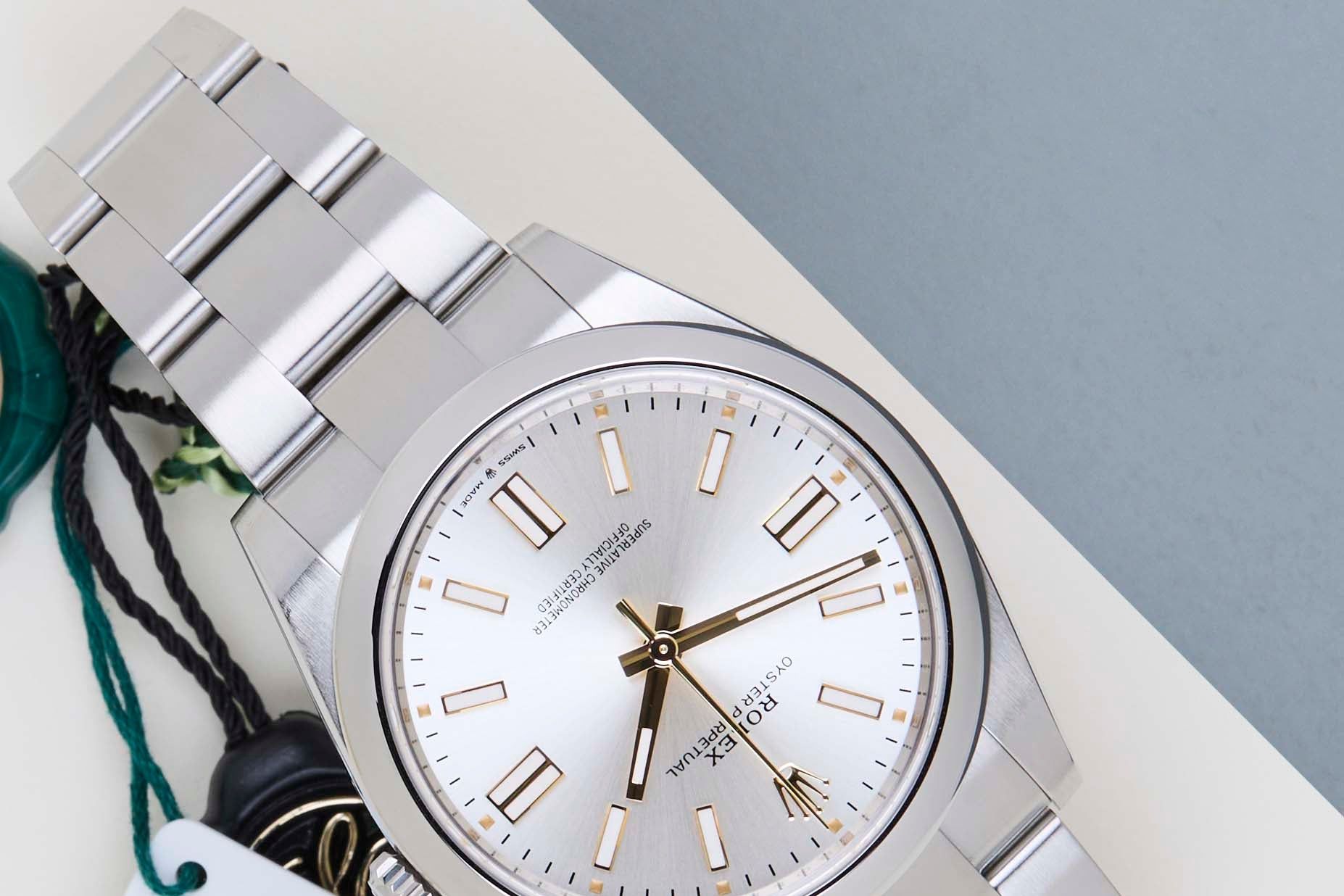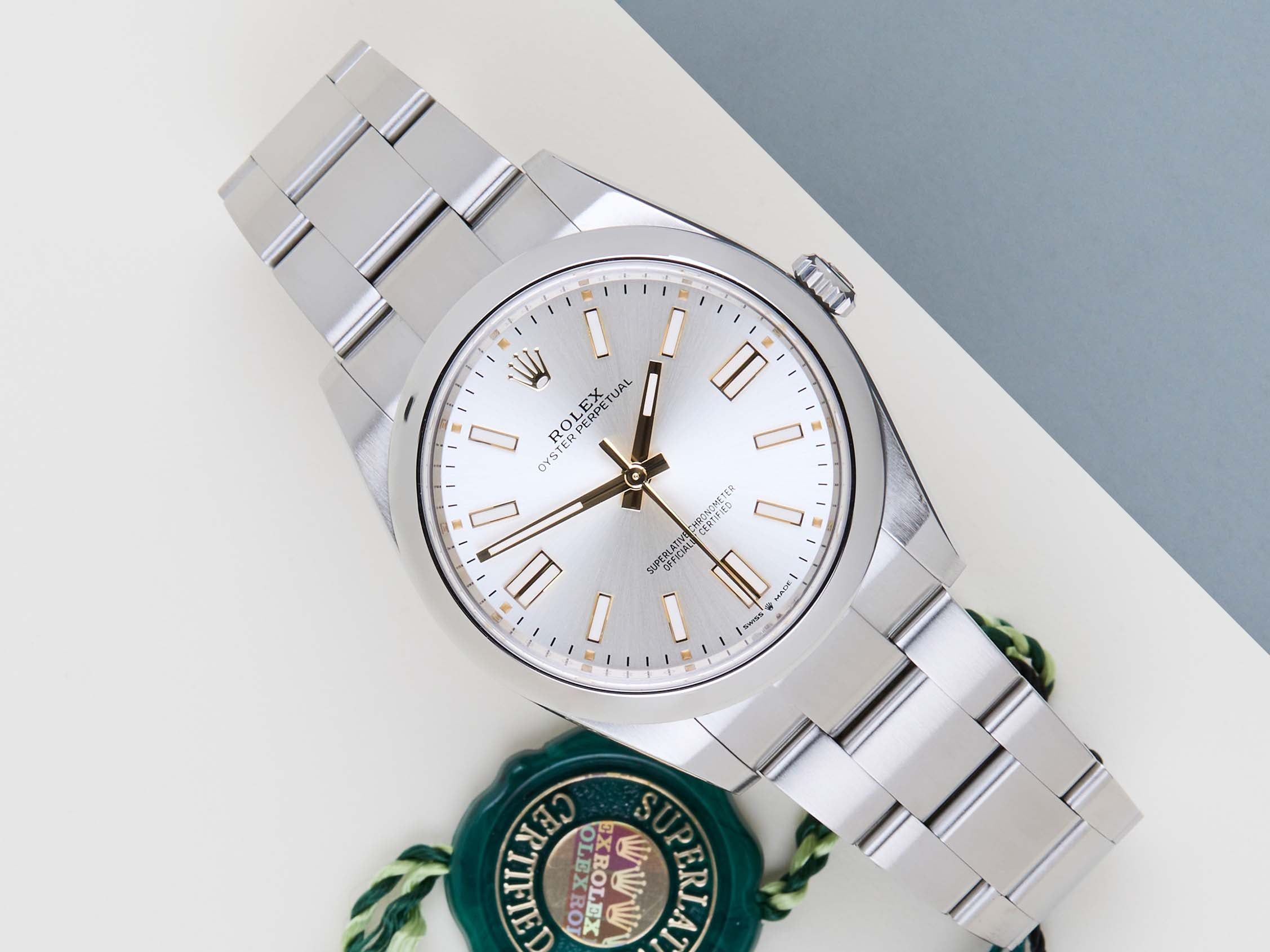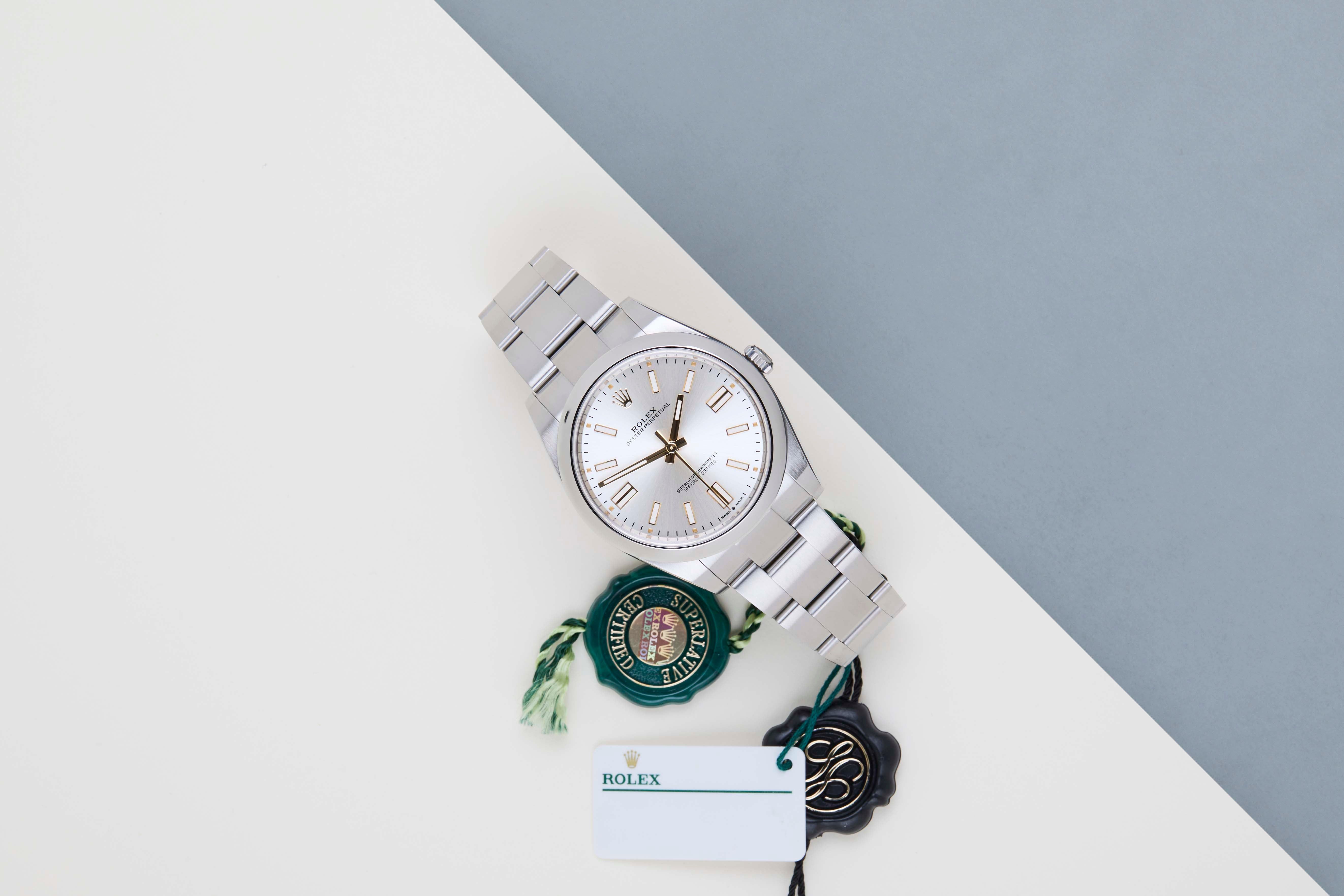 Full Set | International Rolex Warranty Until May 2028The Rolex Oyster Perpetual was first introduced by Rolex in the 1930s. It is characterized by its water-resistant Oyster case and self-winding Perpetual movement. The Rolex Oyster Perpetual a simple, yet elegant timepiece that is suitable for both casual and formal wear.This Rolex Oyster Perpetual 41 'Silver Dial' was sold for the first time in May 2023.The watch is fully made out of stainless steel. Rolex uses 904L in its steel watches, which is an extremely resistant and highly polishable superalloy.This Rolex Oyster Perpetual 41 is in Mint condition and comes with the original Rolex Warranty Card and box. Furthermore, the watch still has International Rolex Warranty until May 2028.