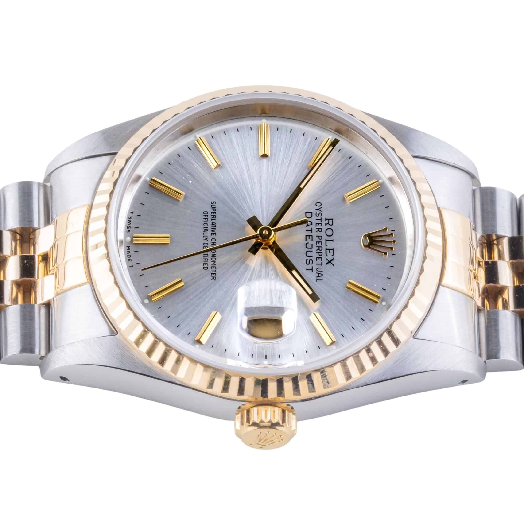 Rolex Oyster Perpetual Datejust reference 16233 from 1990 including full set. The Datejust 16233 measures a 36mm gold and stainless steel case, two-tone Jubilee bracelet and fluted 18k gold bezel. This Datejust 16233 features an automatic movement caliber 3135 with a quickset date function, a scratch resistance sapphire crystal and a silver dial with tritium hands.