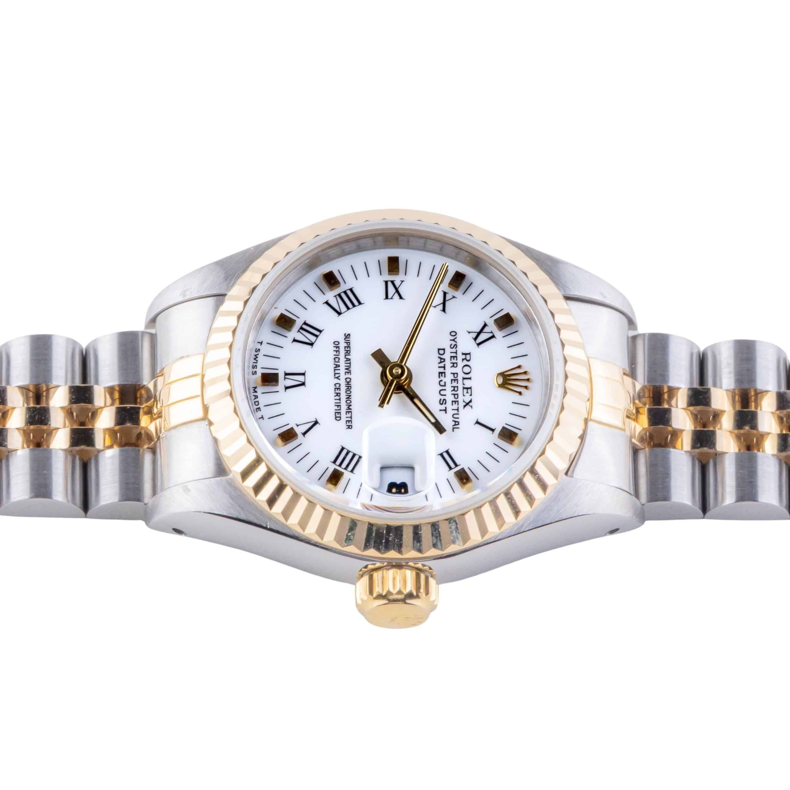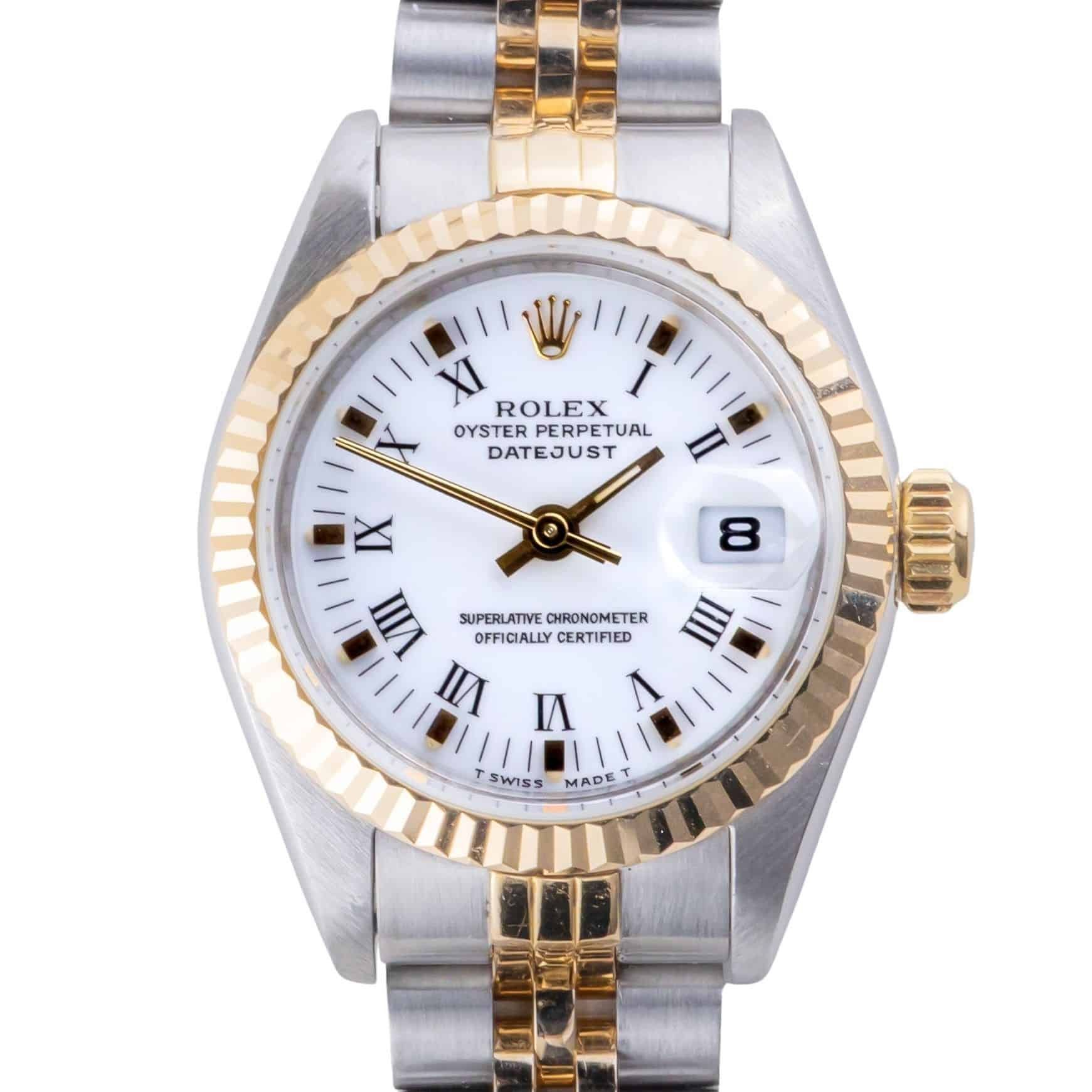 Rolex Oyster Perpetual Lady-Datejust reference 69173 from 1990 including full set. The Lady-Datejust 69173 measures a 26mm gold and stainless steel case, two-tone jubilee bracelet and fluted 14k gold bezel. This Lady-Datejust 69173 features an automatic movement caliber 2135 with quickset date function, a scratch resistance sapphire crystal and a white dial w/ tritium hands.