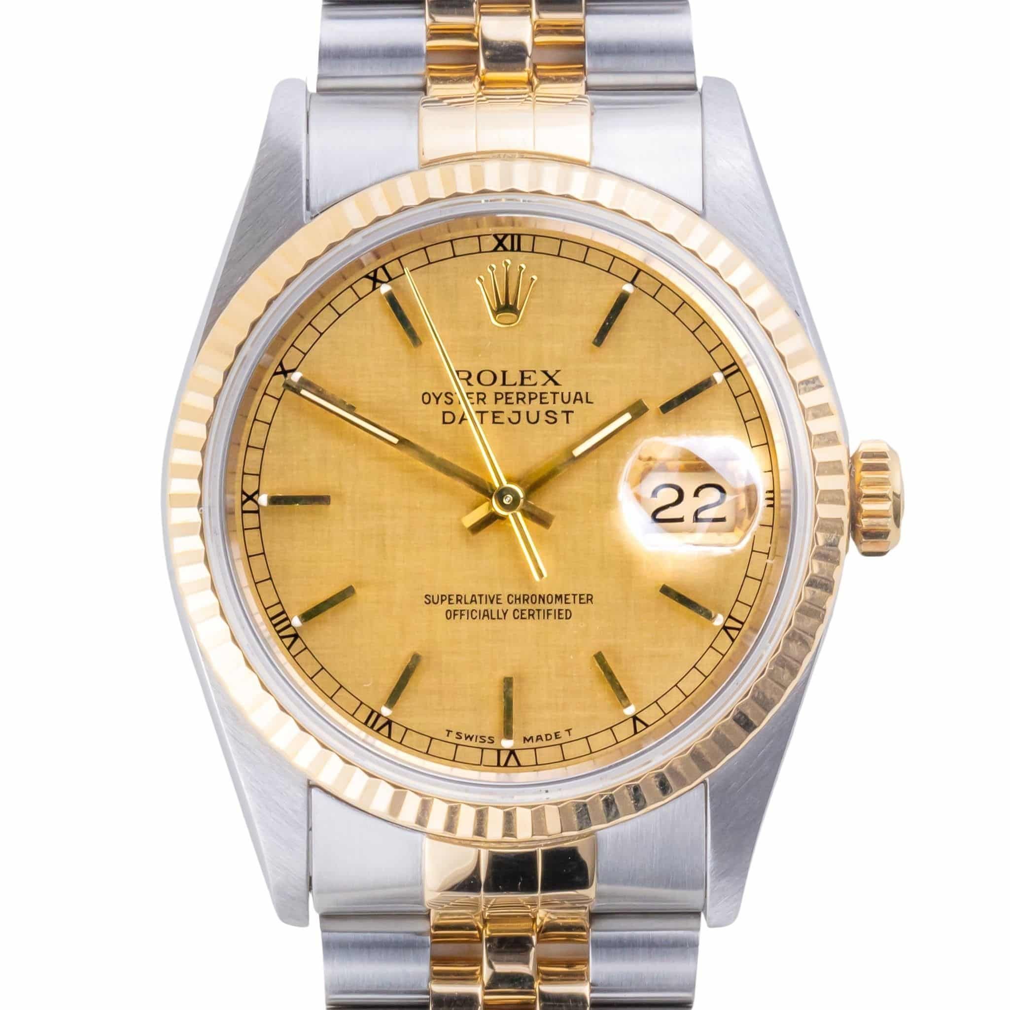 Rolex Oyster Perpetual Datejust reference 16233 from 1991 including full set. The Datejust 16233 measures a 36mm gold and stainless steel case, two-tone Jubilee bracelet and fluted 18k gold bezel. This Datejust 16233 features an automatic movement caliber 3135 with a quickset date function, a scratch resistance sapphire crystal and a champagne linen dial with tritium hands.