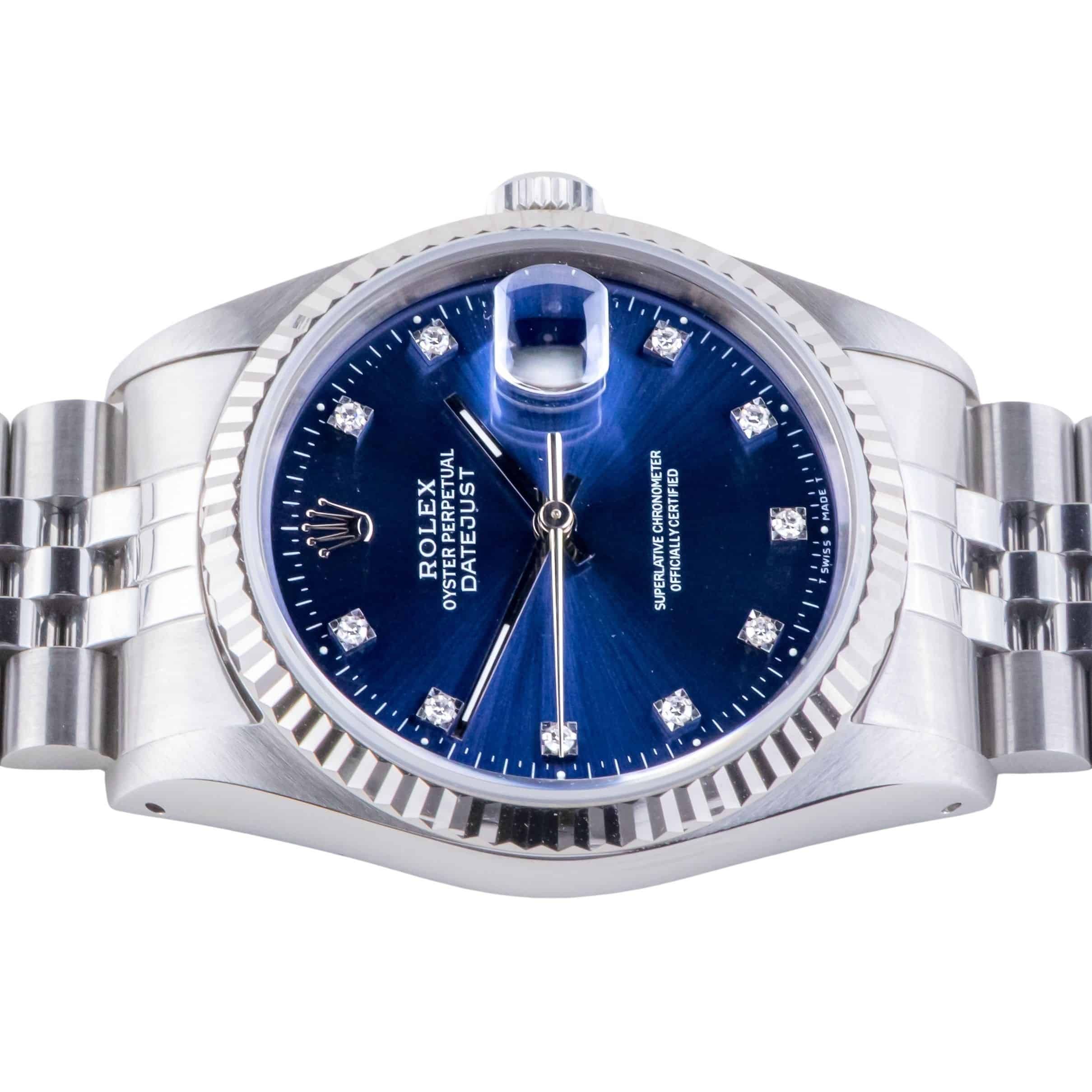 Rolex Oyster Perpetual Datejust reference 16234 from 1991 including full set. The Datejust 16234 Datejust measures a 36mm stainless steel case, a stainless steel Jubilee bracelet and a fluted 18k white gold bezel. This Datejust 16234 features an automatic movement caliber 3135 with quickset date function, a scratch resistance sapphire crystal and a blue stick dial with roman minute track.