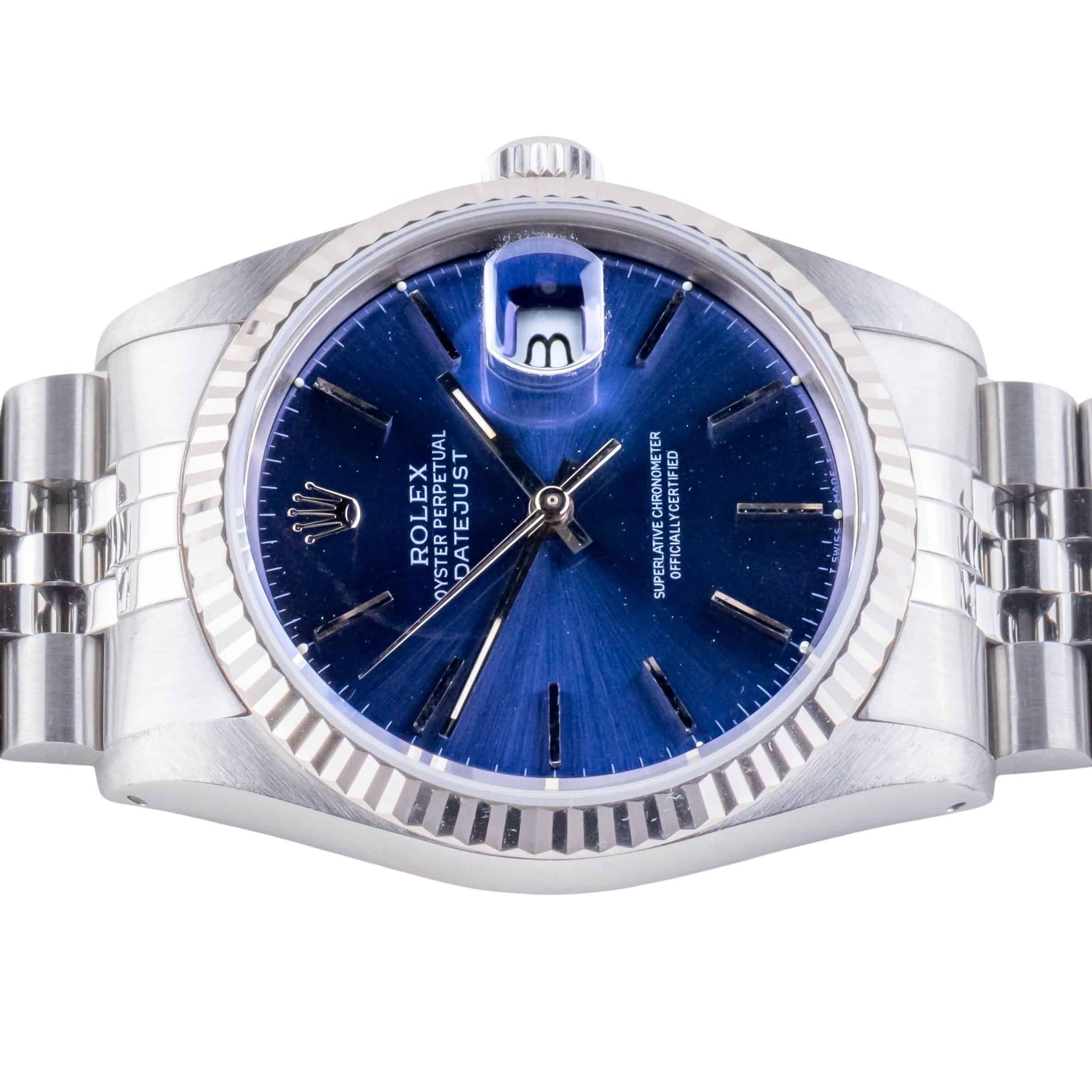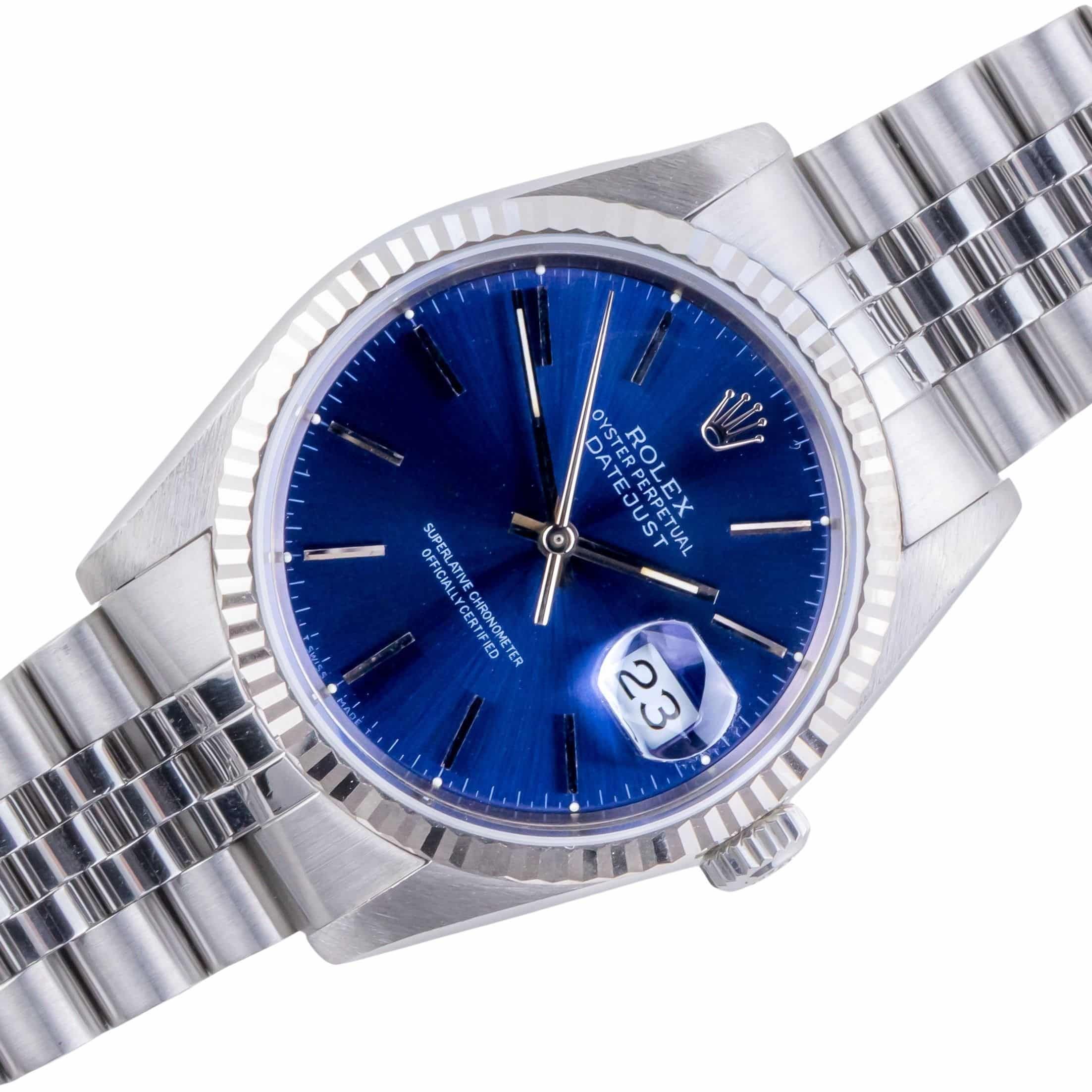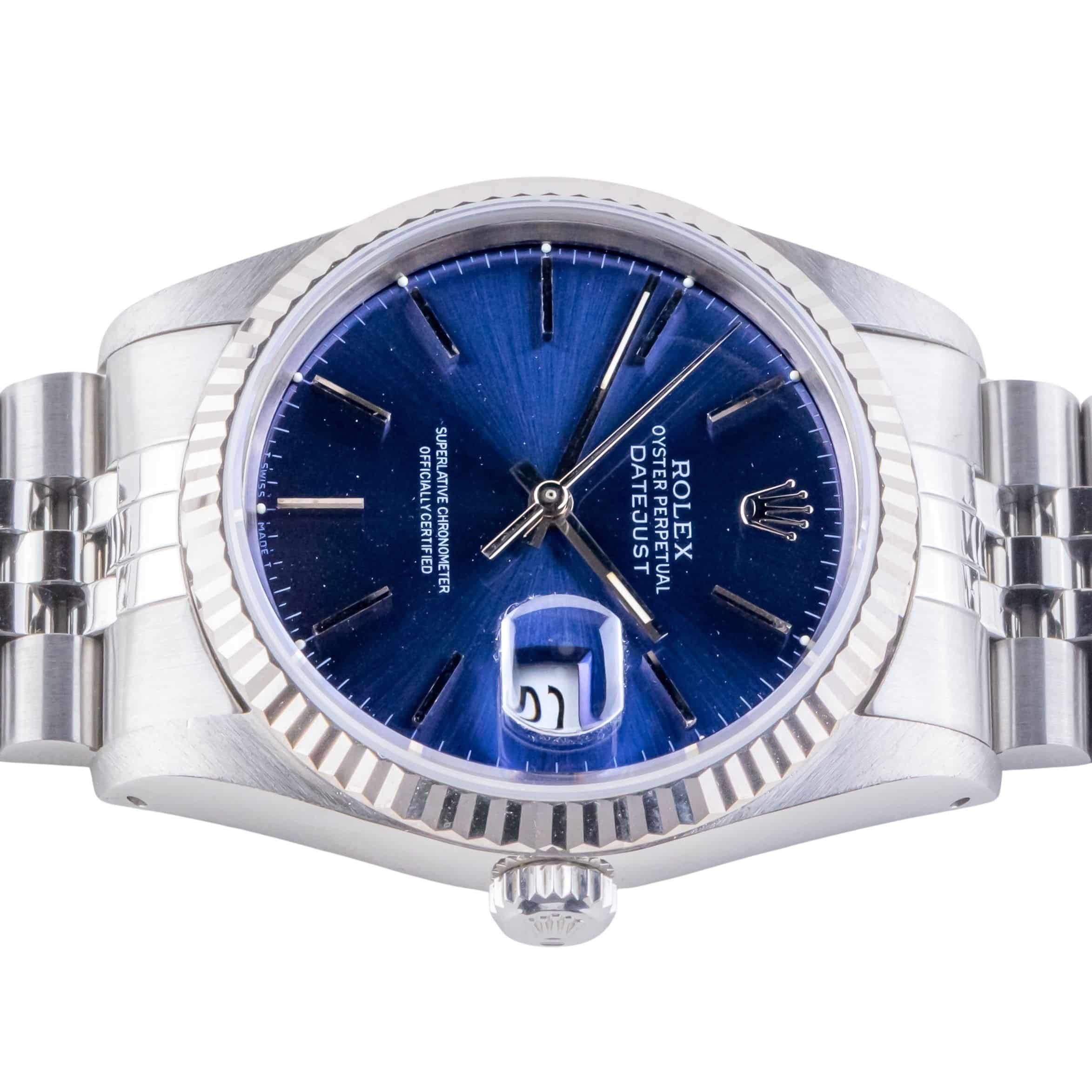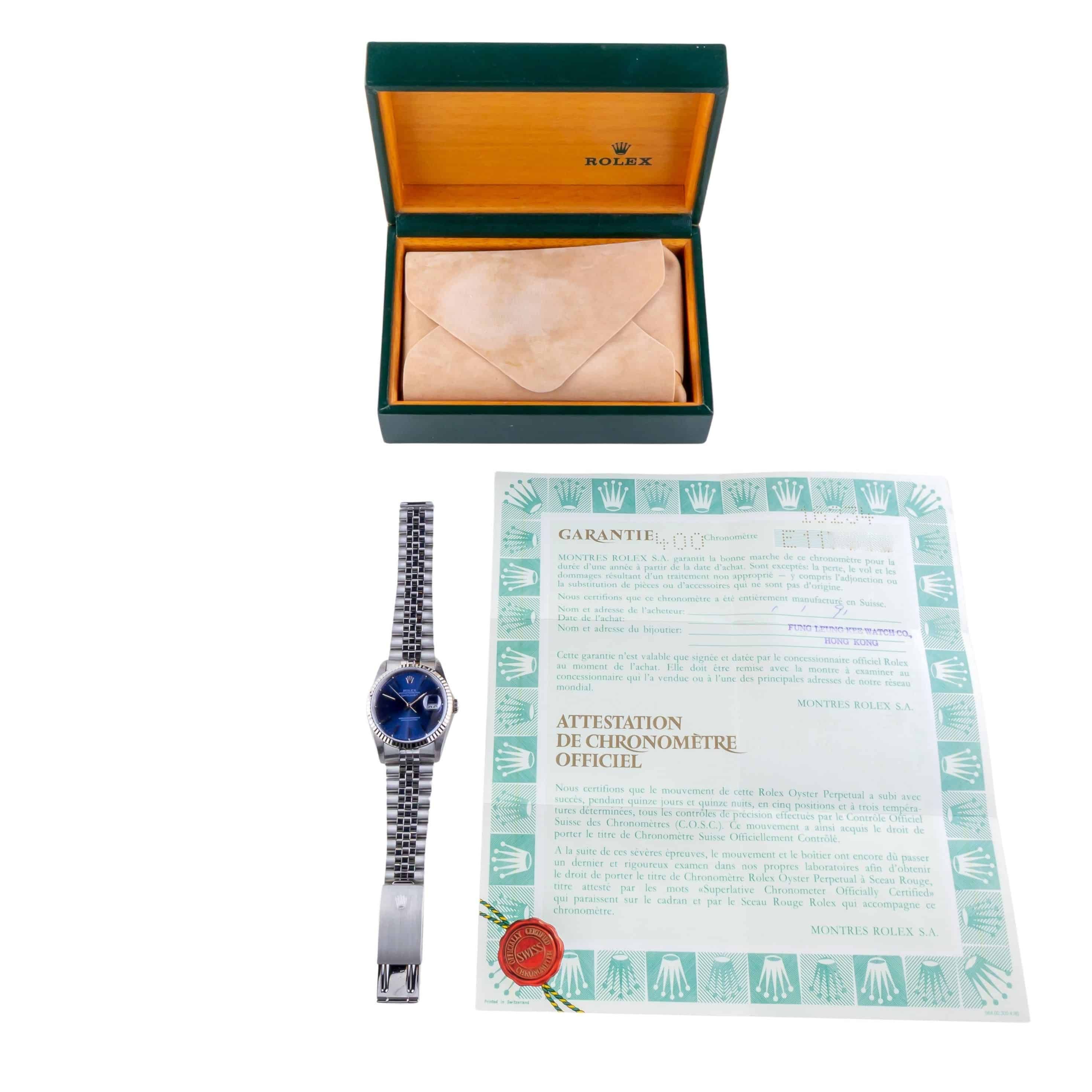 Rolex Oyster Perpetual Datejust reference 16234 from 1990 including full set. The Datejust 16234 Datejust measures a 36mm stainless steel case, a stainless steel Jubilee bracelet and a fluted 18k white gold bezel. This Datejust 16234 features an automatic movement caliber 3135 with quickset date function, a scratch resistance sapphire crystal and a blue stick dial with roman minute track.