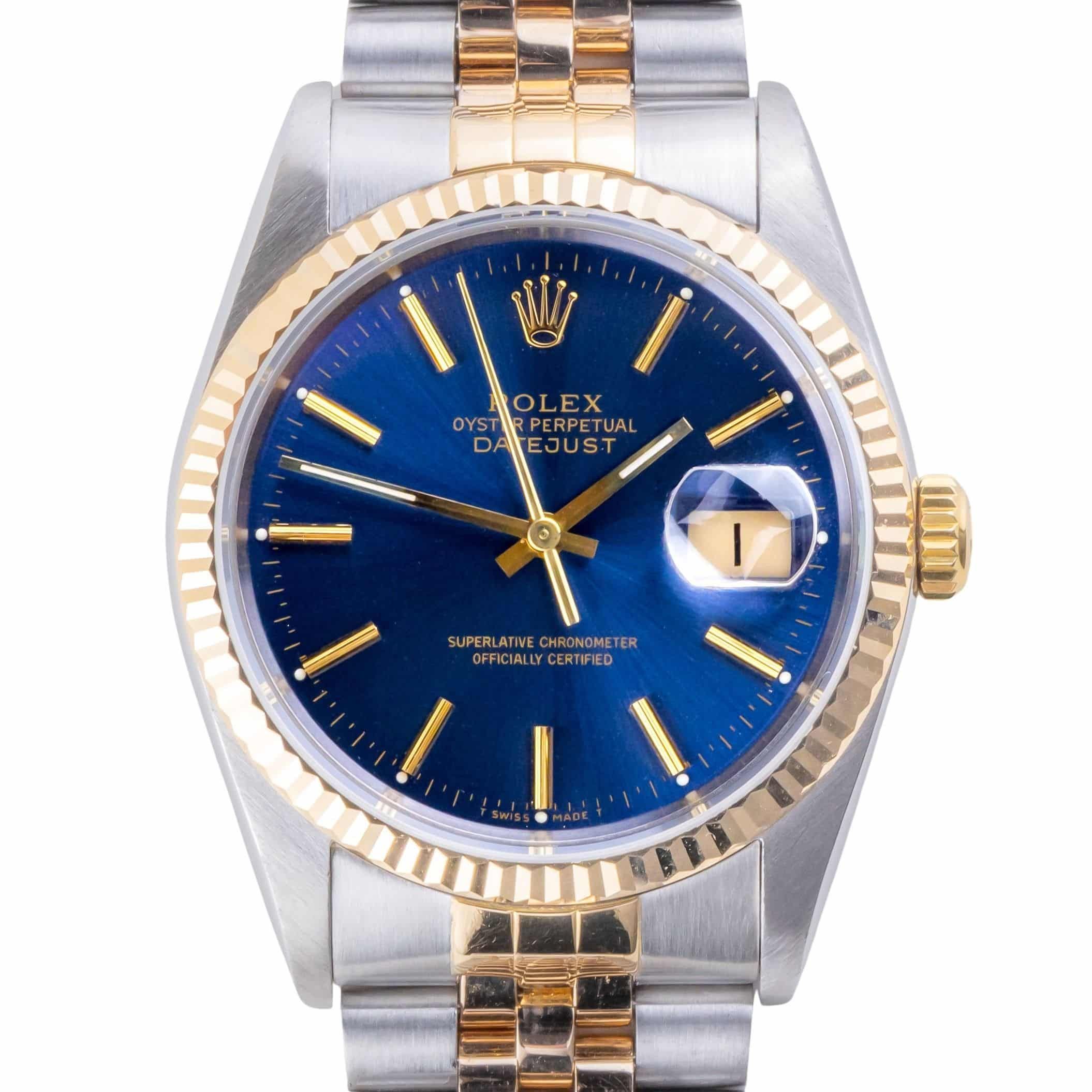 Rolex Oyster Perpetual Datejust reference 16233 from 1990 including full set. The Datejust 16233 measures a 36mm gold and stainless steel case, two-tone Jubilee bracelet and fluted 18k gold bezel. This Datejust 16233 features an automatic movement caliber 3135 with a quickset date function, a scratch resistance sapphire crystal and a blue dial with tritium hands.