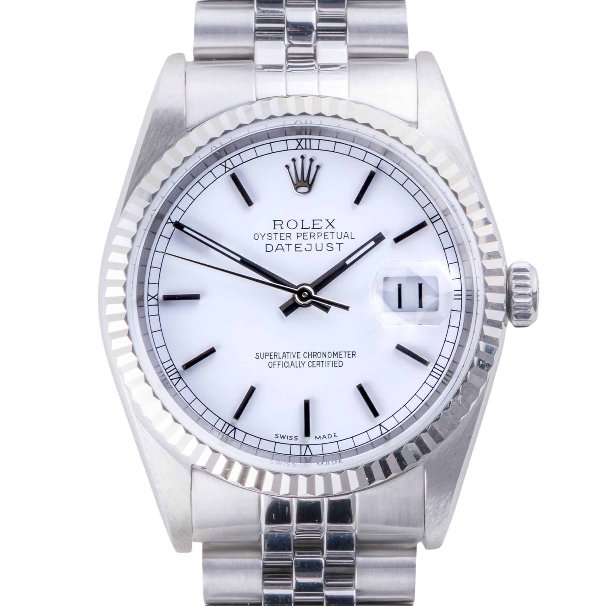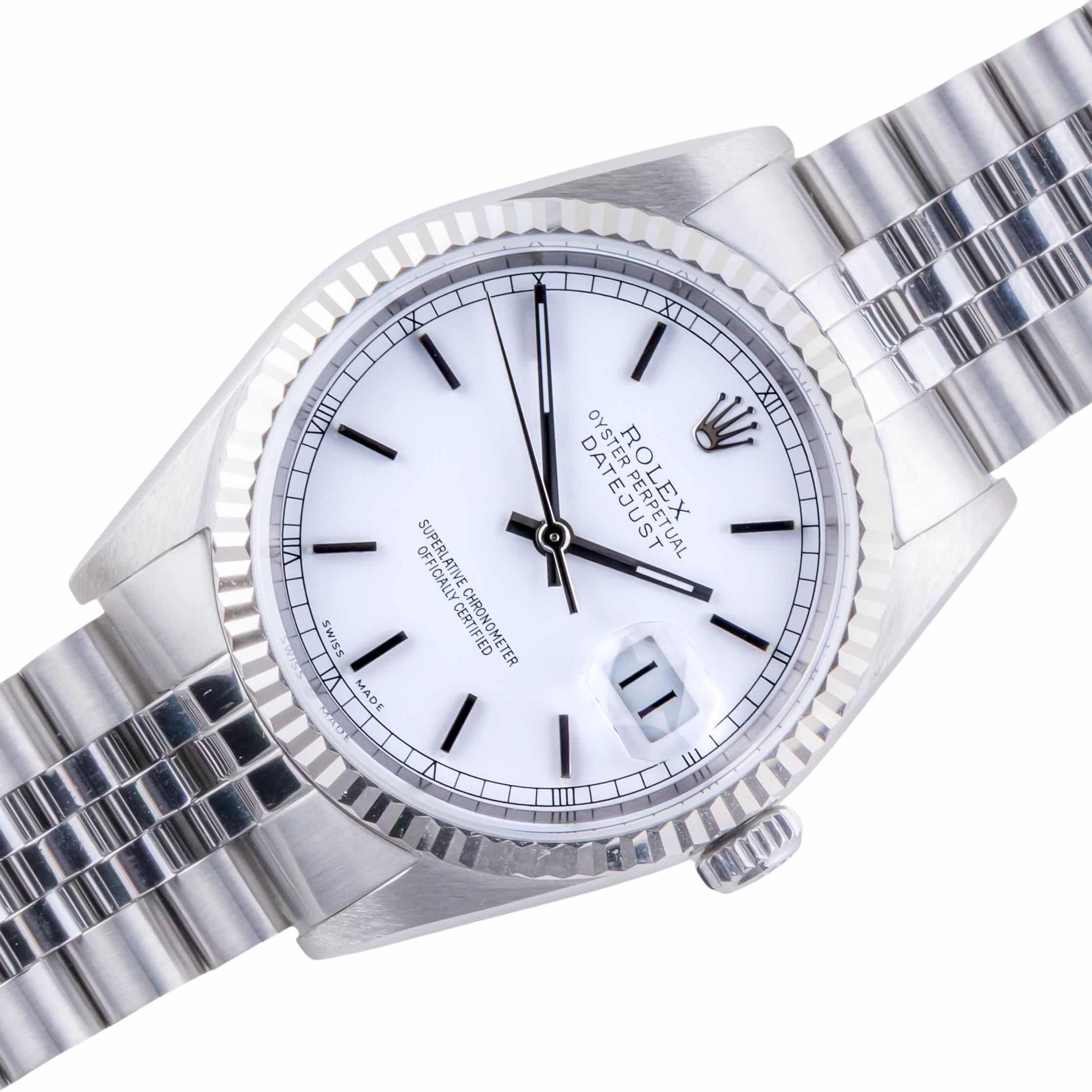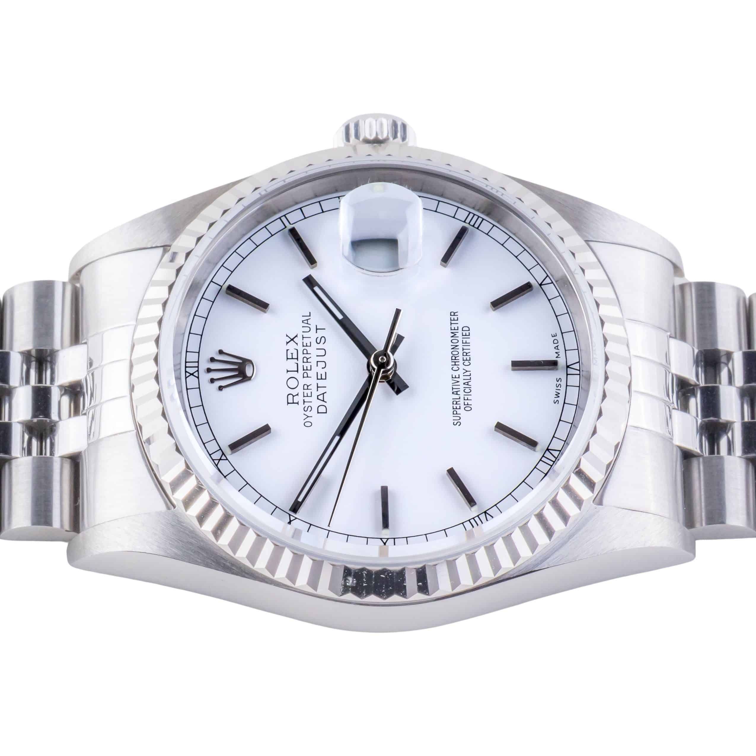 Rolex Oyster Perpetual Datejust reference 16234 from 1997 including full set. The Datejust 16234 Datejust measures a 36mm stainless steel case, a stainless steel Jubilee bracelet and a fluted 18k white gold bezel. This Datejust 16234 features an automatic movement caliber 3135 with quickset date function, a scratch resistance sapphire crystal and a white dial.