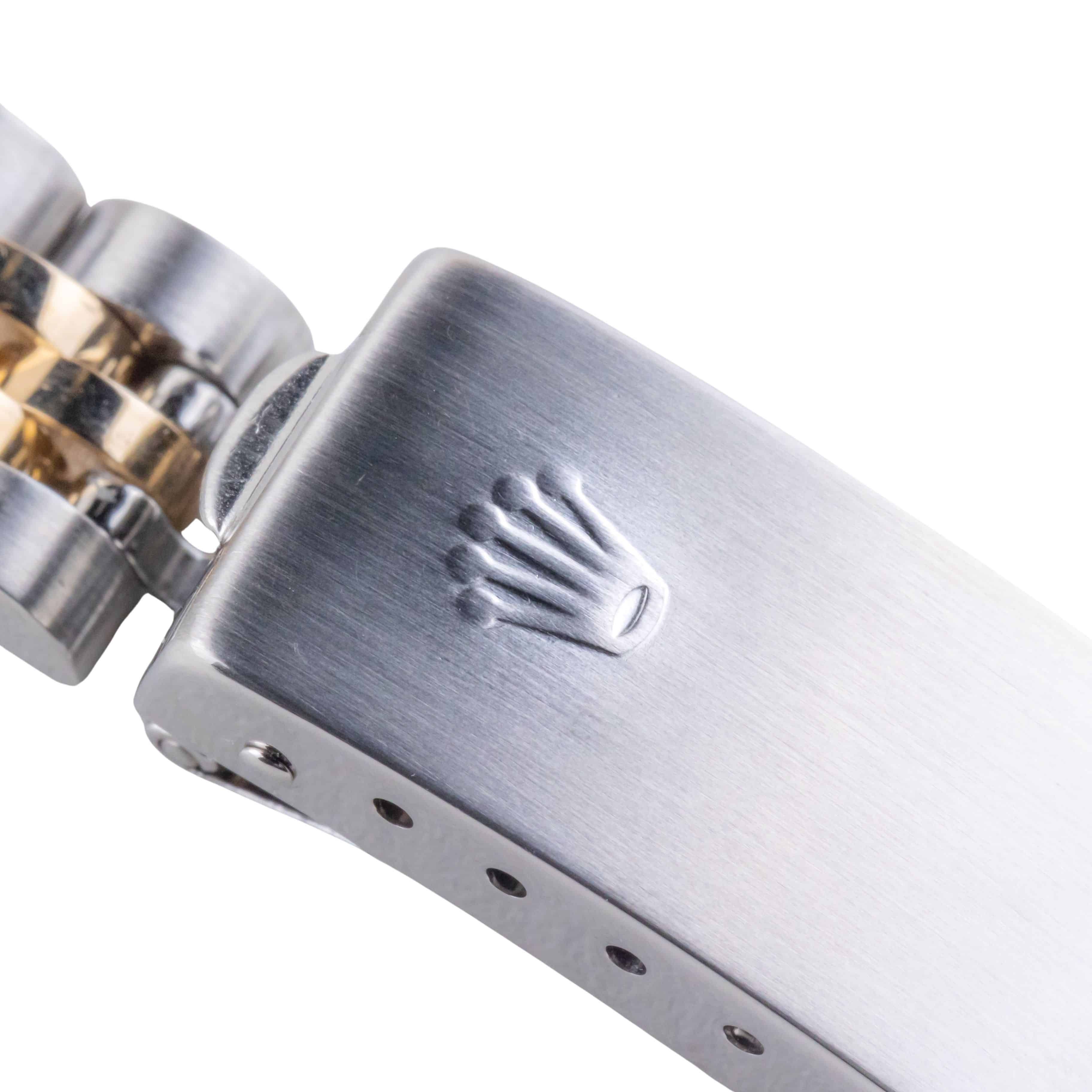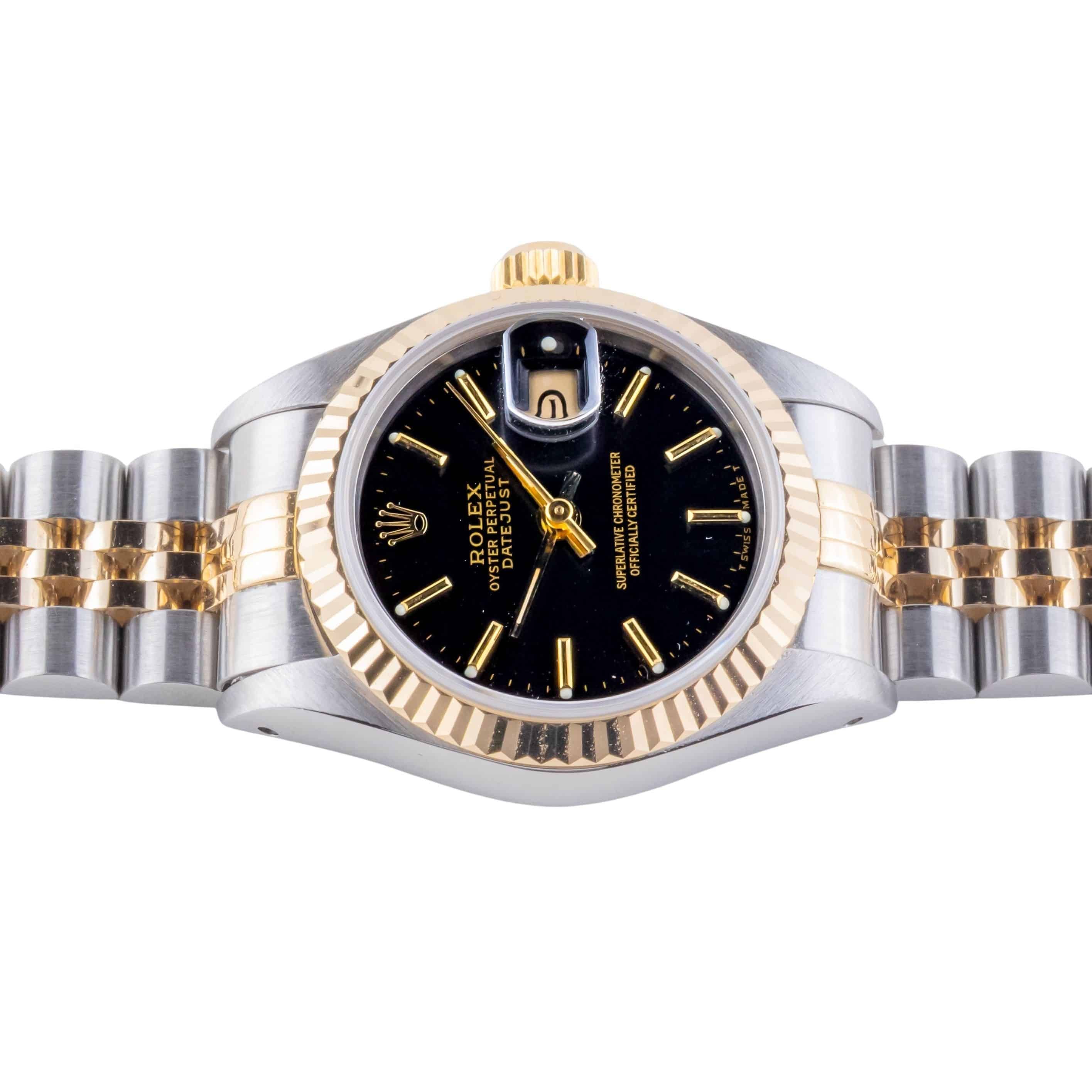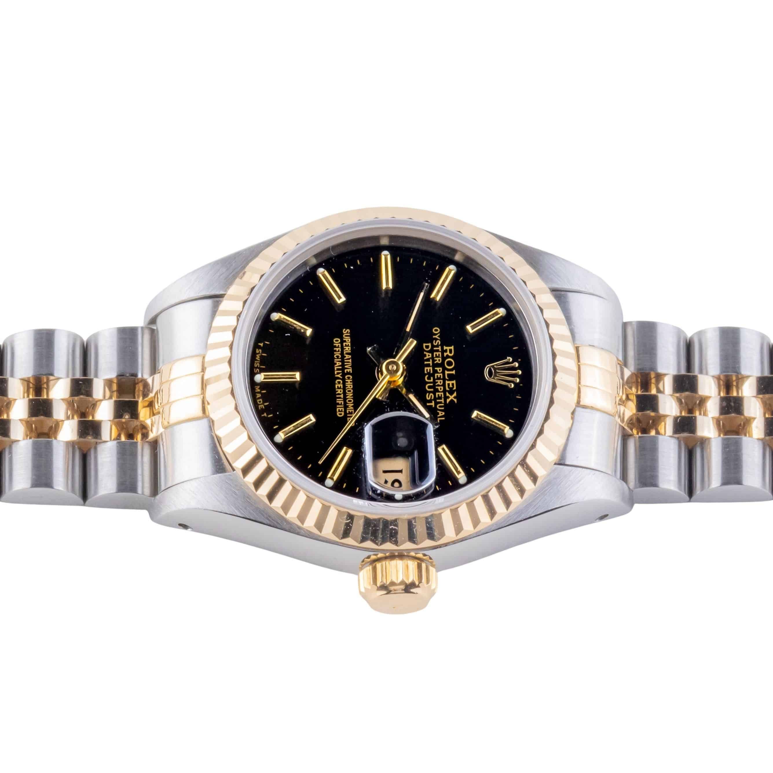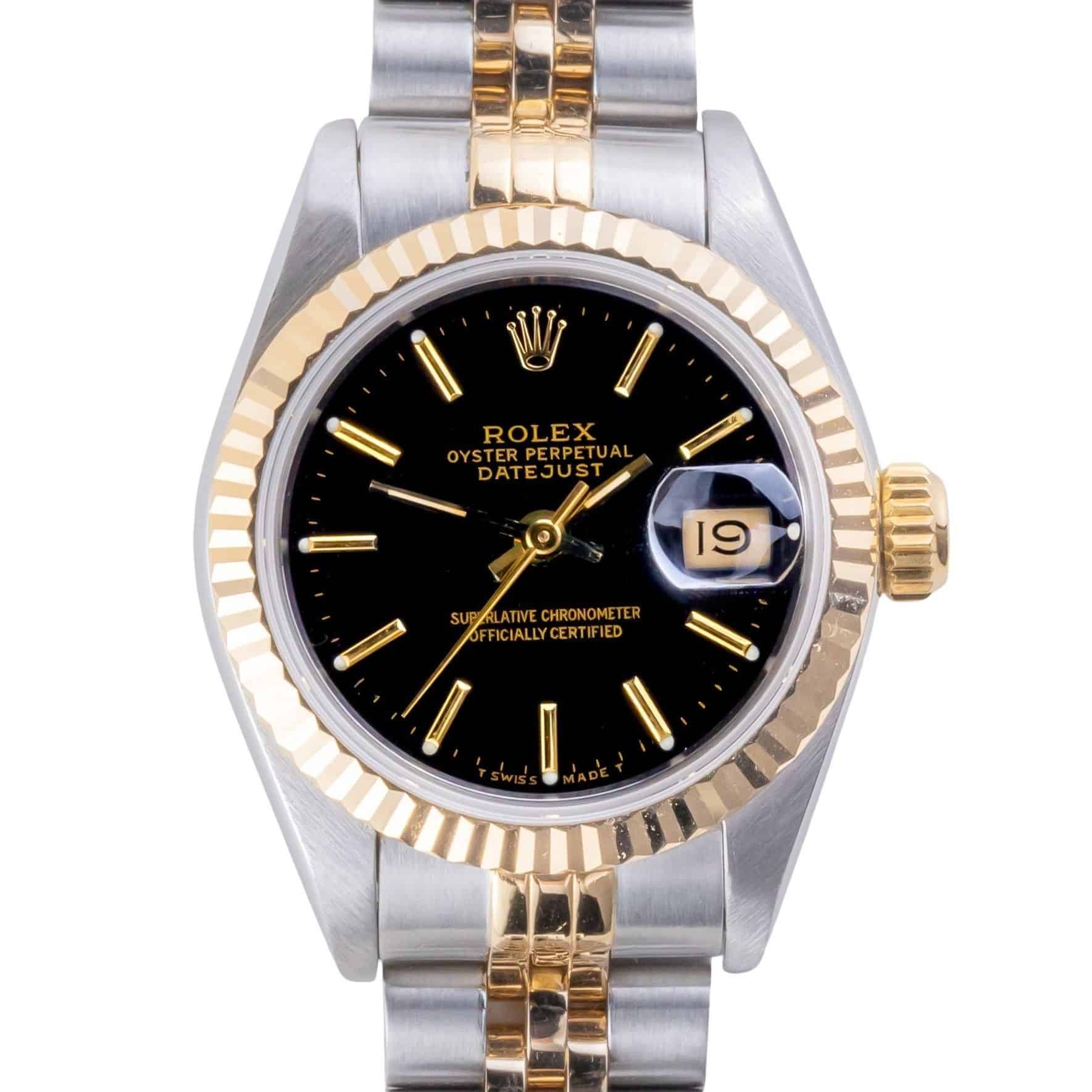 Rolex Oyster Perpetual Lady-Datejust reference 69173 from 1991 including full set. The Lady-Datejust 69173 measures a 26mm gold and stainless steel case, two-tone jubilee bracelet and fluted 14k gold bezel. This Lady-Datejust 69173 features an automatic movement caliber 2135 with quickset date function, a scratch resistance sapphire crystal and a black dial dial.