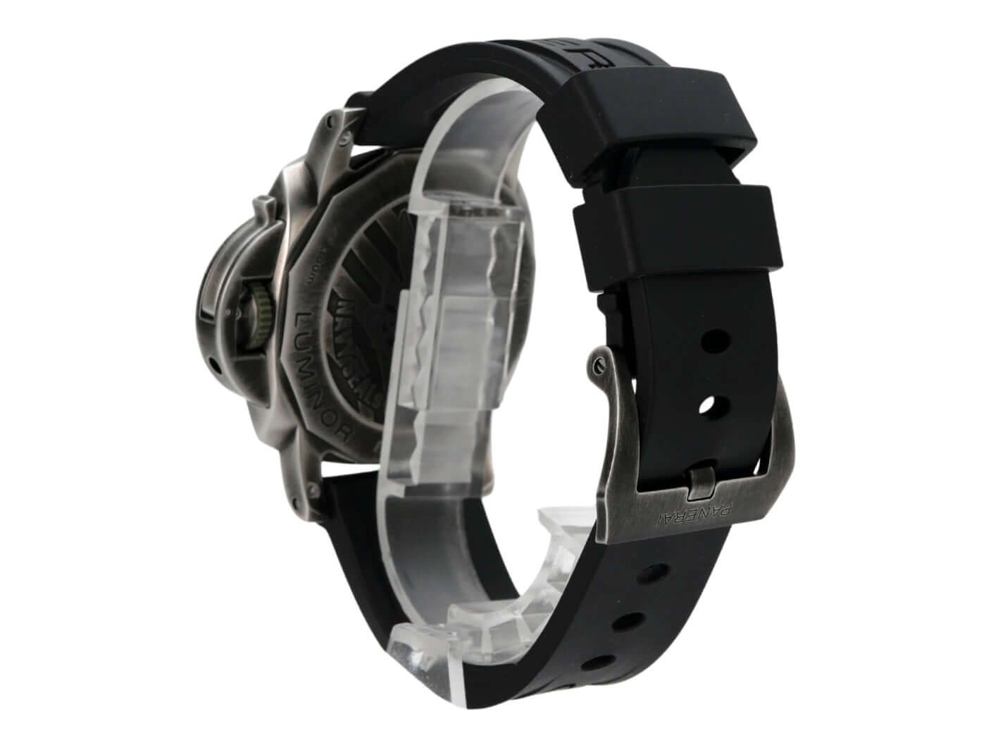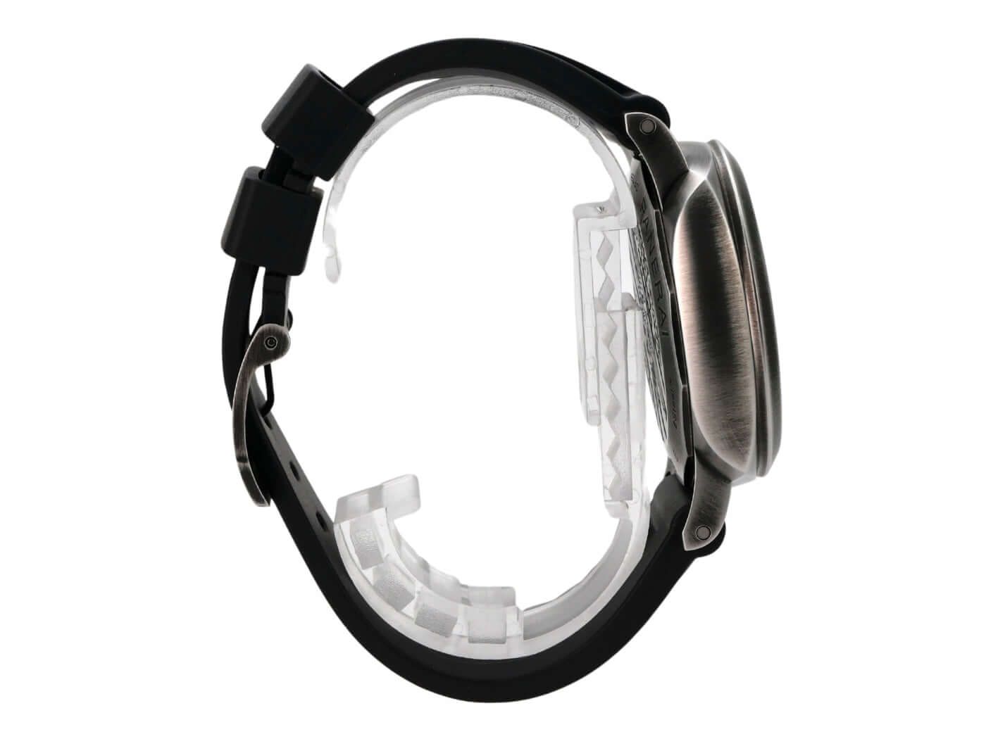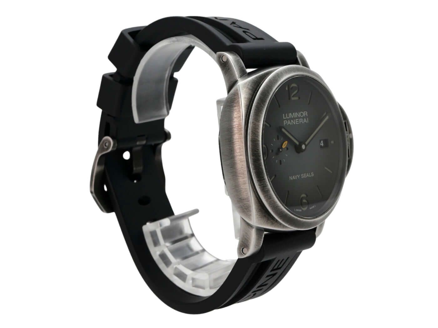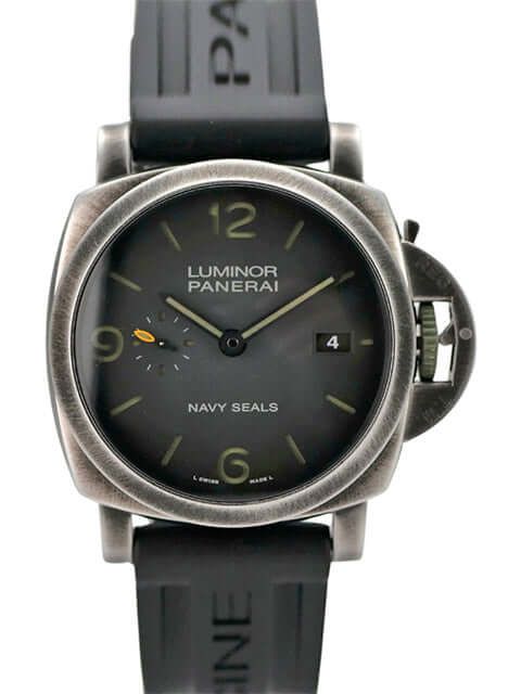 Panerai Luminor Marina Navy Seals Ref. PAM01412Case in Brunito steel, diameter 44 mm, black rubber strap with pin buckle in Brunito steel, satin-finished steel bezel, gray dial with luminous Arabic numerals and indexes, automatic movement, Panerai caliber P.9010, fully manufactured by Panerai, 31 jewels, 28,800 vibrations per hour, 72-hour power reserve, small seconds display, date display, crown protection bridge, anti-reflective sapphire crystal made of corundum, engraved case back, water-resistant up to 10 bar.