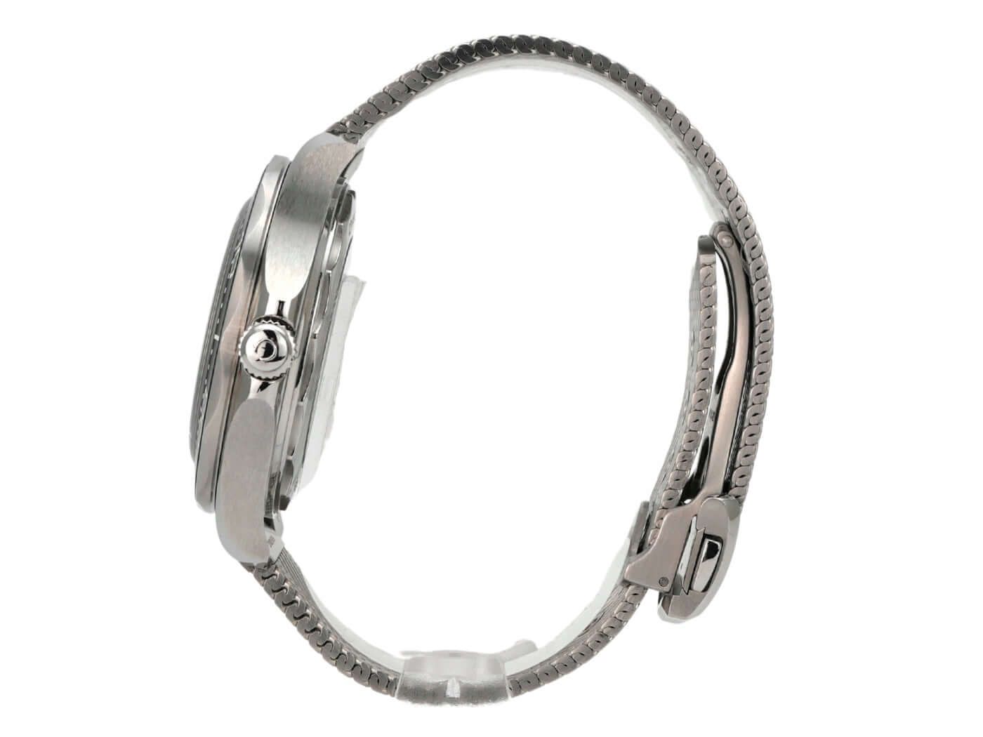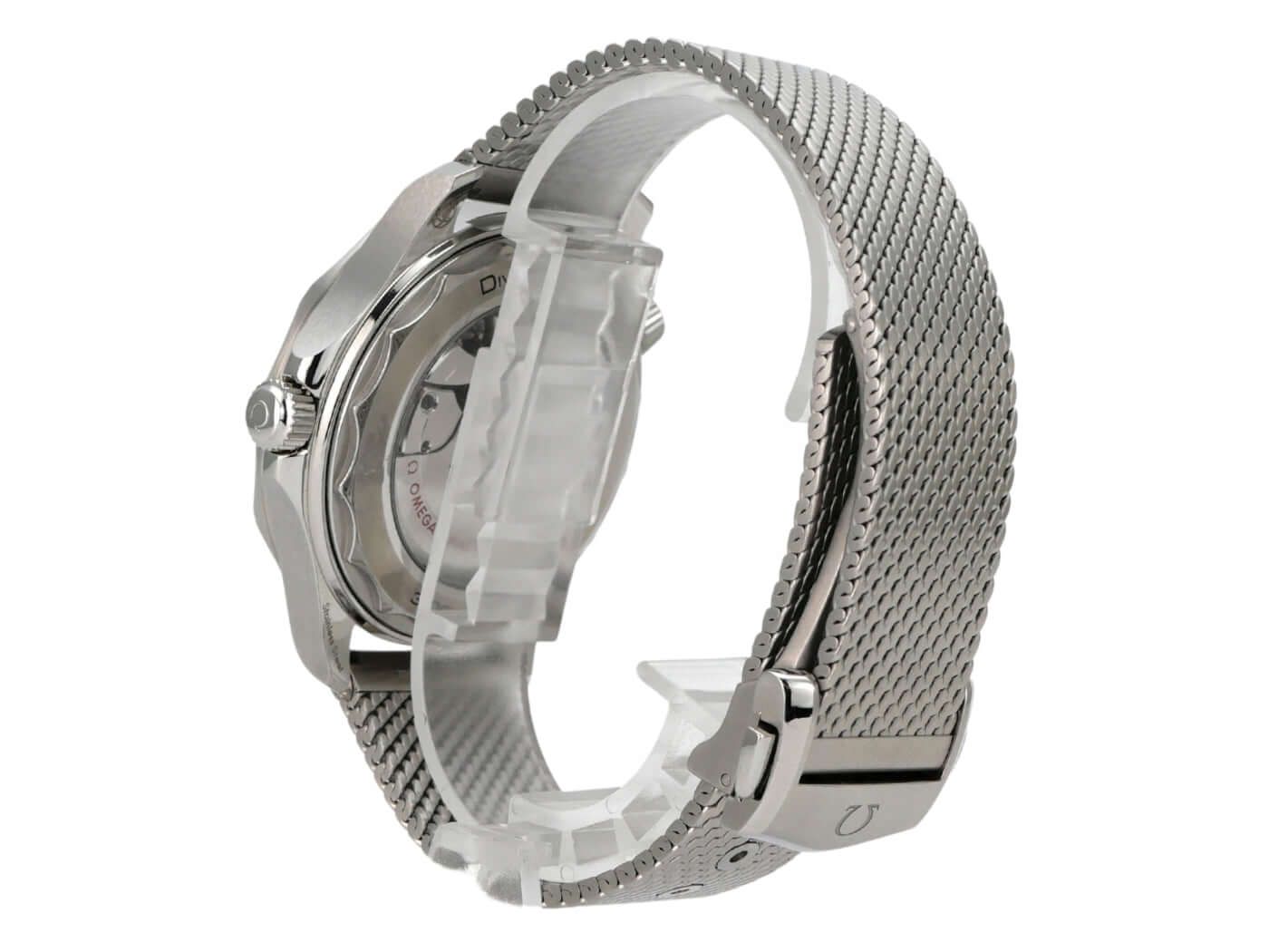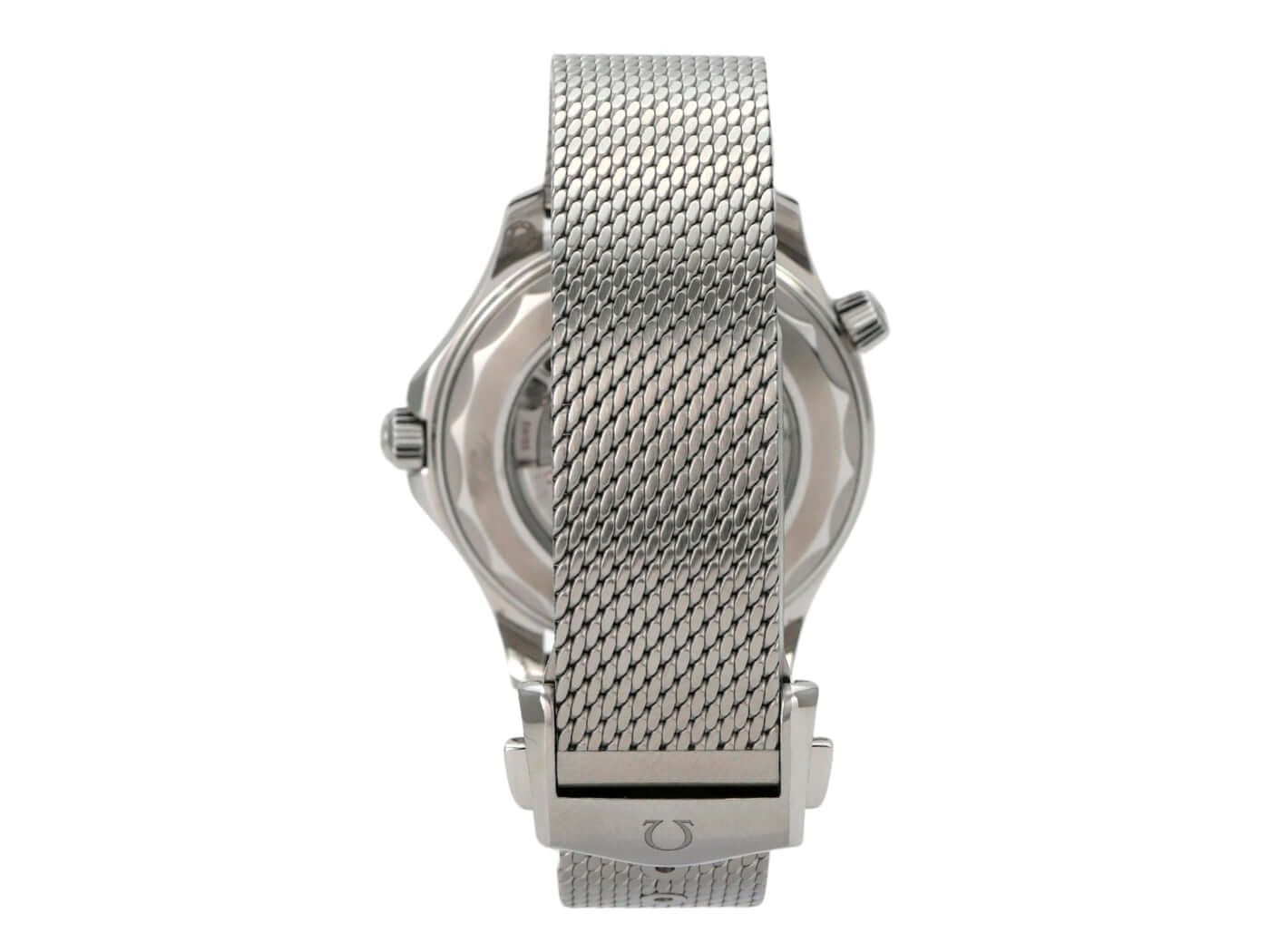 Case made of polished and satin-finished stainless steel, case diameter 42 mm, stainless steel bezel with black ceramic insert, 60-minute scale and luminous dot, unidirectional rotating, satin-finished Milanese bracelet with folding clasp, black dial with applied luminous indices and luminous dots, skeletonized luminous hands, automatic movement, Omega caliber 8800 with Co-Axial escapement, 35 jewels, 25,200 vibrations per hour, approximately 55-hour power reserve, date, chronometer, helium valve, domed and scratch-resistant sapphire crystal, double-sided anti-reflective coating, screw-down crown with flank protection, screw-down stainless steel case back with viewing window, water-resistant up to 30 bar.