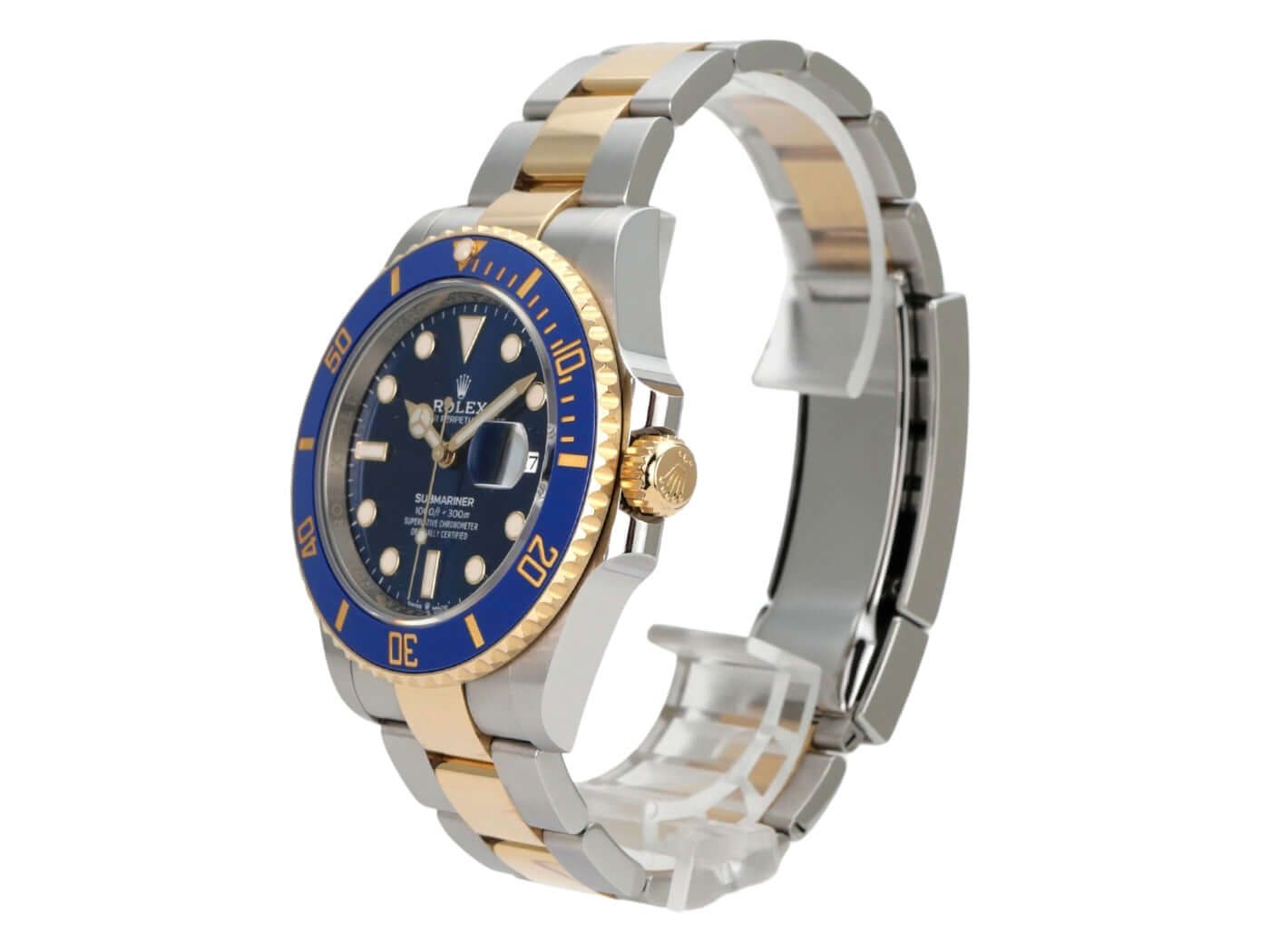 Case made of polished and satin-finished stainless steel, case diameter 41 mm, case height 12.5 mm, fluted bezel made of 18-carat yellow gold with blue ceramic insert, 60-minute scale and luminous dot, rotatable, Oyster stainless steel / 18-carat yellow gold bracelet polished and satin-finished with safety folding clasp, blue dial with applied luminous indices and luminous dots, luminous hands, automatic movement, Rolex caliber 3235 with 31 jewels, 28,800 A/h, 70-hour power reserve, date display with quick adjustment and magnifier, chronometer, sapphire crystal, screw-down crown with crown guards, screw-down stainless steel case back, water-resistant up to 30 bar.