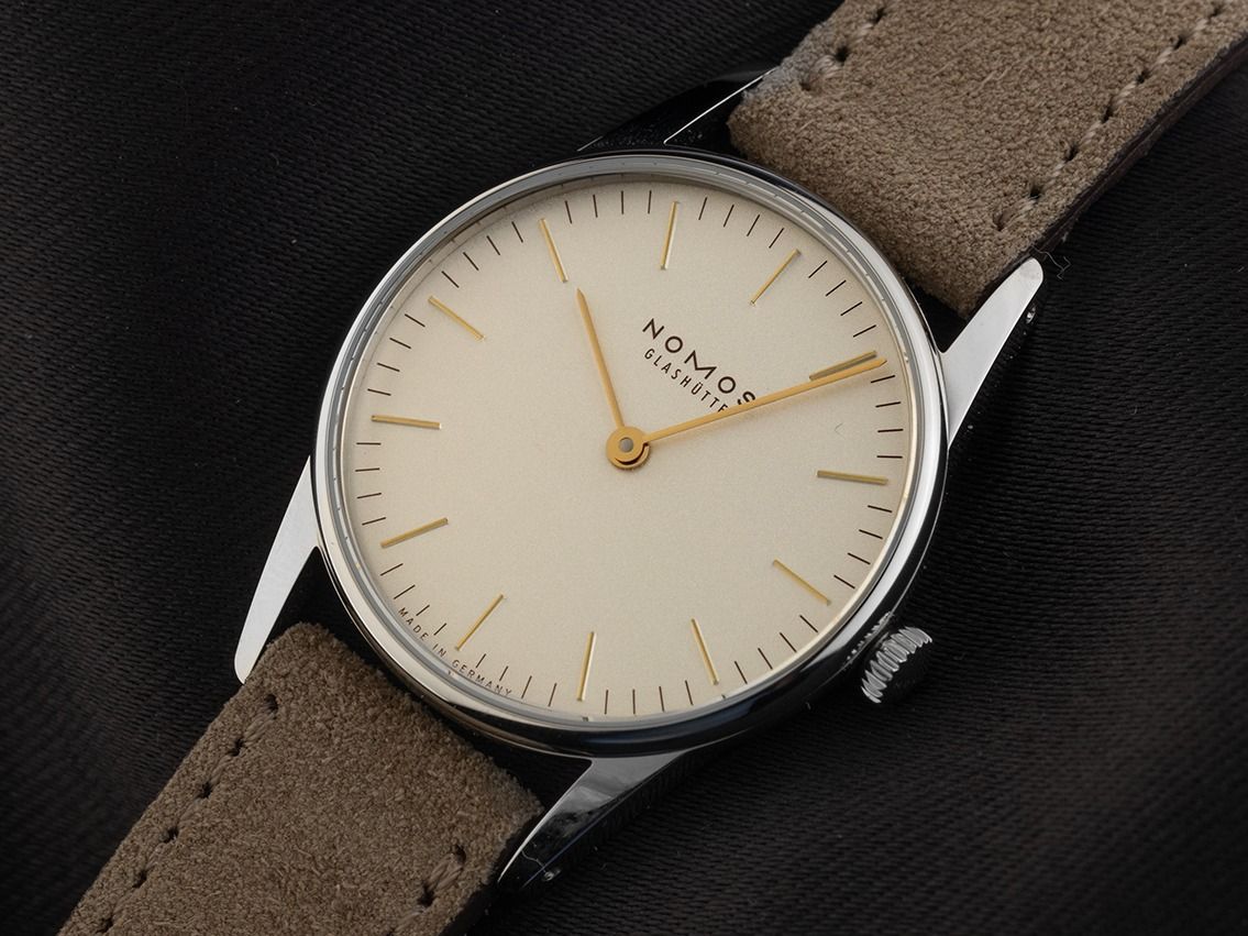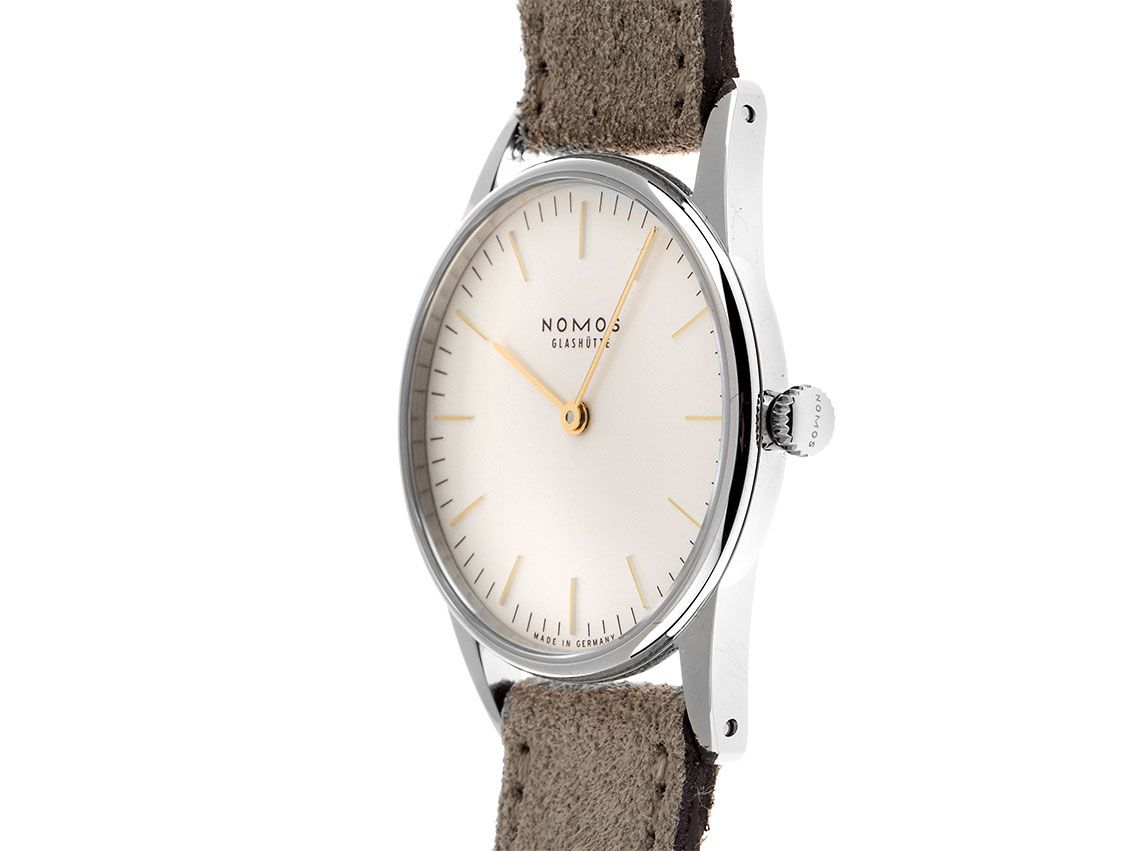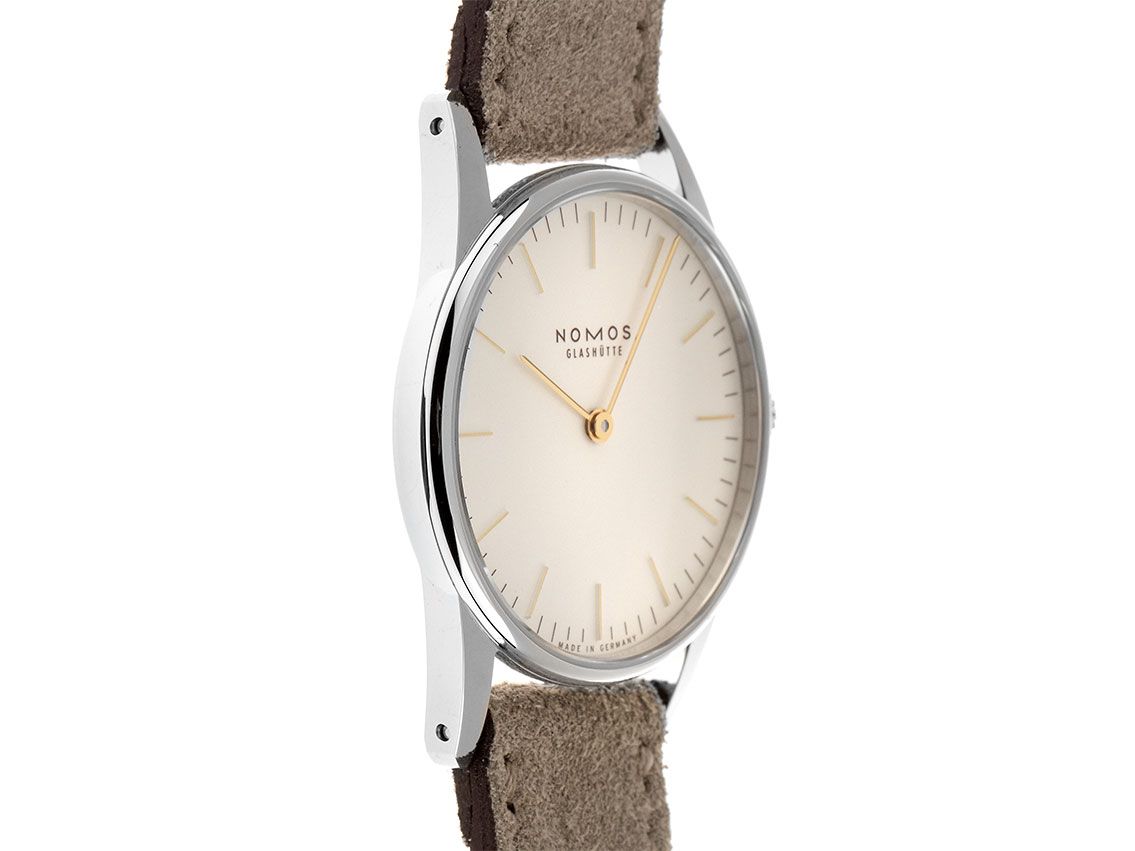 Gehäuse Edelstahl poliert, Gehäusedurchmesser ohne Krone 32,8mm, Gehäusehöhe 7,6mm. Armband Veloursleder beige mit Ziernaht, Anstoßbreite 17mm, Stiftschließe Edelstahl mit Hersteller-Logo. Zifferblatt weiß versilbert und galvanisiert mit aufgesetzten gelbgoldenen Indexen und gelbgoldenen Zeigern. Uhrwerk Handaufzug, Nomos Manufakturkaliber Alpha mit 17 Edelsteinen. Anzeige von Stunde und Minute über Zeiger aus der Mitte. Saphirglas kratzfest. Krone mit Hersteller-Logo. Boden Edelstahl graviert. Gewicht der Uhr inklusive Armband 36g. Wasserdicht bis 3 ATM. Referenznummer: 319, ID: ST610218240426H-1600, Artikelnummer: 10000085474. Original Nomos Box mit Umkarton und Garantie Papiere von April 2026, Full Set. Neu. Lieferzeit sofort.