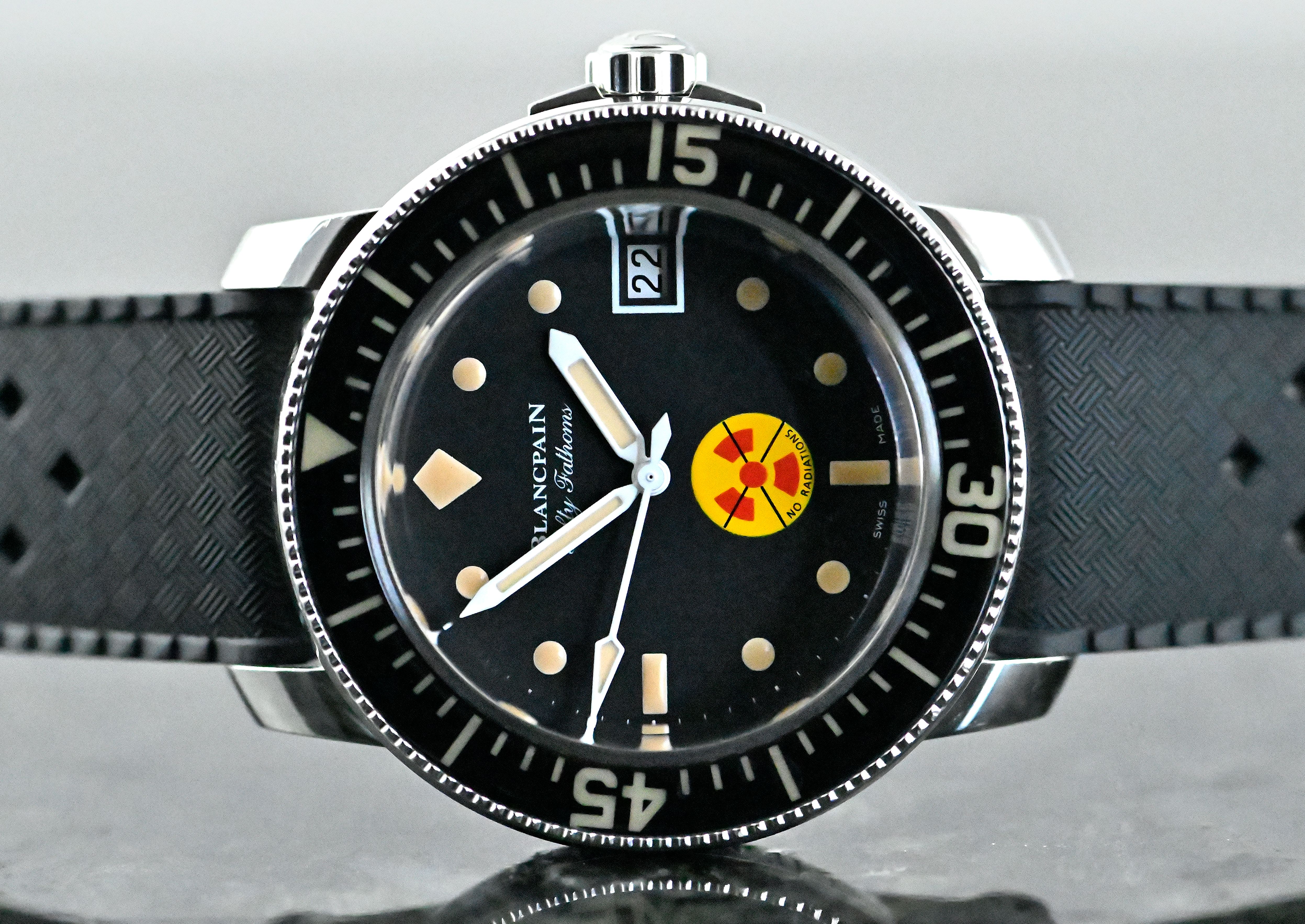 Limited Blancpain Fifty Fathoms No Rad / No Radiation | reference 5008D-1130-B64A / 5008D 1130 B64A | in steel | Blancpain Automatic Caliber 1151 | produced in a limited edition of only 500 pieces, this watch has the limited edition number 10x / 500 | No Radation dial gives the watch a unique vintage look that evokes the original from the 1960s | diameter of 40.3 mm | original Blancpain rubber strap and the original Blancpain steel buckle | very good condition with minimal signs of wear — the glass has a minor scratch | full set with the following accessories: original Blancpain box / case with outer carton and watch pouch, as well as a cardboard slipcase with a numbered sticker - original Blancpain warranty certificate (sold on May 26, 2021 in Genoa - Italy) - Limited edition certificate (not shown in the photos) - original hangtag with reference and limited edition number - service book - diver’s logbook - instruction manual.
