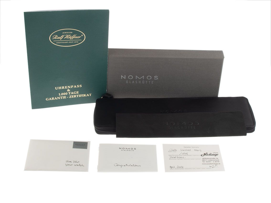 Gehäuse Edelstahl poliert, Gehäusedurchmesser ohne Krone 40mm, Gehäusehöhe 9,7mm. Nomos Armband Textil dunkelblau, Anstoßbreite 20mm, Stiftschließe Edelstahl mit Hersteller-Logo. Zifferblatt Navy Blue mit arabischen Leuchtziffern und Leuchtindexen sowie Edelstahl Leuchtzeigern. Uhrwerk Automatik, Manufakturkaliber Nomos DUW 5001 mit 26 Edelsteinen. Anzeige von Stunde und Minute über Zeiger aus der Mitte, kleine Sekunde mit Sekundenstopp zur sekundengenauen Einstellung der Uhrzeit bei 6 Uhr. Saphirglas kratzfest. Krone mit Hersteller-Logo. Boden Edelstahl verschraubt und graviert mit Saphirglas Sichtfenster. Gewicht der Uhr inklusive Armband 64g. Wasserdicht bis 20 ATM. Referenznummer: 753.S2, ID: ST610223520426H-1960, Artikelnummer: 10000085475. Original Nomos Box mit Umkarton und Garantie Papiere von April 2026, Full Set. Limitiert auf 175 Exemplare. Neu. Lieferzeit sofort.