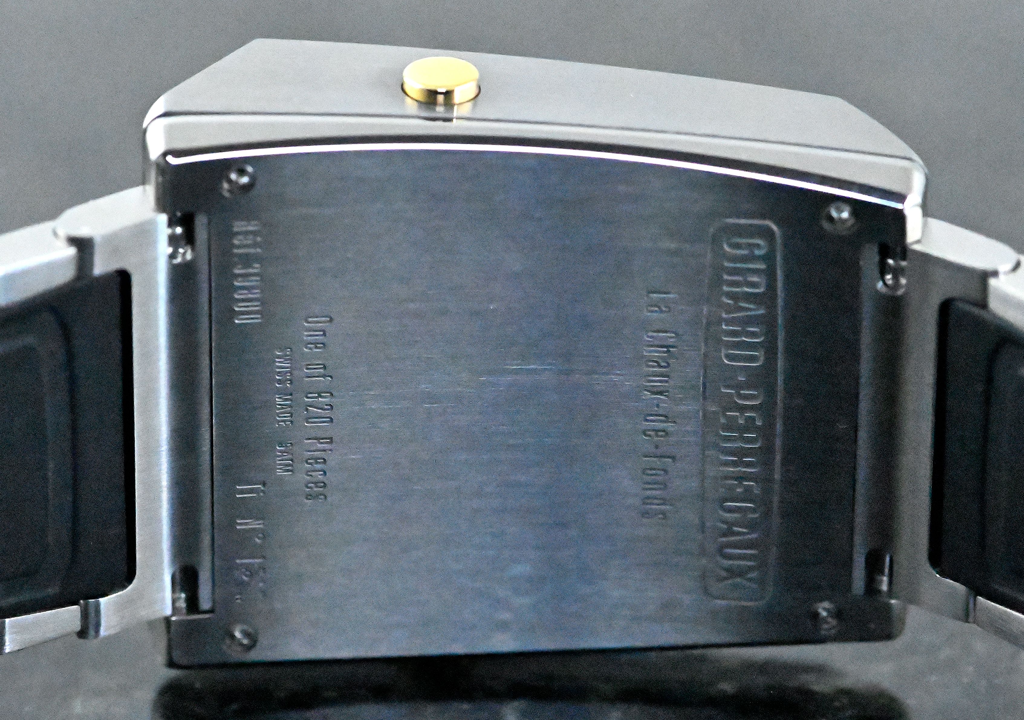Limited and stunning Girard Perregaux Casquette 2.0 | reference 39800-21-3199-6CM | in titanium and yellow gold | Girard Perregaux caliber GP3980-1474 | reissue of the original from the 1970s | limited edition of just 820 pieces | watch measures 42.40 x 33.60 mm | original GP titanium bracelet with the original titanium folding clasp | very good condition with minimal signs of wear | full set including: original Girard-Perregaux box and outer carton – original GP warranty certificate (sold on September 25, 2025 in Madrid - Spain) – original sales receipt – two disassembled components.