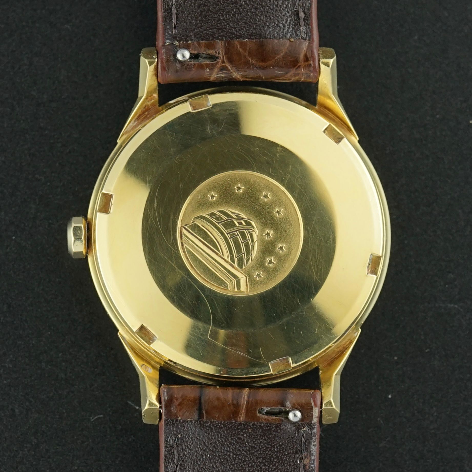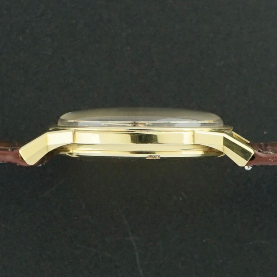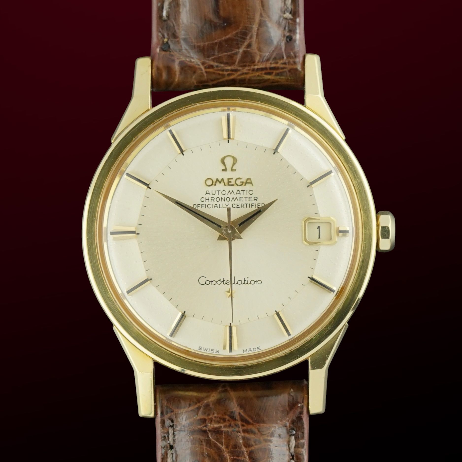 This vintage Omega Constellation from 1966 features a beautiful “Pie Pan” and “Dog Leg” design with a solid 18 carat yellow gold case and a white dial in beautiful condition, powered by the caliber 561 automatic movement which was serviced in April 2026 and now runs and functions great, the watch is paired with a top grain leather strap with a crocodile motif and a light glossy finish, and is accompanied by its original Omega Constellation deluxe box intended for solid gold models, correct to this reference, as well as the original purchase papers showing the serial number, the 18 carat gold specification and the original retailer Imhof S.A. Bijoux Montre, at the 4. Passage des Lions, in Genève with the first purchase date being September 20th 1966, the same year as production, additionally it includes the original strap and buckle both in great condition, making this a fully original and highly sought after collector’s piece with complete box and papers.