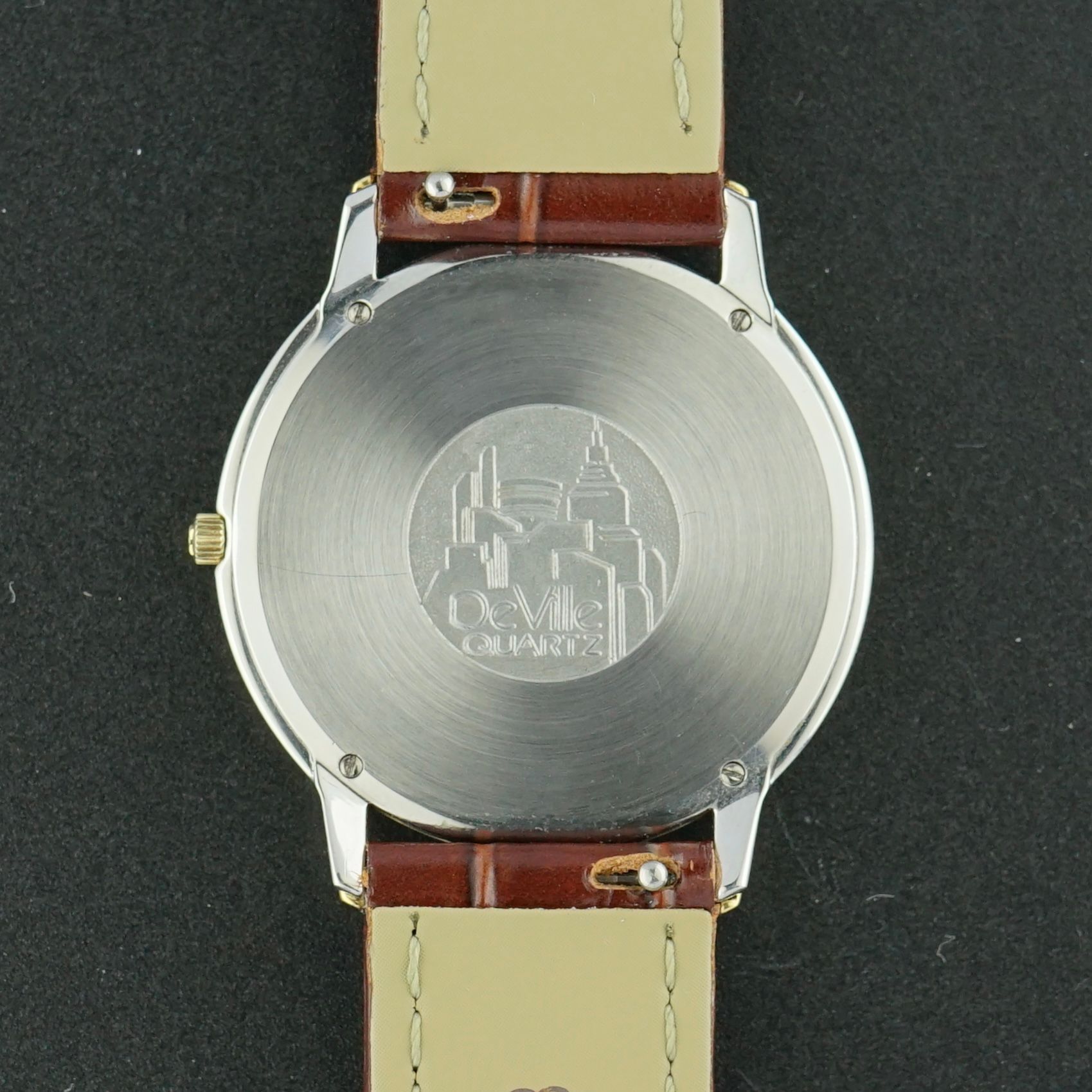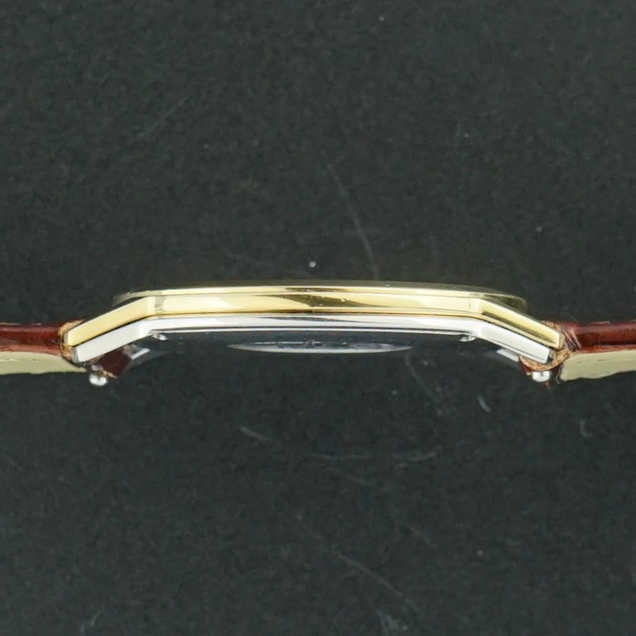 This vintage Omega De Ville from 1986 is a beautiful and quite uncommon piece, featuring a 33mm case diameter and a white dial in perfect condition. The design is particularly uncommon, as the upper and lower parts of the case are constructed as two separate components screwed together. With an ultra-slim thickness of just 4.1mm, it can certainly be considered a very thin watch. To complement this elegant profile, we have paired it with a non-padded leather strap made in France with a very thin construction, enhancing the overall aesthetic. The watch remains in very good condition and would make for an outstanding vintage piece.