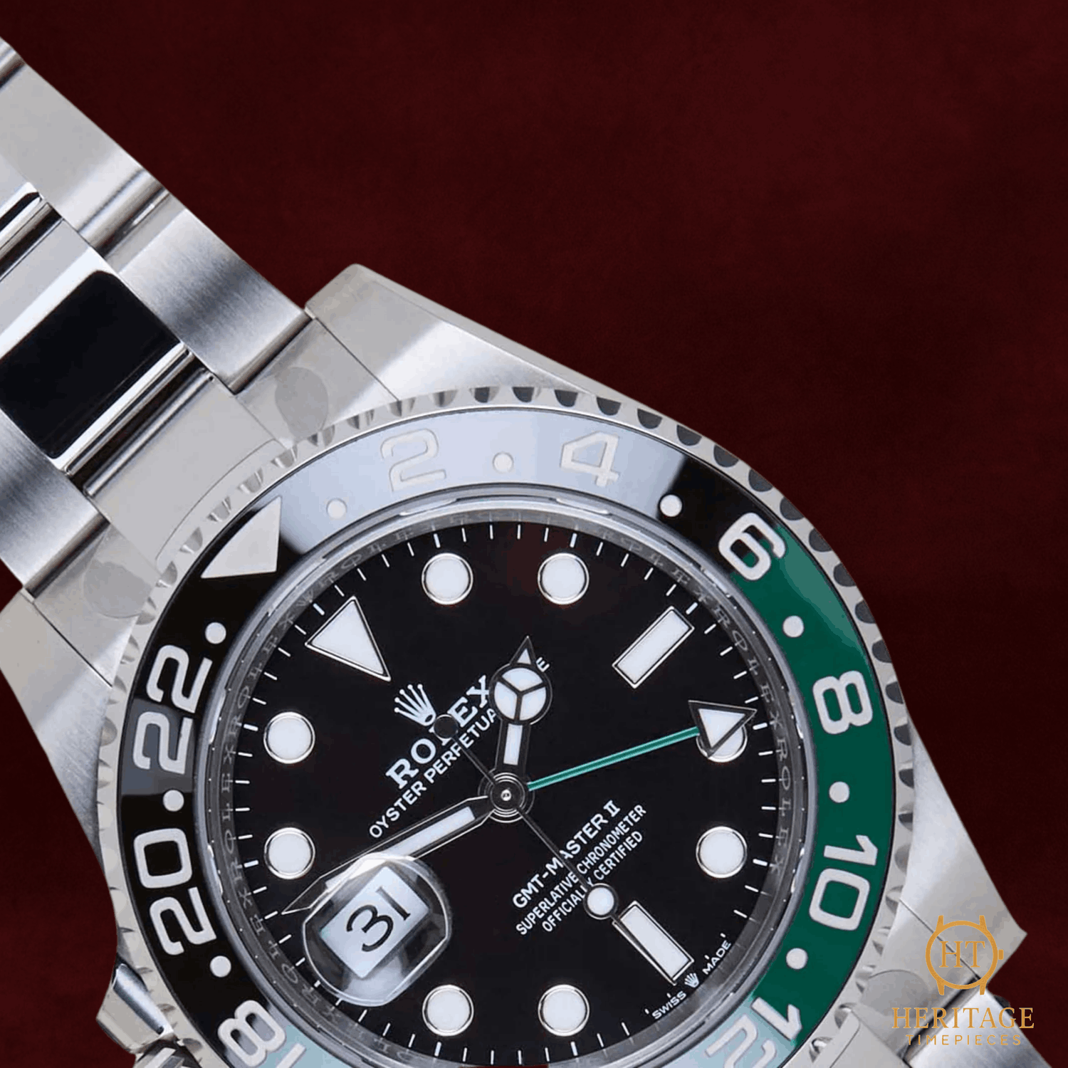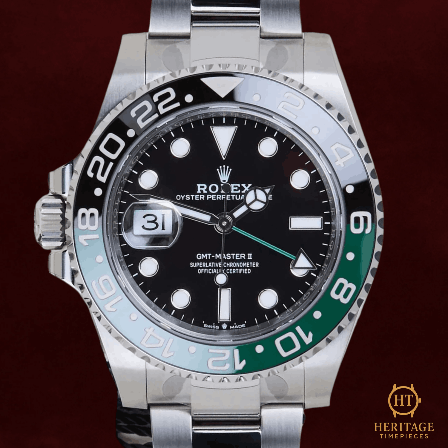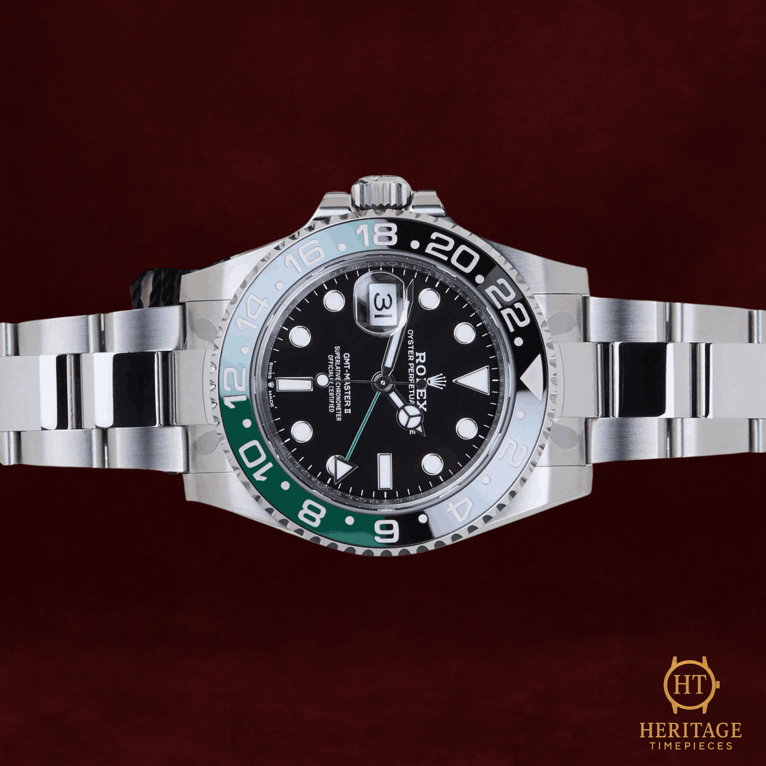Heritage Narrative The Rolex GMT-Master II reference 126720 VTNR marks one of the most unconventional and discussed releases in the modern history of the brand. Introduced in 2022, it was Rolex’s first GMT-Master II designed specifically for left-handed wearers, featuring the crown and date positioned on the left side of the case. This bold configuration challenged decades of tradition while reinforcing Rolex’s willingness to innovate within its most iconic collections. This September 2025 example is presented in unworn condition, partly stickered, and showcases the instantly recognizable green and black Cerachrom bezel that quickly earned the nickname “Sprite.” The 40 mm stainless steel Oyster case is paired with a black dial and luminous Chromalight display, ensuring optimal legibility across time zones. At its heart beats the Rolex Calibre 3285, offering exceptional efficiency, precision, and a 70-hour power reserve. Balancing modern engineering with a daring design twist, the 126720 VTNR has already secured its place as a future collectible within the GMT-Master lineage. Technical Specifications Reference:126720 VTNR Year:2025 (September) Movement:Rolex Calibre 3285, automatic, chronometer-certified, GMT function with independent hour hand, ~70-hour power reserve Case:40 mm stainless steel Oyster case, left-hand crown configuration, screw-down crown and caseback Bezel:Bidirectional rotating green and black Cerachrom ceramic bezel with 24-hour scale Crystal:Scratch-resistant sapphire crystal with Cyclops date magnifier Dial / Hands:Black dial with Chromalight luminous hour markers and hands, green GMT hand Bracelet / Clasp:Stainless steel Oyster bracelet with Oysterlock safety clasp and Easylink comfort extension Water resistance:100 m / 330 ft (factory rating) Condition & Inclusions Overall grade:Unworn — factory-fresh condition, partly stickered Service status:Factory-new, under Rolex international warranty Set:Full set — Rolex presentation box, warranty card, booklets, and tags Shipping & Logistics Stored off-site and shipped fully insured within 1–3 business days. Worldwide shipping available; buyer responsible for any import duties or taxes. Shipping & Returns Complimentary insured worldwide shipping and a 14-day return window (watch must be returned in the same condition supplied). Each timepiece is authenticated, time-tested, and professionally prepared prior to dispatch. All shipments include secure packaging, tracking, and full insurance coverage.